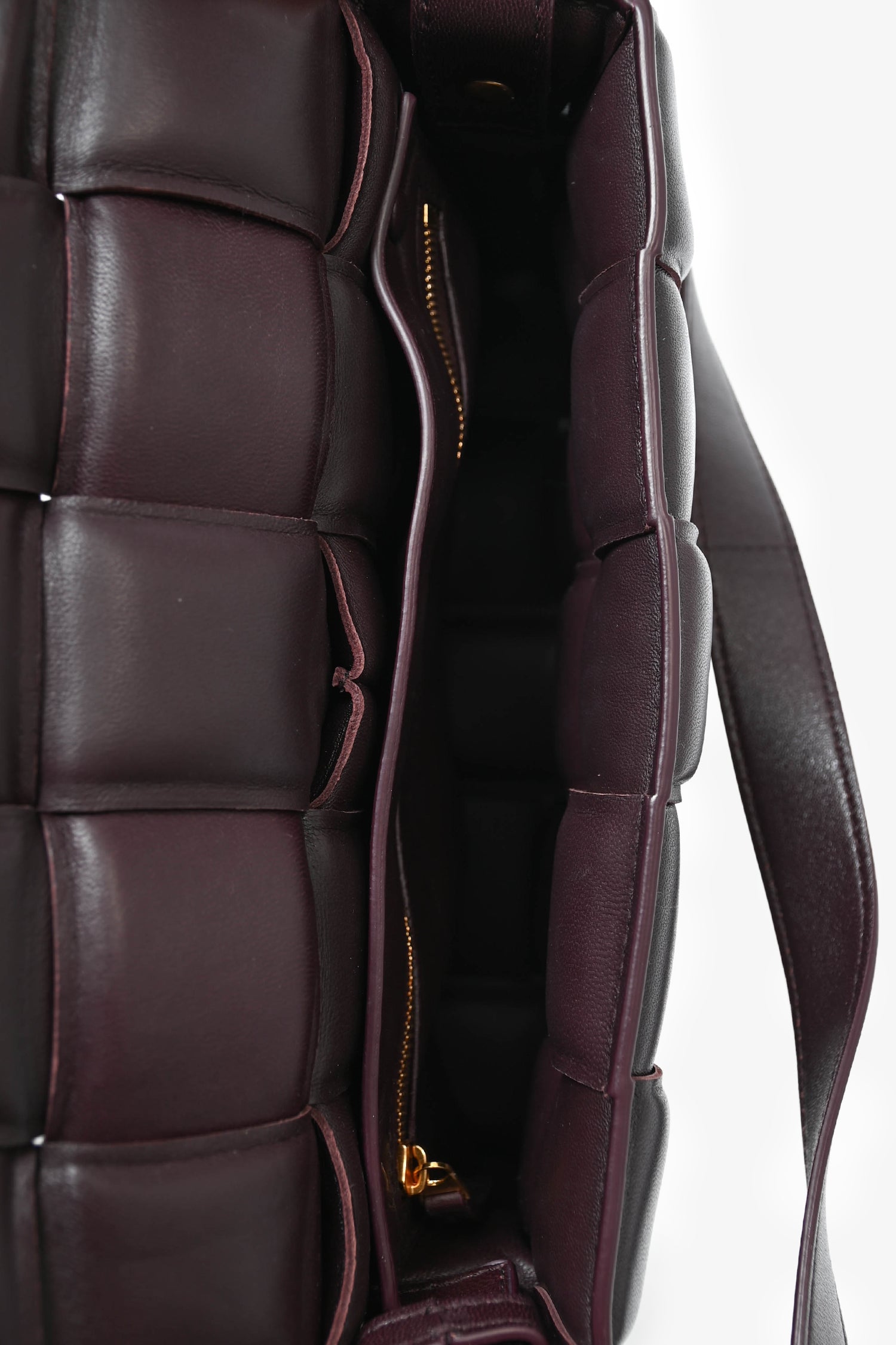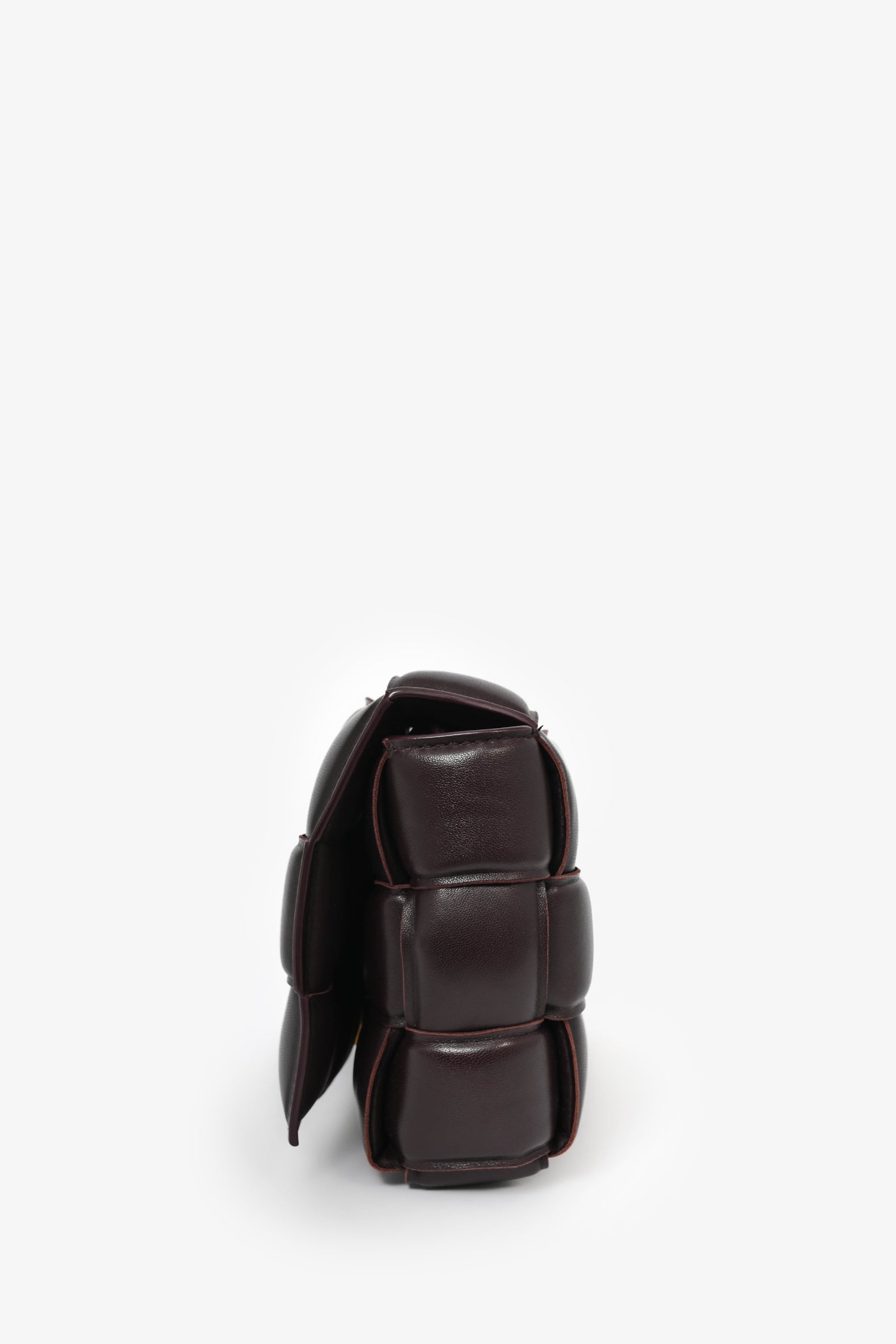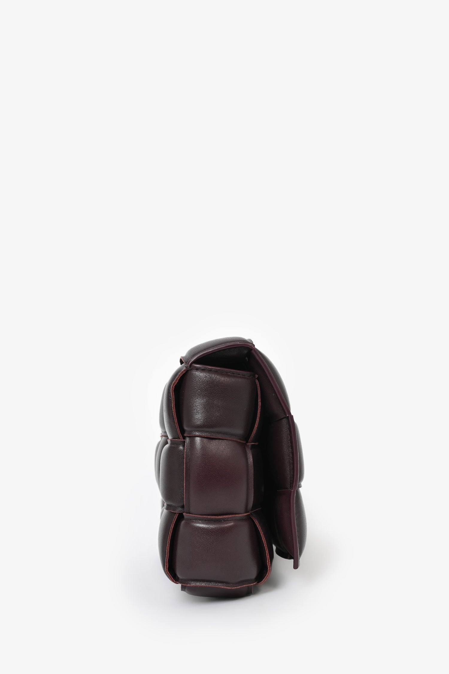 Bottega Veneta Dark Purple Padded Leather Cassette Crossbody Bag. Top flap button closure. Interior pocket with zipper closure. Gold-tone hardware. Tonal stitching.