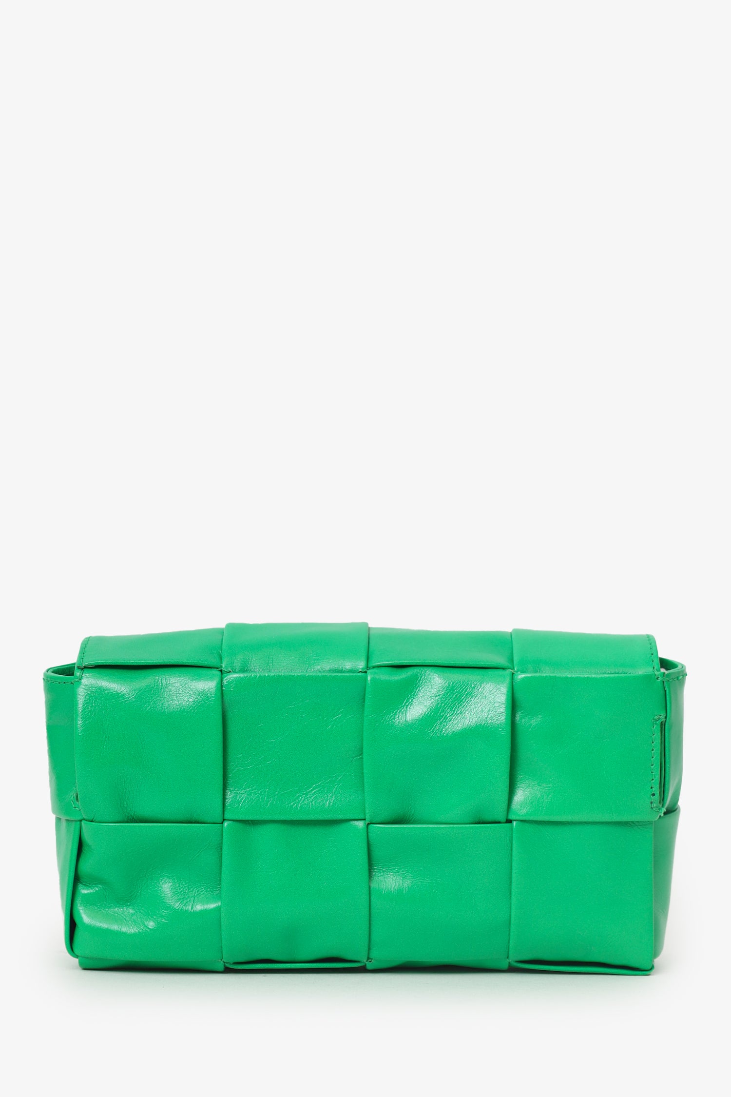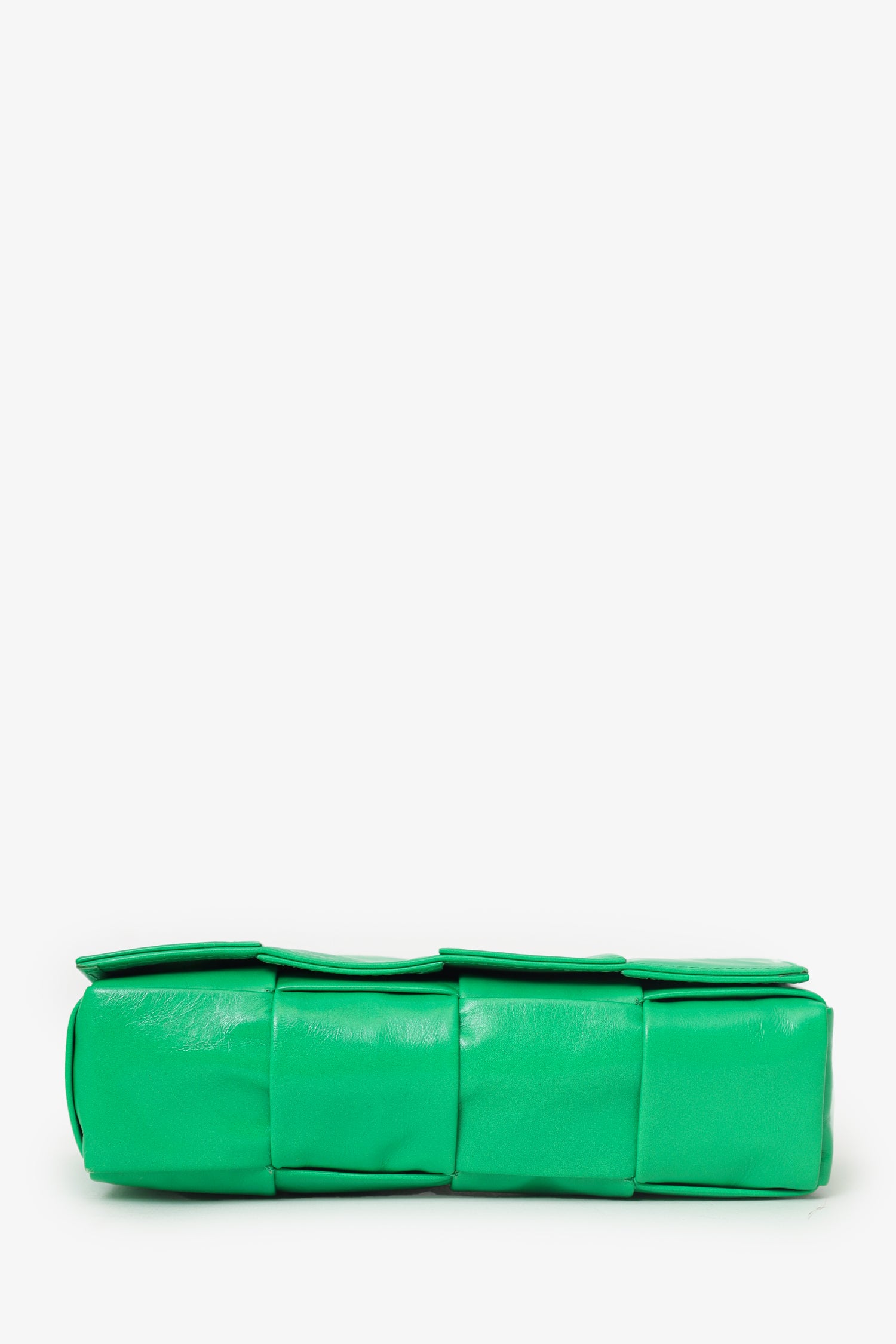Refresh availabilityBottega Veneta Green Leather Cassette Bag. Front fold-over flap with magnetic-snap closure. Adjustable and removable shoulder strap. 2 interior slip pockets. Silver-tone hardware. Tonal stitching.