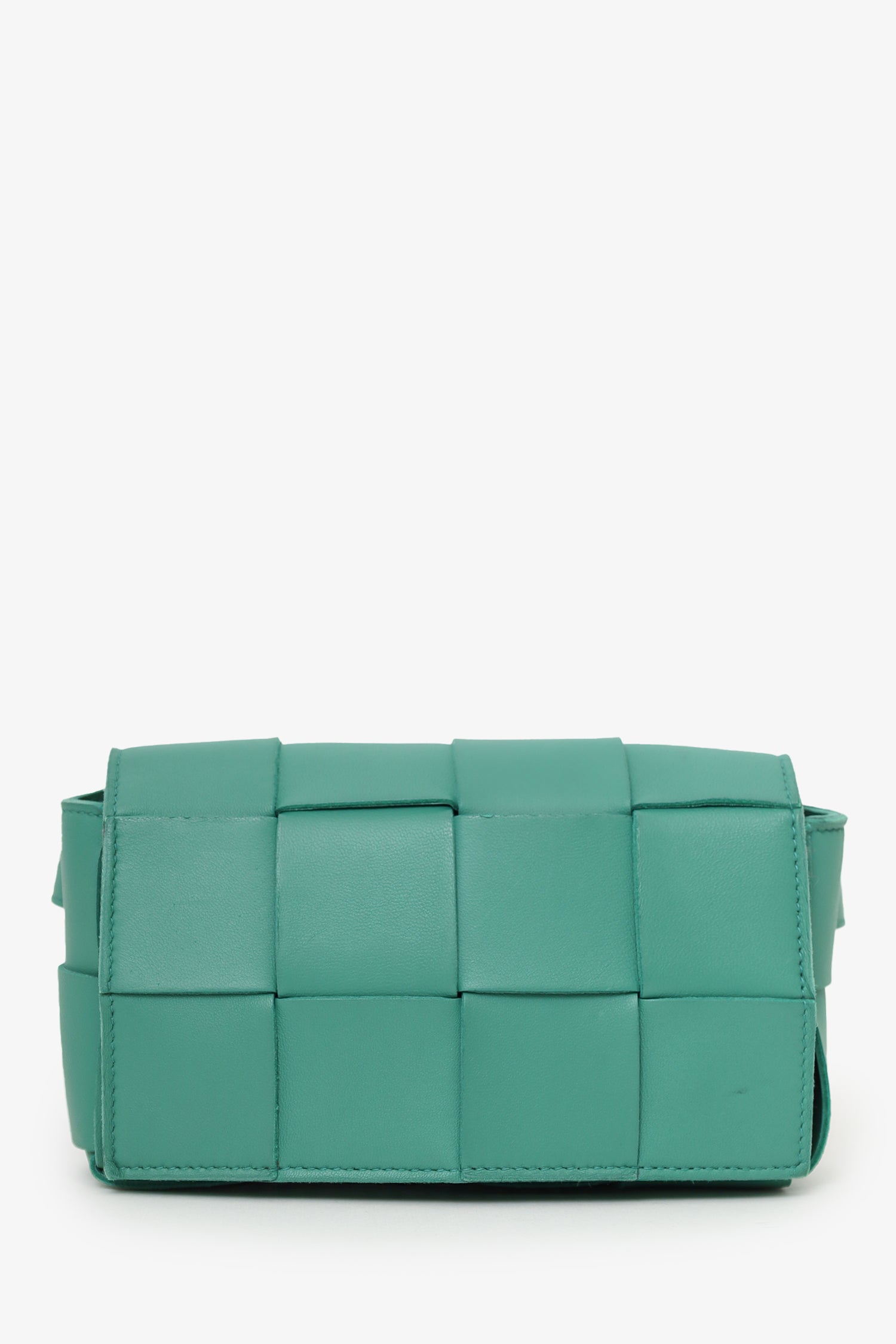 Refresh availabilityBottega Veneta Green Leather Small Cassette Belt Bag. Front fold-over magnetic closure. Belt strap with adjustable push-pin closure. Unlined. 2 interior slip pocket. Gold-tone hardware. Tonal stitching.