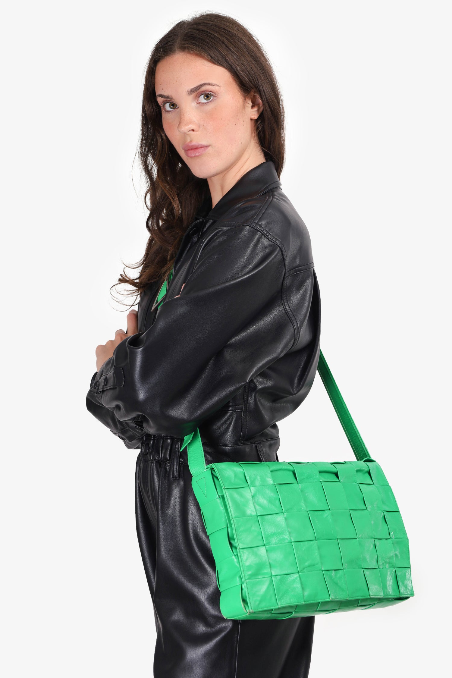 Refresh availabilityBottega Veneta Green Maxi Intrecciato Cassette Crossbody Bag. Front fold over flap with magnetic closure on interior corners. Single interior pouch with zipper closure. Adjustable cross body strap. Silver tone buckle.
