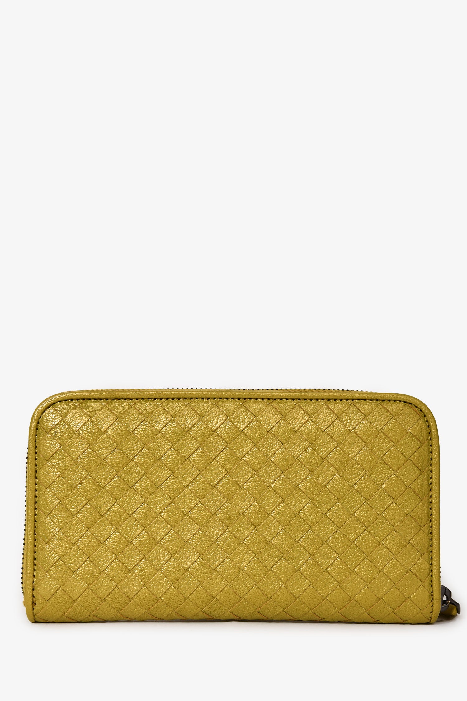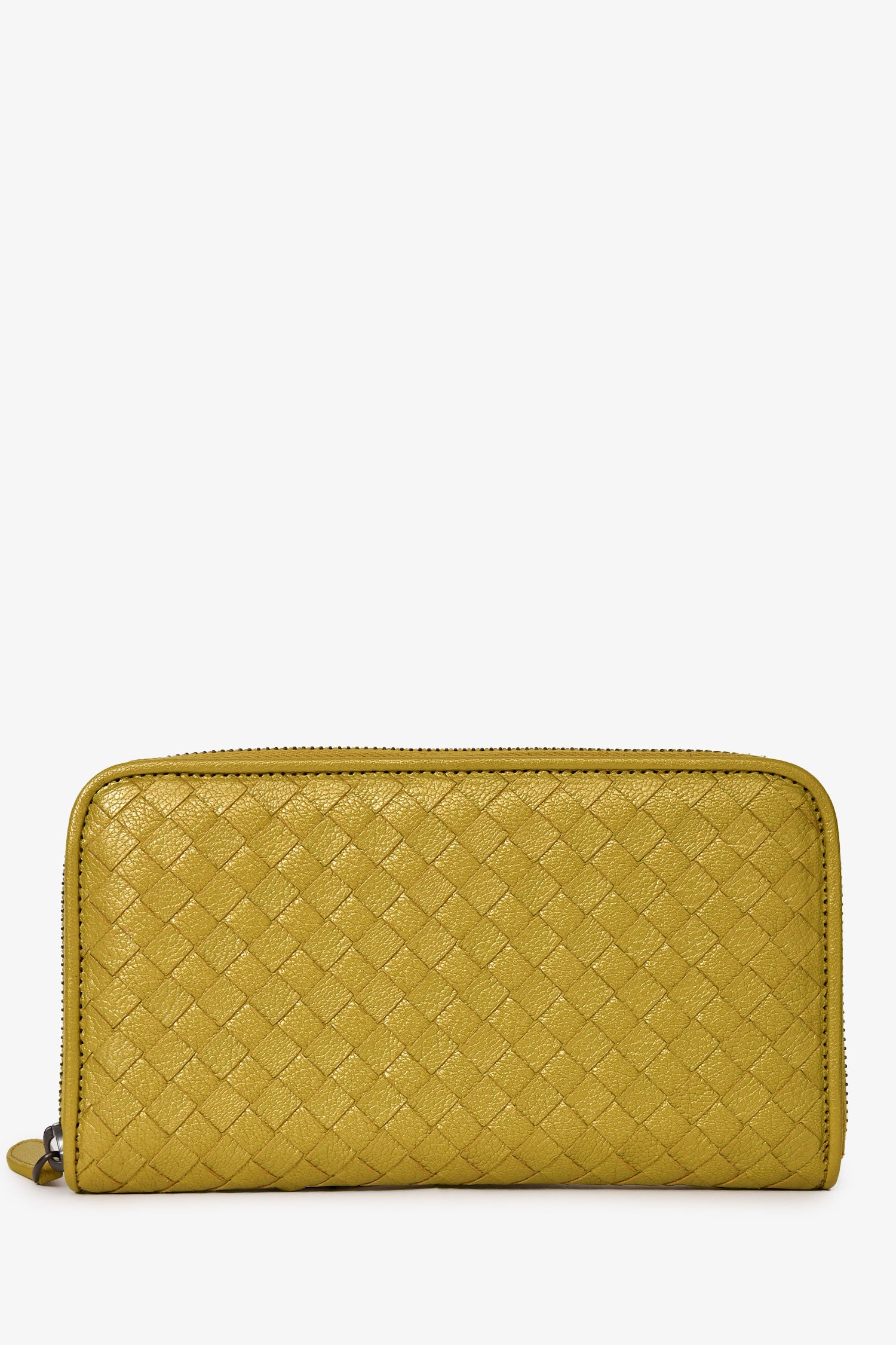 Refresh availabilityBottega Veneta Green Metallic Leather Intrecciato Zip Around Long Wallet. Zip closure. 4 interior slip compartments. Single interior zip compartment. 8 interior cards slots. Silver-toned hardware. Tonal stitching.