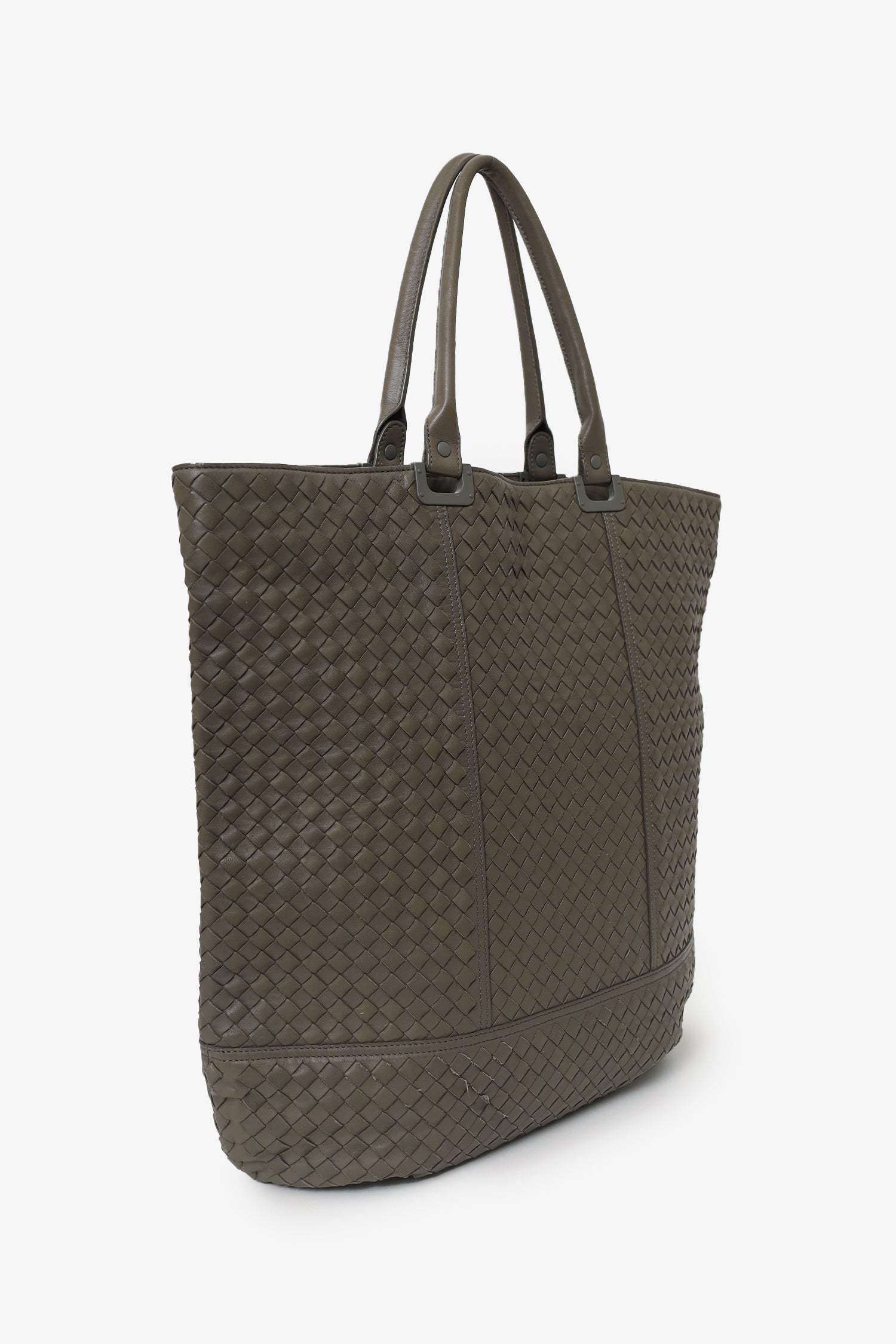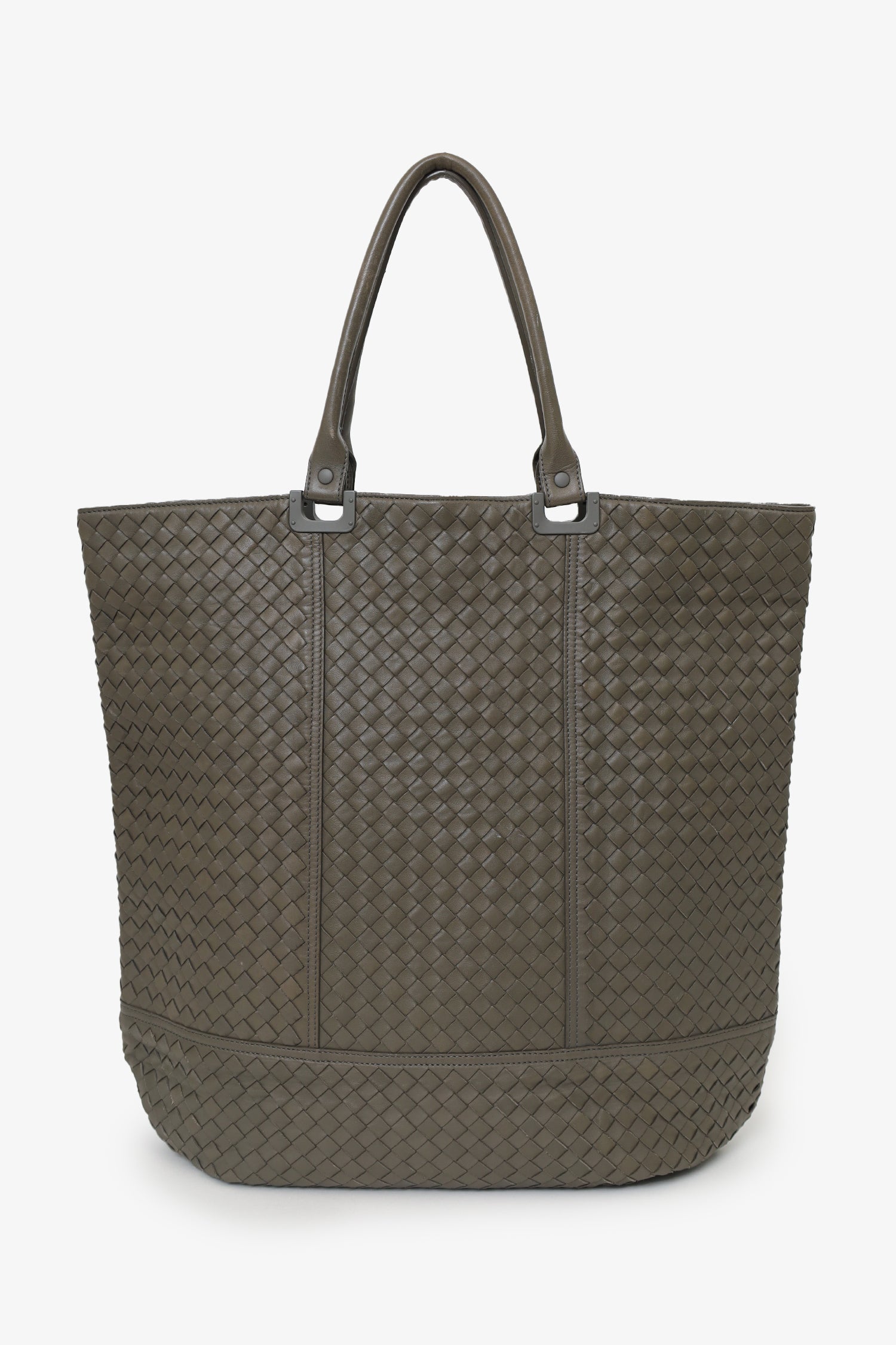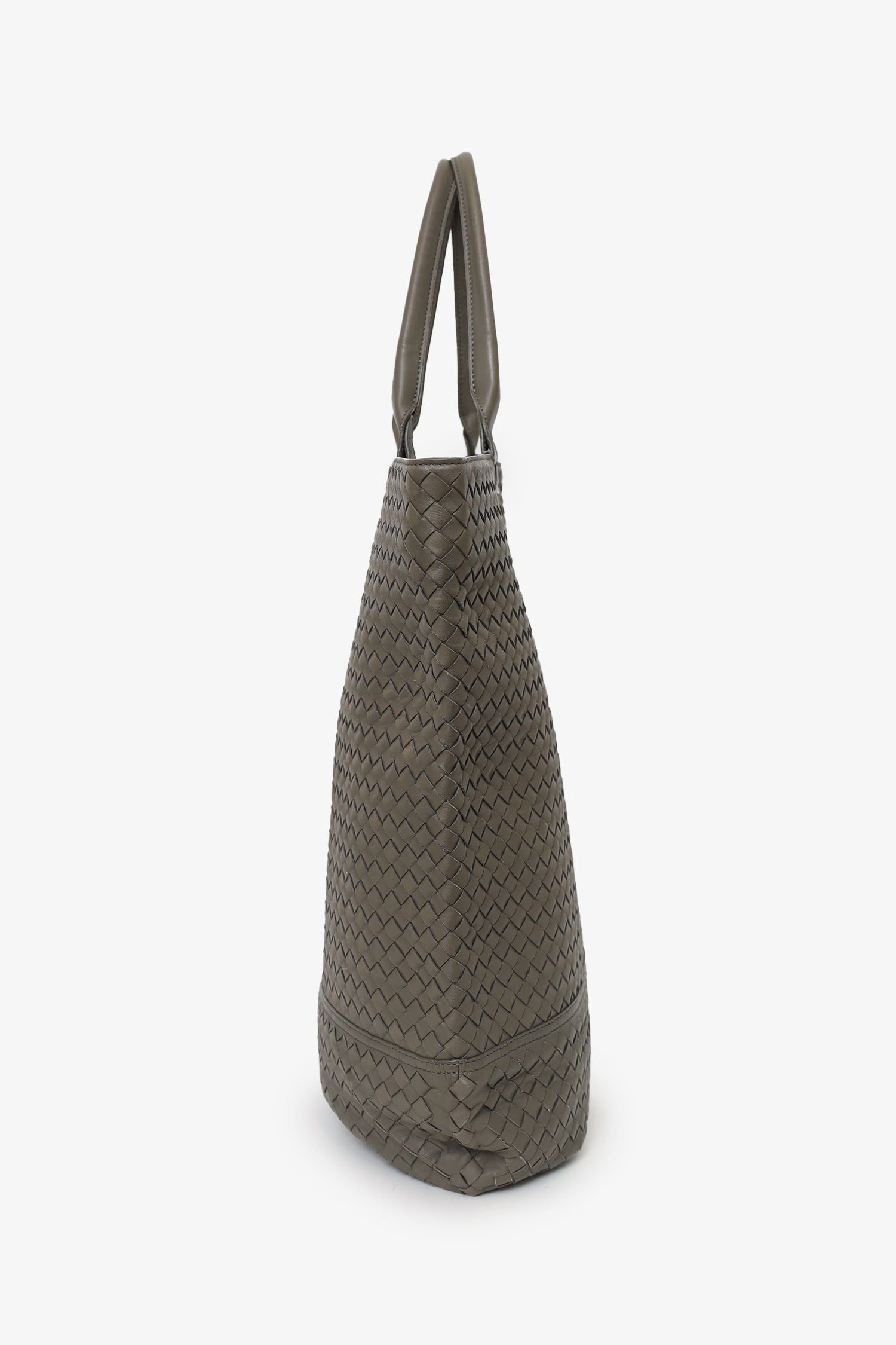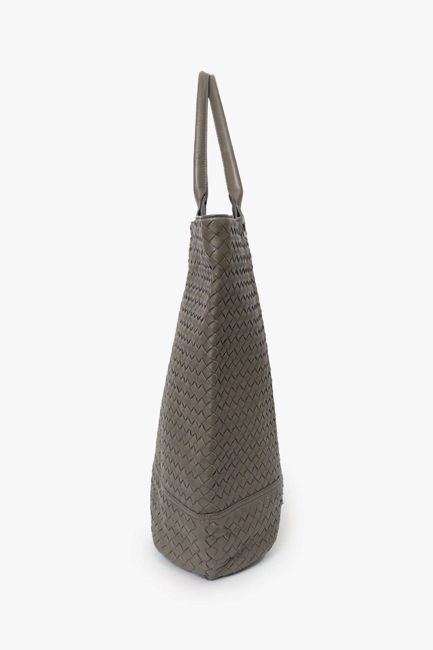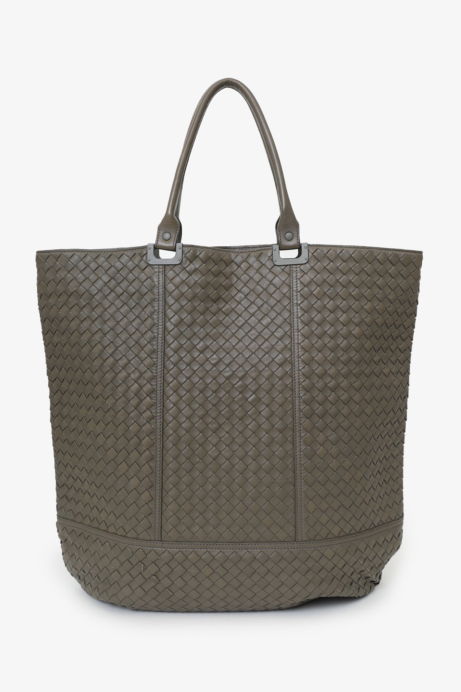 Refresh availabilityBottega Veneta Grey Intrecciato Woven Nappa Leather Shopper Tote Bag. Top zip closure. Top twin handles. Suede interior lining. Palladium-tone hardware. Tonal stitching.