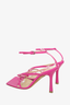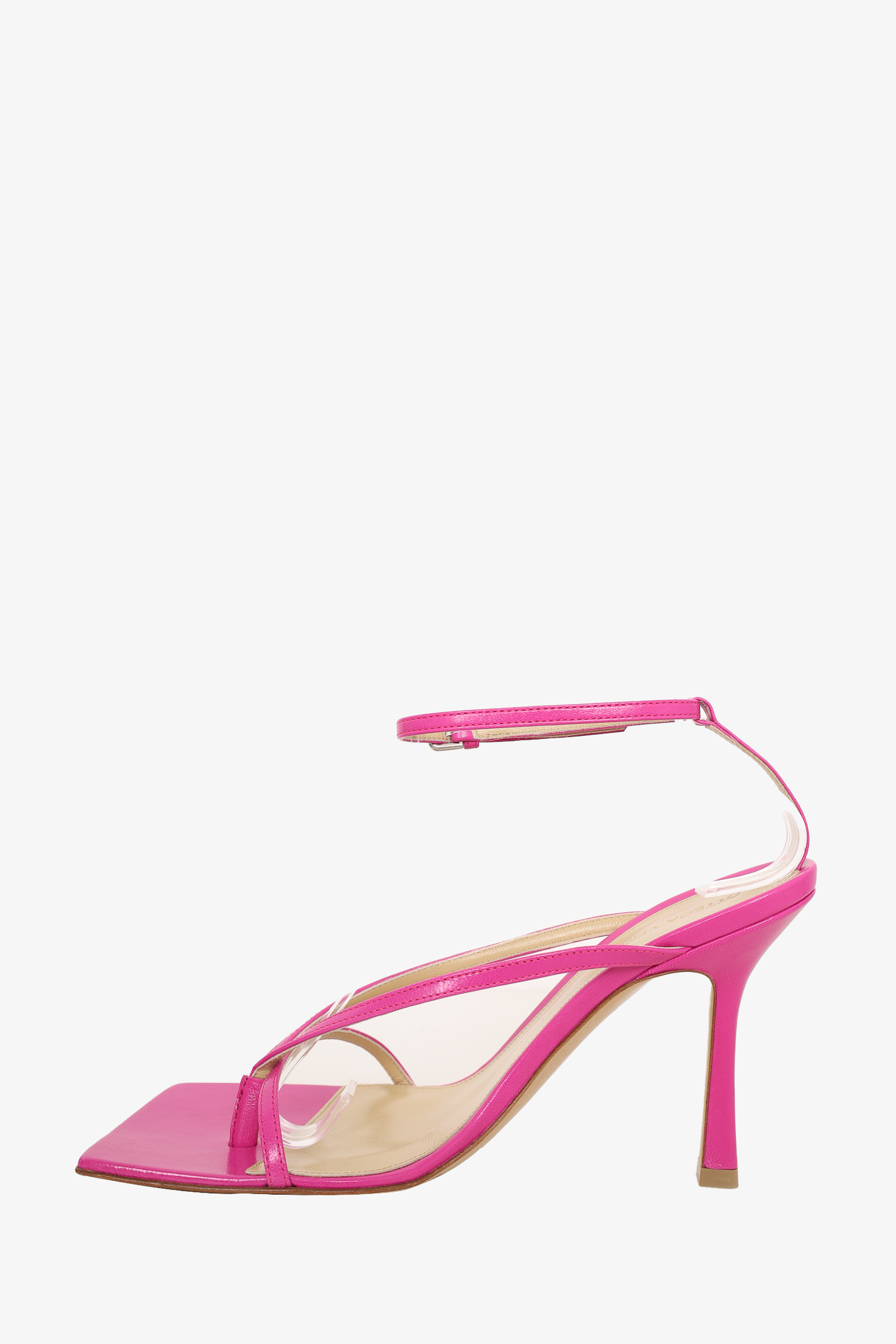 Refresh availabilityBottega Veneta Pink Leather Stretch Strap Sandal. Square-toe. Ankle strap with buckle closure. Tonal stitching. Comes with box.