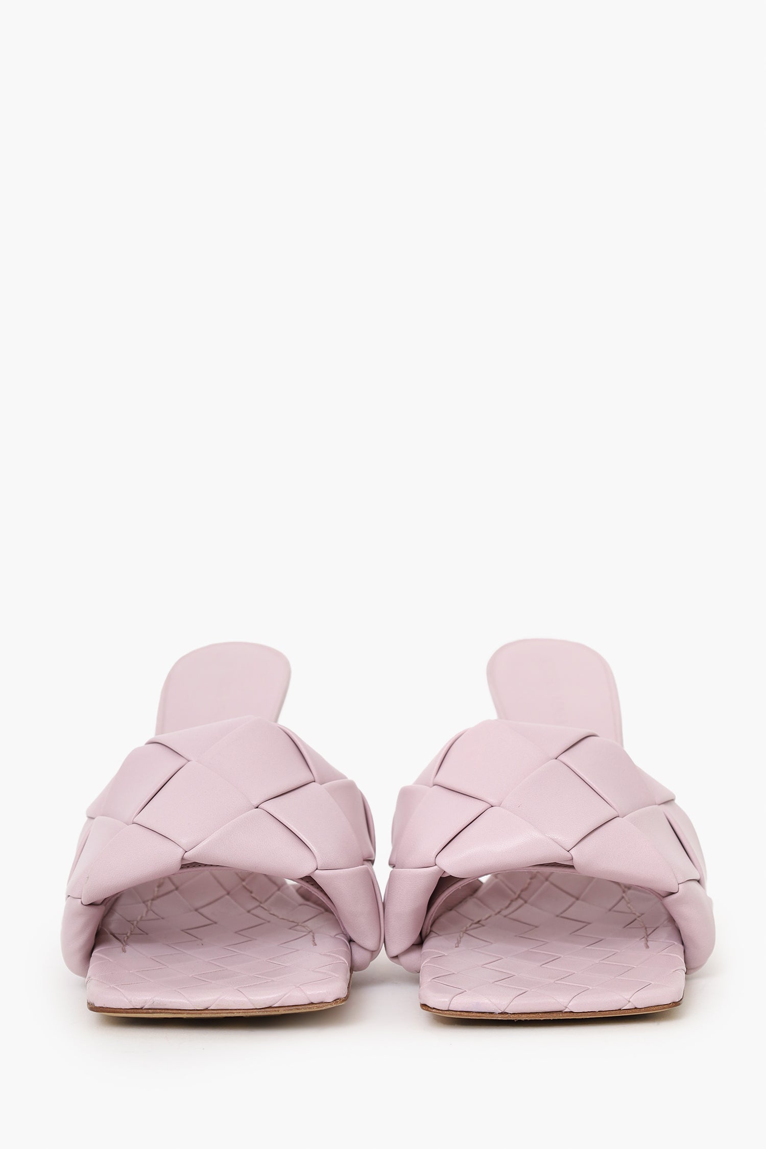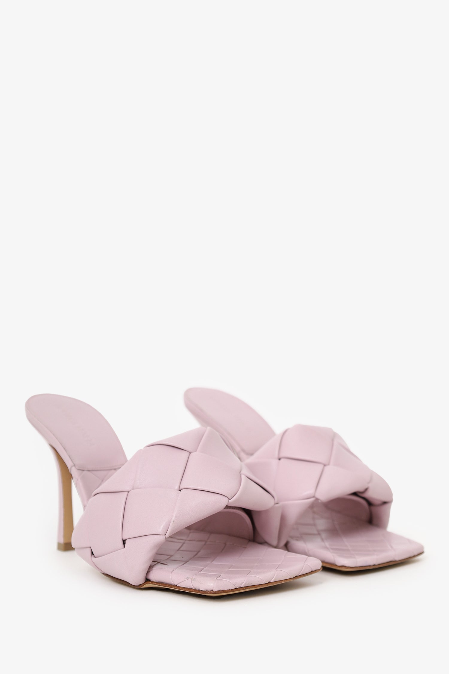 Refresh availabilityBottega Veneta Pink Padded Intrecciato Heeled Sandal. Slip-on. Square toe. Tonal stitching.
