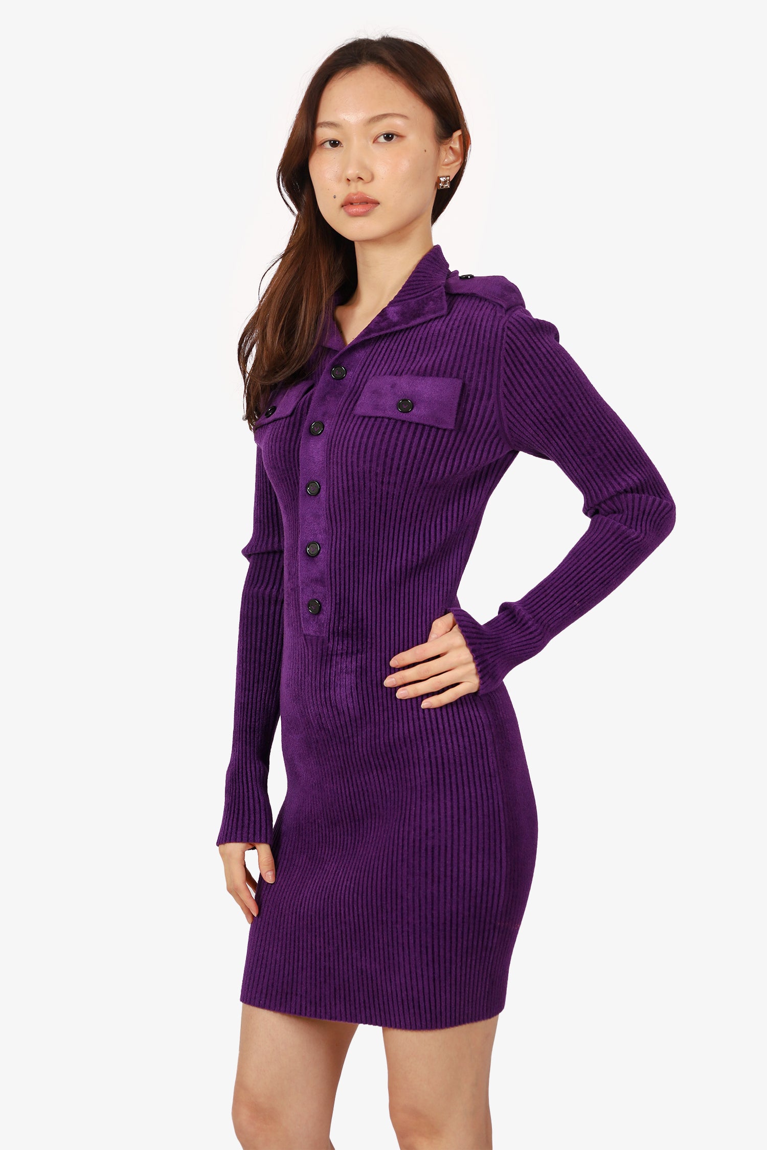 Refresh availabilityBottega Veneta Purple Ribbed Long-Sleeve Dress Estimated. Pull-on. Collared v-neckline. Front button-up closure. 2 front sealed pockets with button detail. Tonal stitching.
