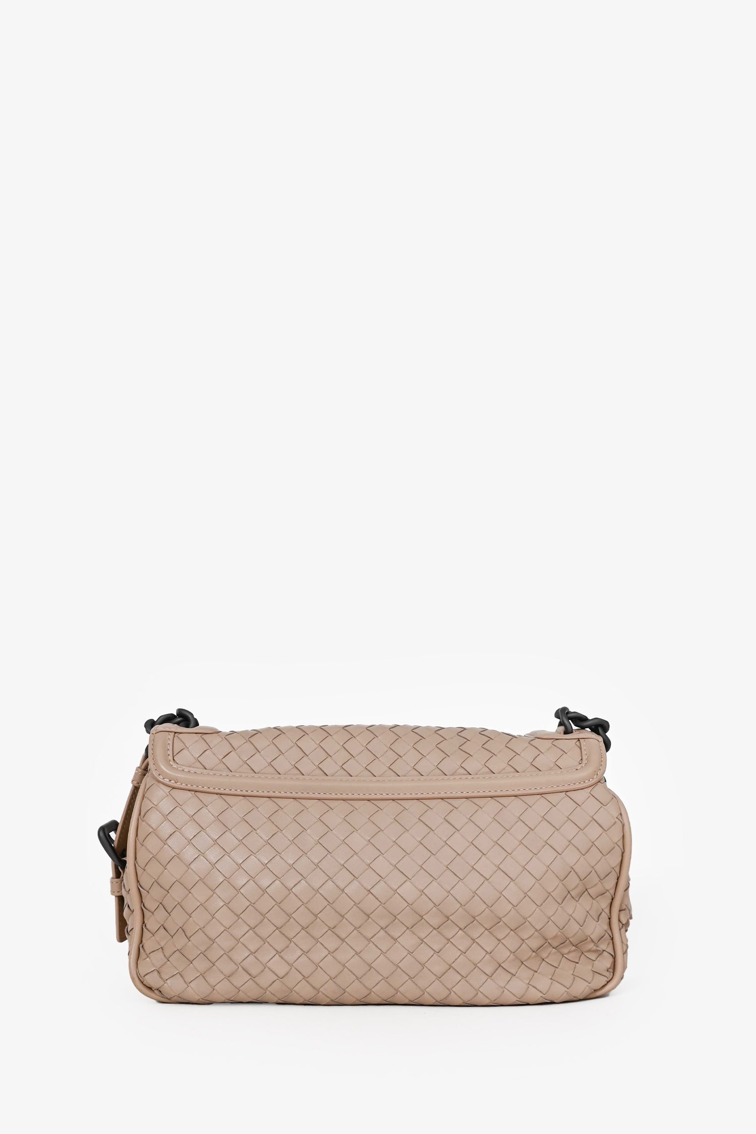 Refresh availabilityBottega Veneta Taupe Monalisa Intrecciato Nappa Rialto Bag. Front fold-over flap with slide-flap closure. Dark taupe suede interior lining. Single interior wall zip pocket. Adjustable strap. Grey-tone hardware.
