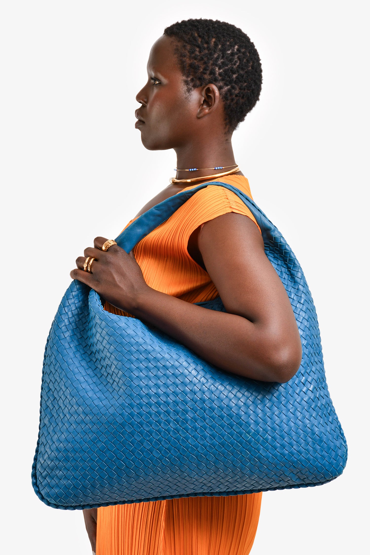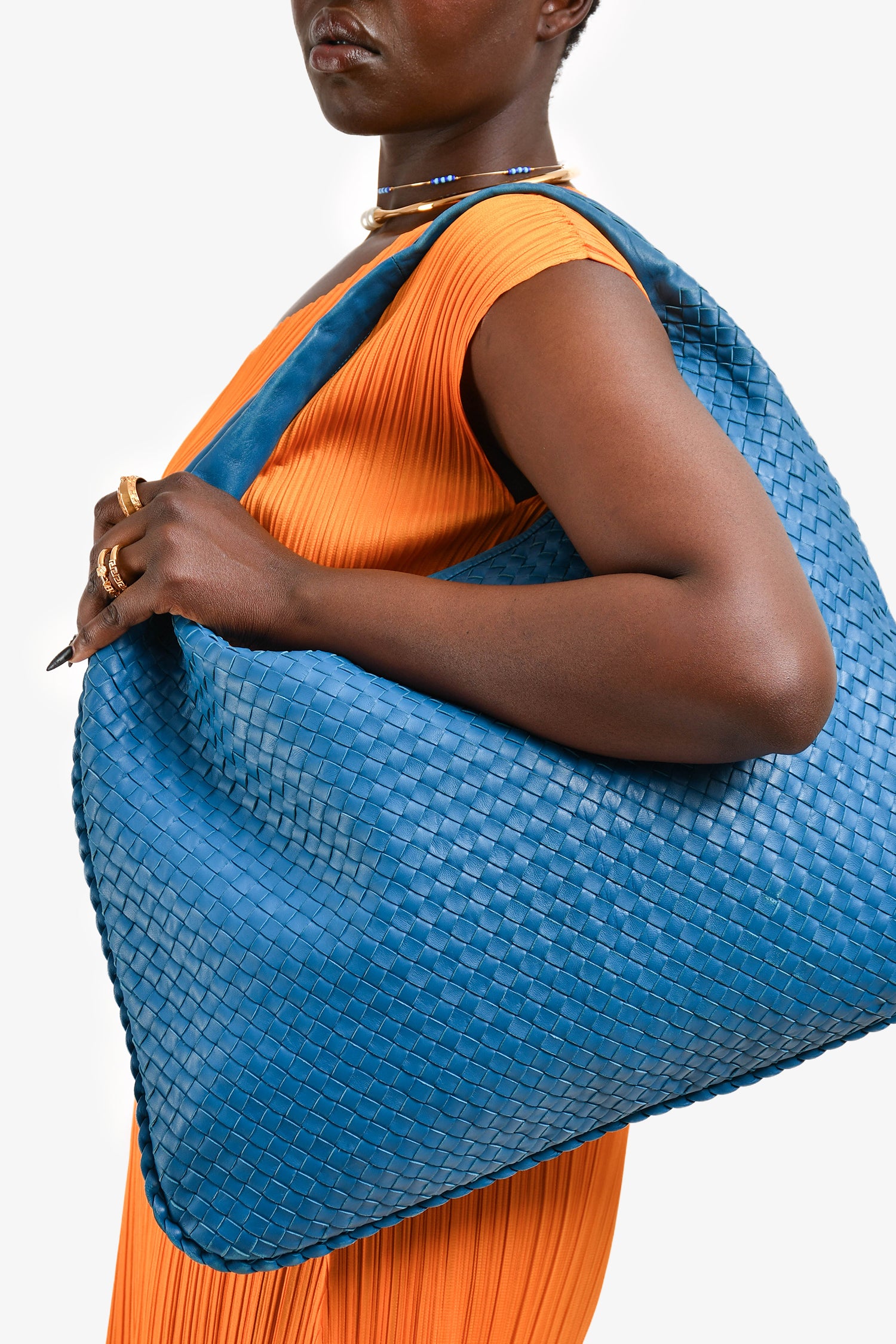 Refresh availabilityBottega Veneta Teal Leather Extra Large Intrecciato Shoulder Bag. Single shoulder strap. Top zip closure. Suede-lined interior with zip and slip pockets. Tonal stitching.