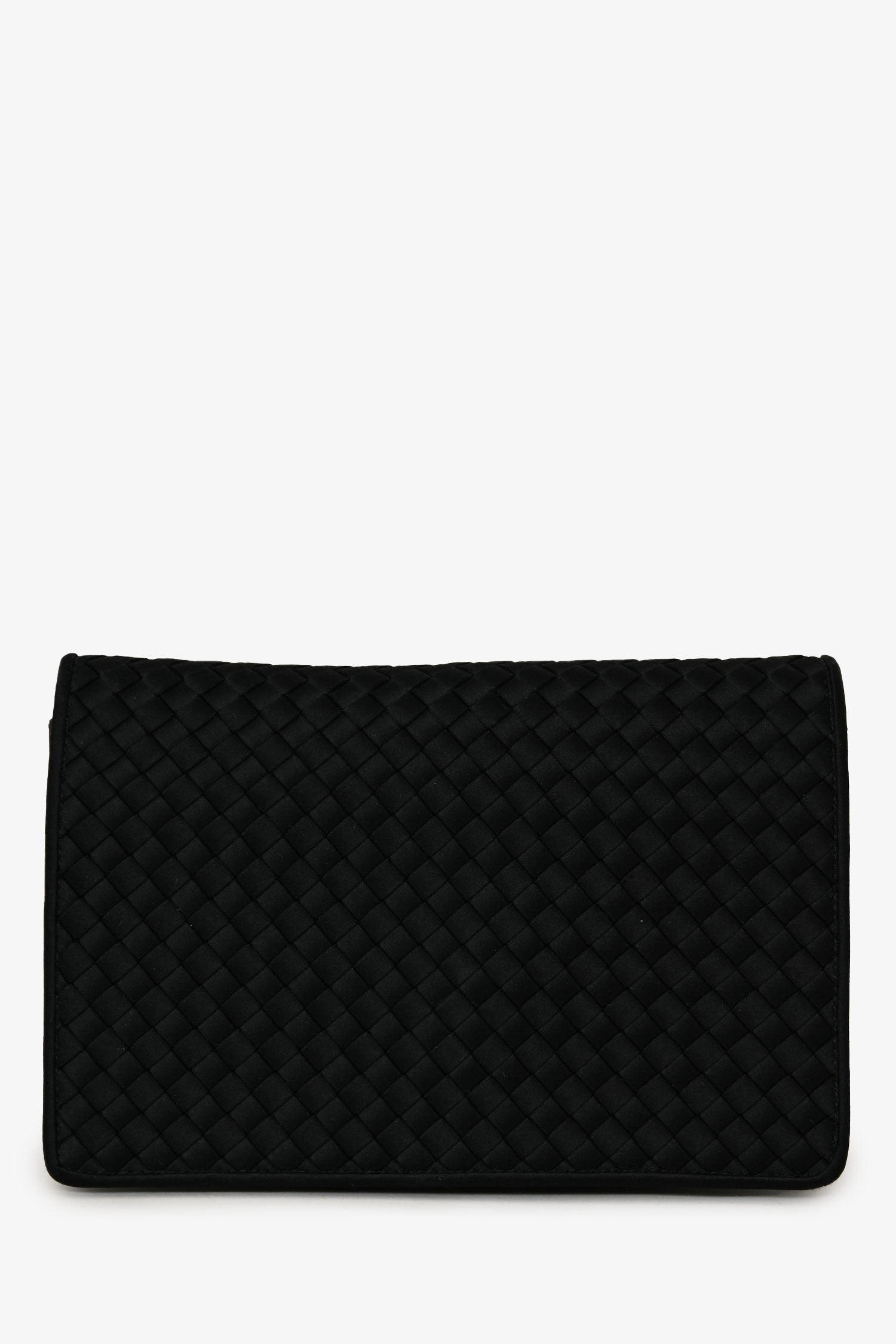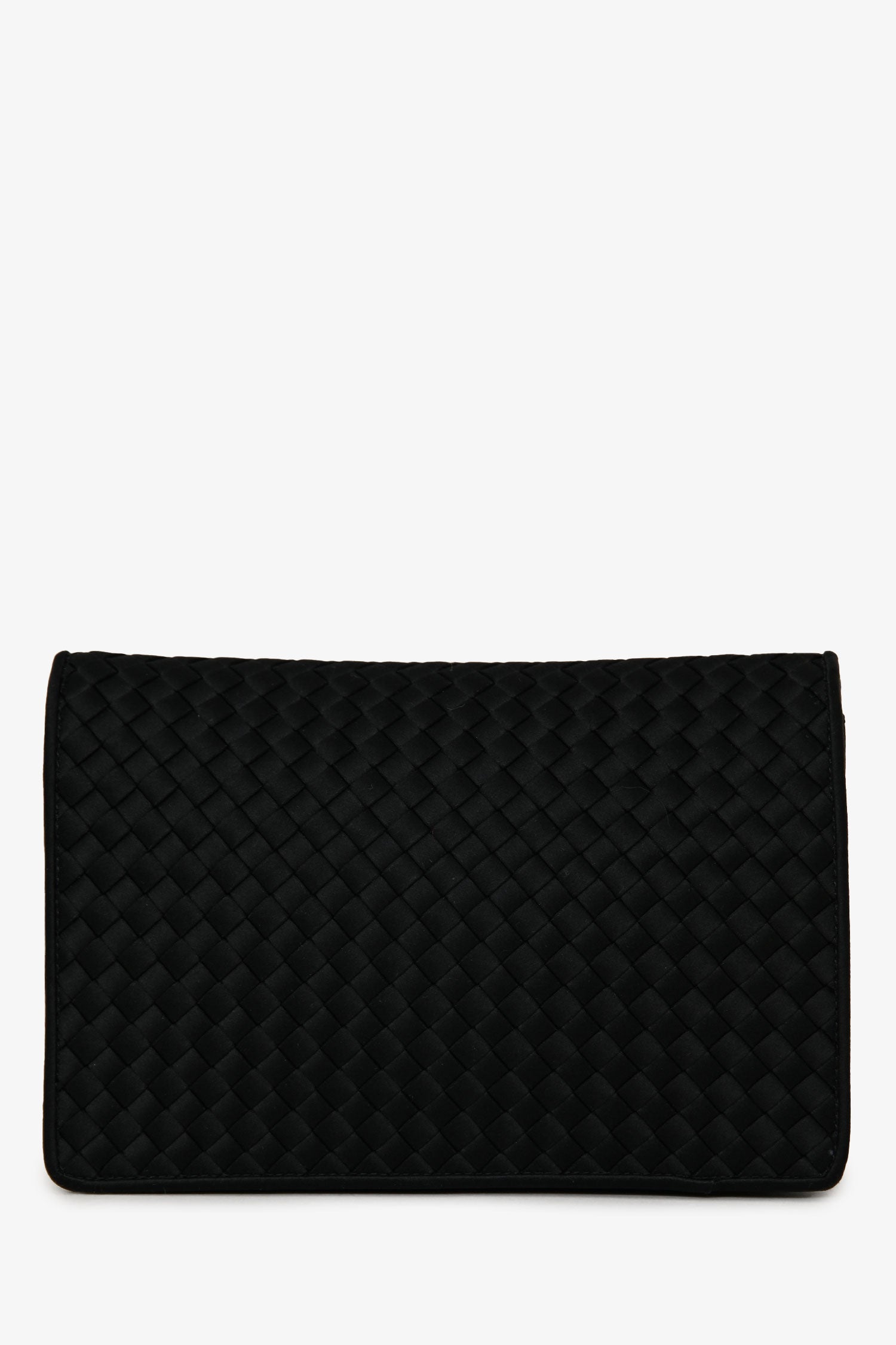 Refresh availabilityBottega Veneta Vintage Black Satin Intrecciato Clutch with Strap. Front fold-over flap with magnetic button closure. Open interior. Single interior wall slip pocket. Tonal stitching.