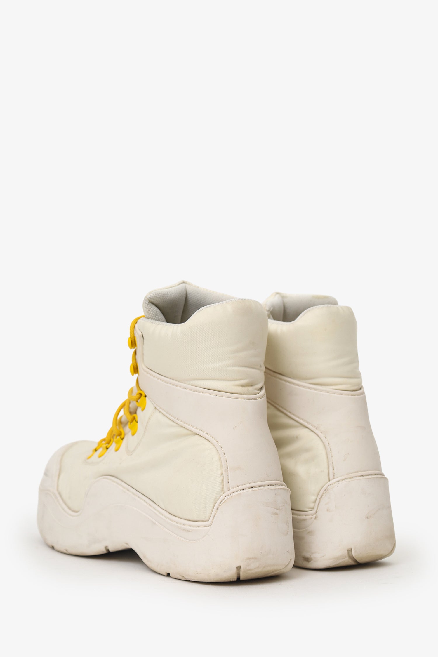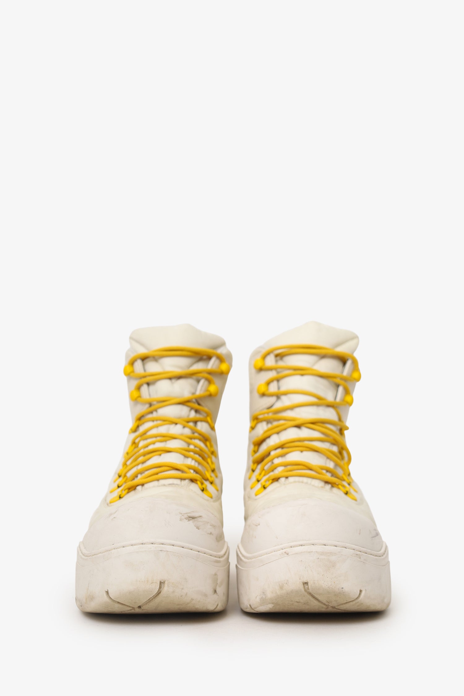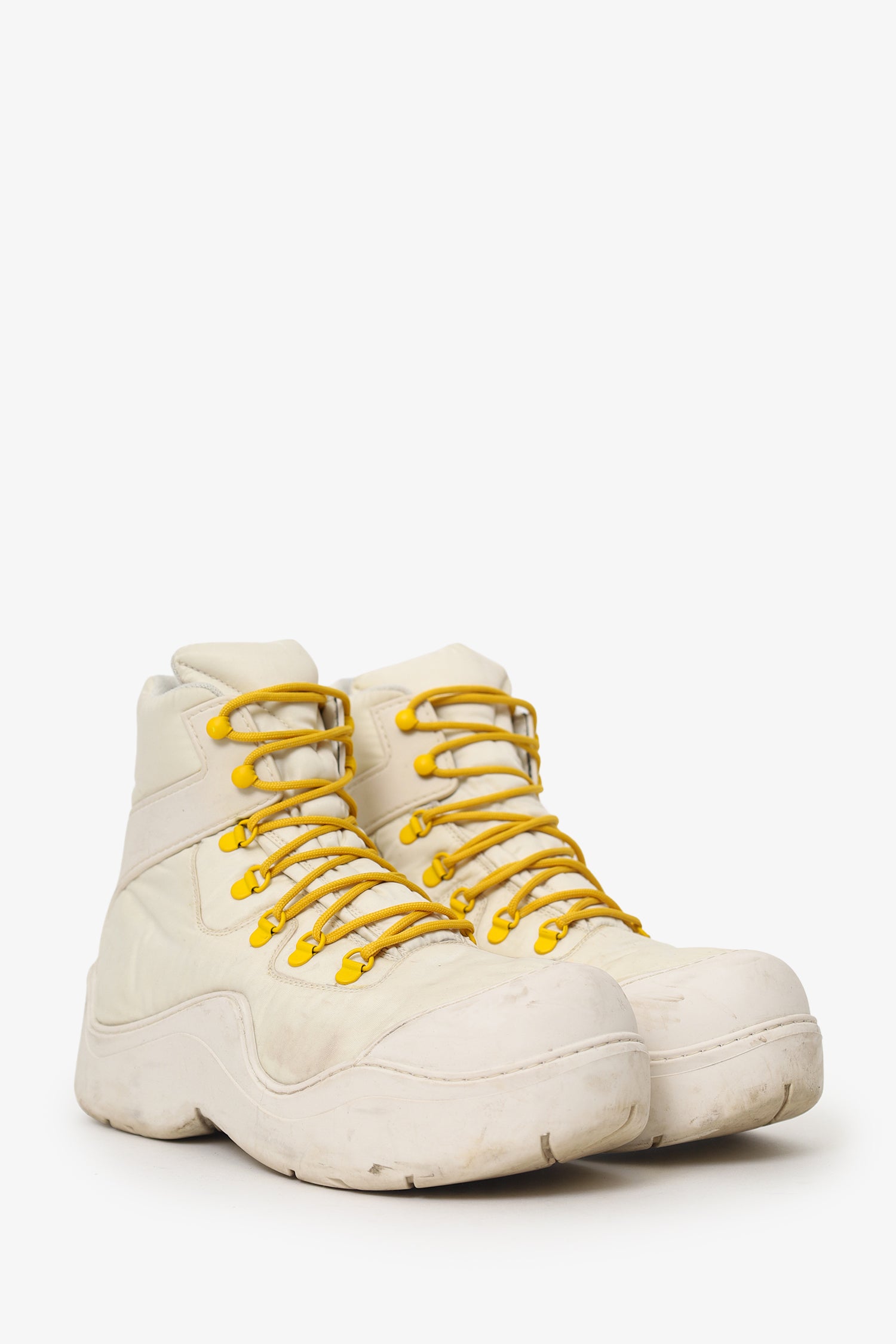Refresh availabilityBottega Veneta White/Yellow Lace Up Combat Boots. Pull-on. Round toe. Front lace-up with hook closure. Tonal stitching.