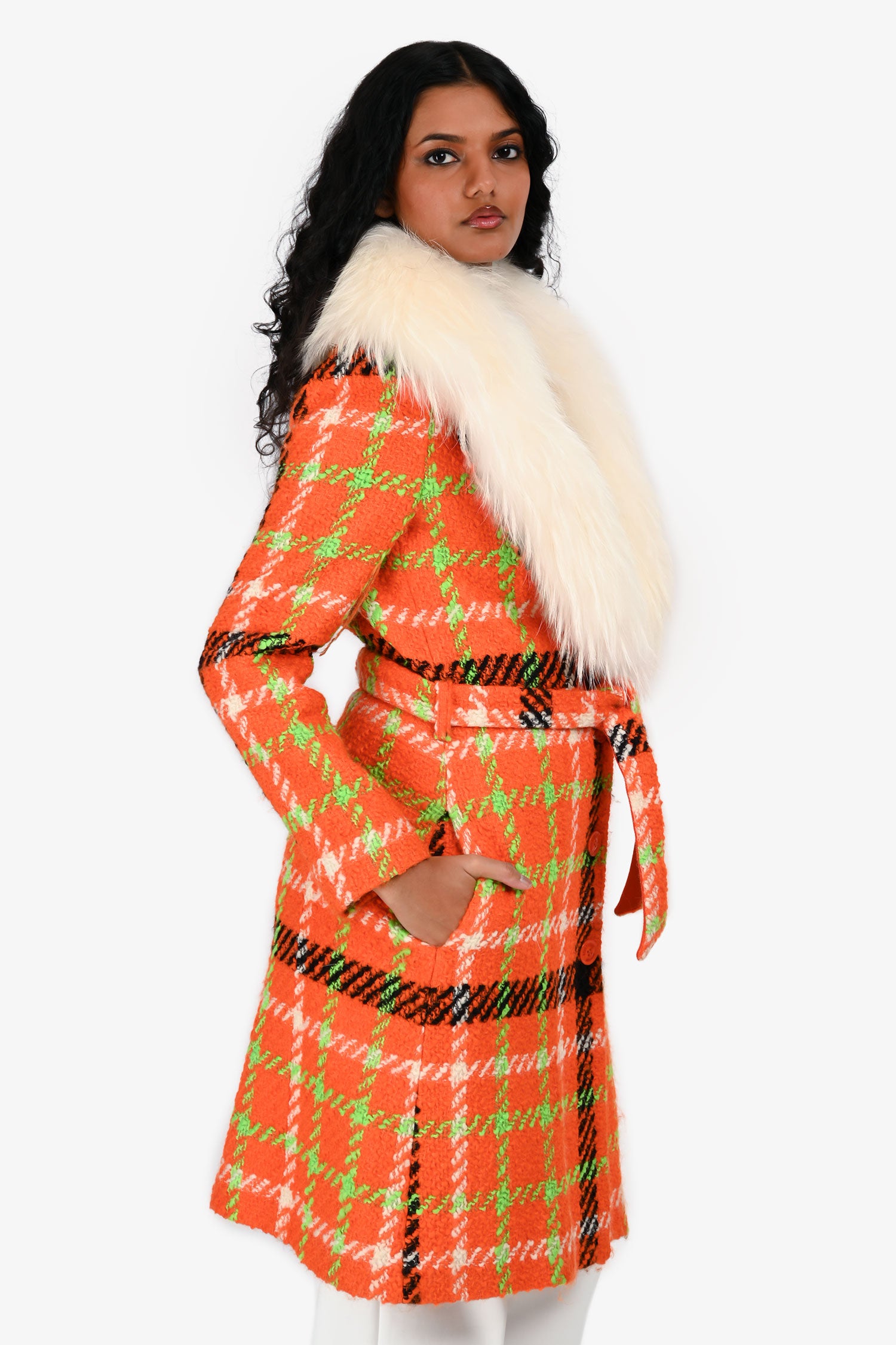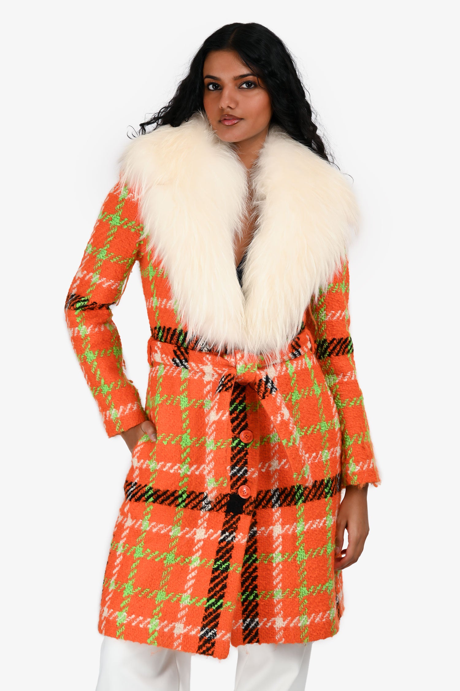 Refresh availabilityBoutique Moschino Orange/White Wool Tartan Detachable Fur Collar Coat. Slip-on. Front button-up closure. Waist belt closure. 2 front slip pockets. Lined interior. Tonal stitching.