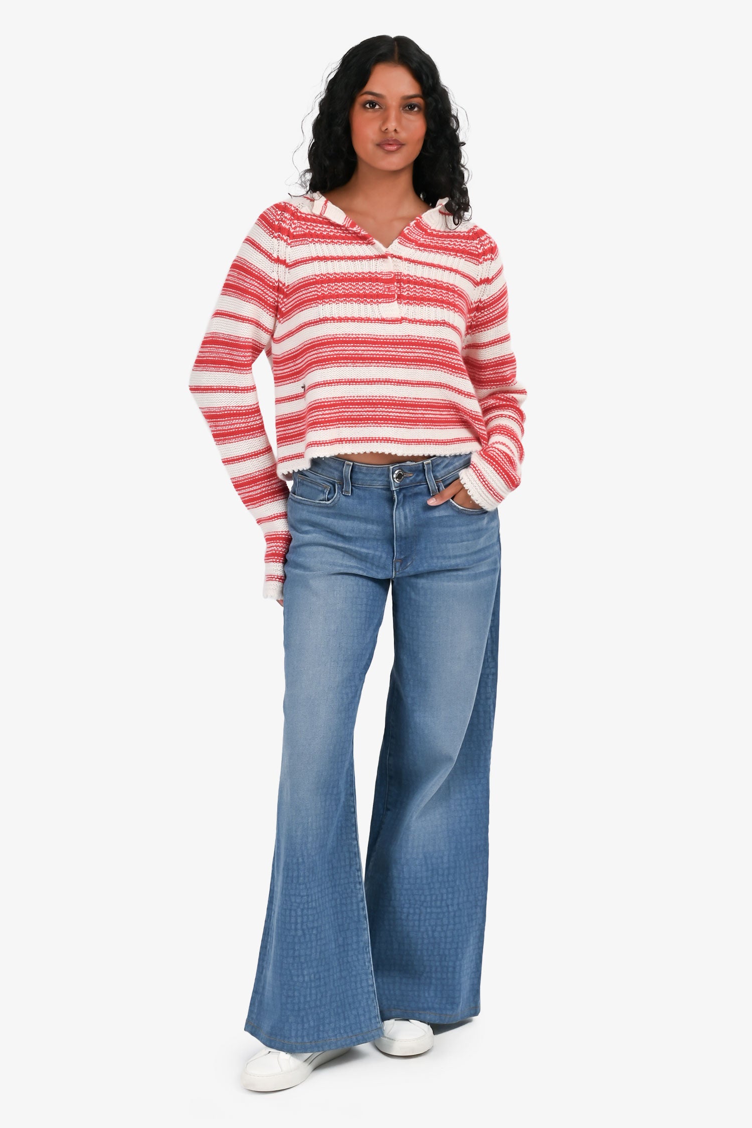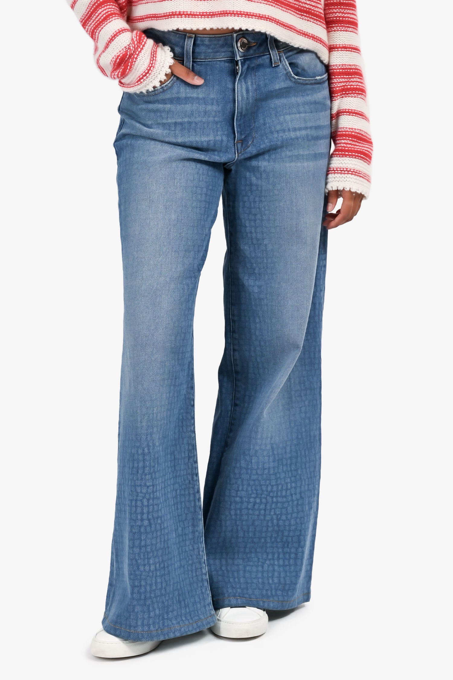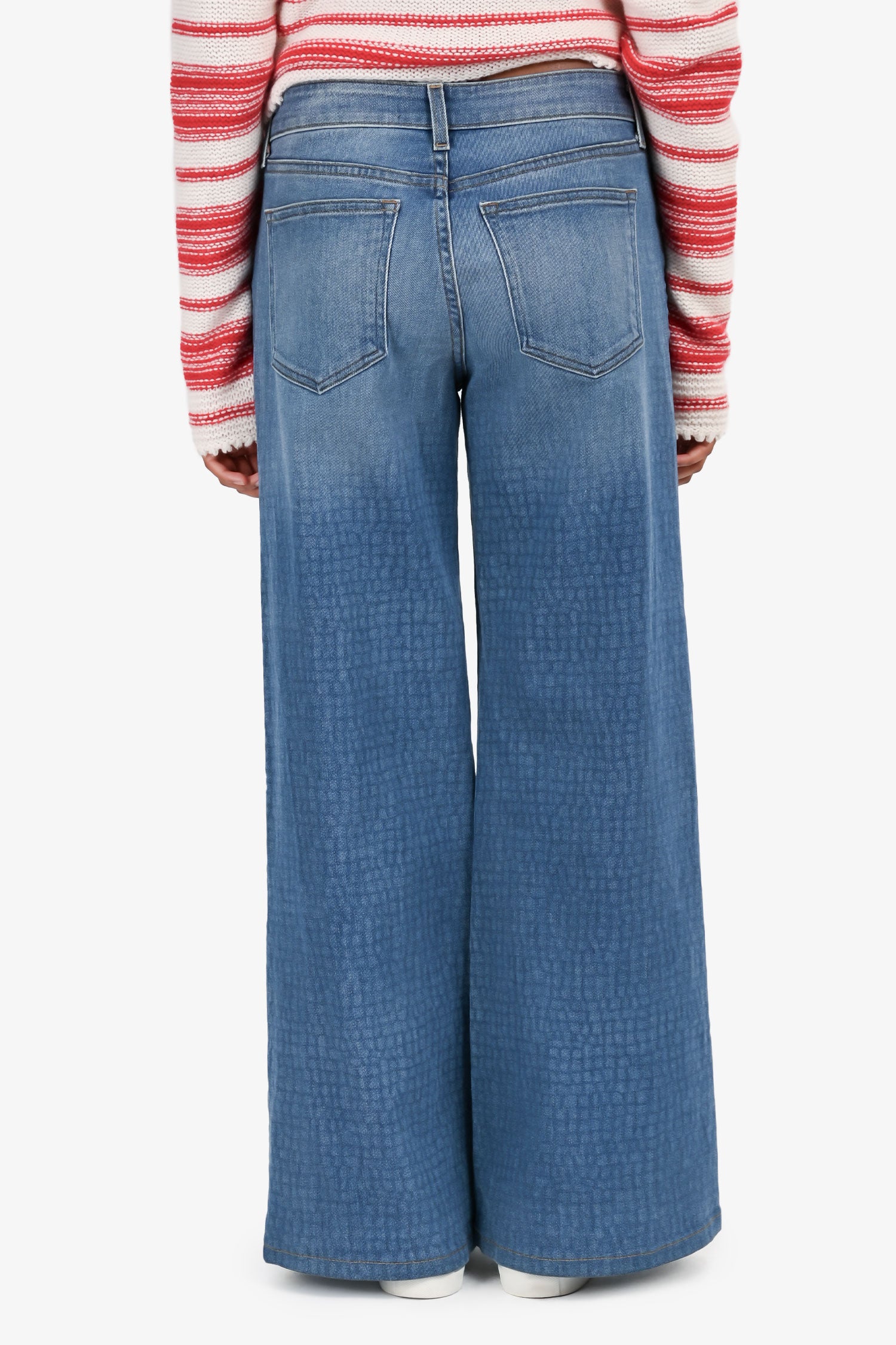 Refresh availabilityBrandon Maxwell Blue Denim Wide Legged Jeans. Zip fly with button closure. Classic five-pocket styling. Wide leg silhouette. Medium blue wash with subtle fading. Tonal stitching.