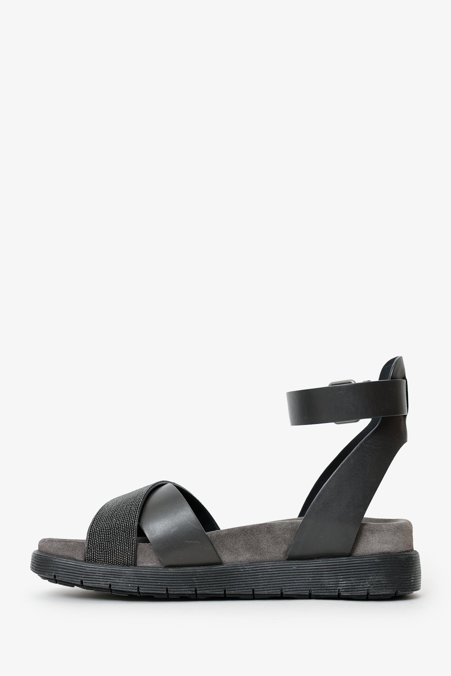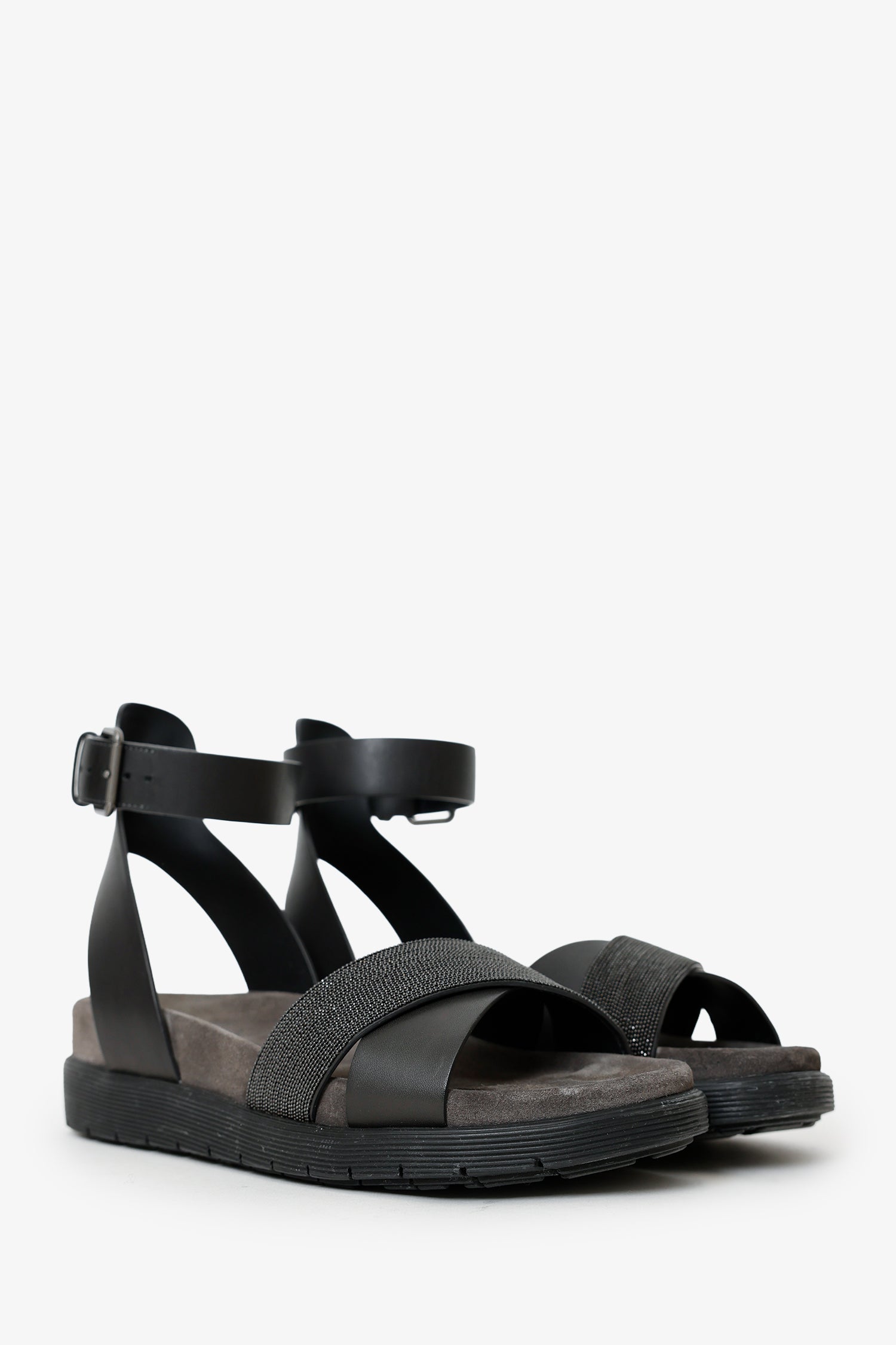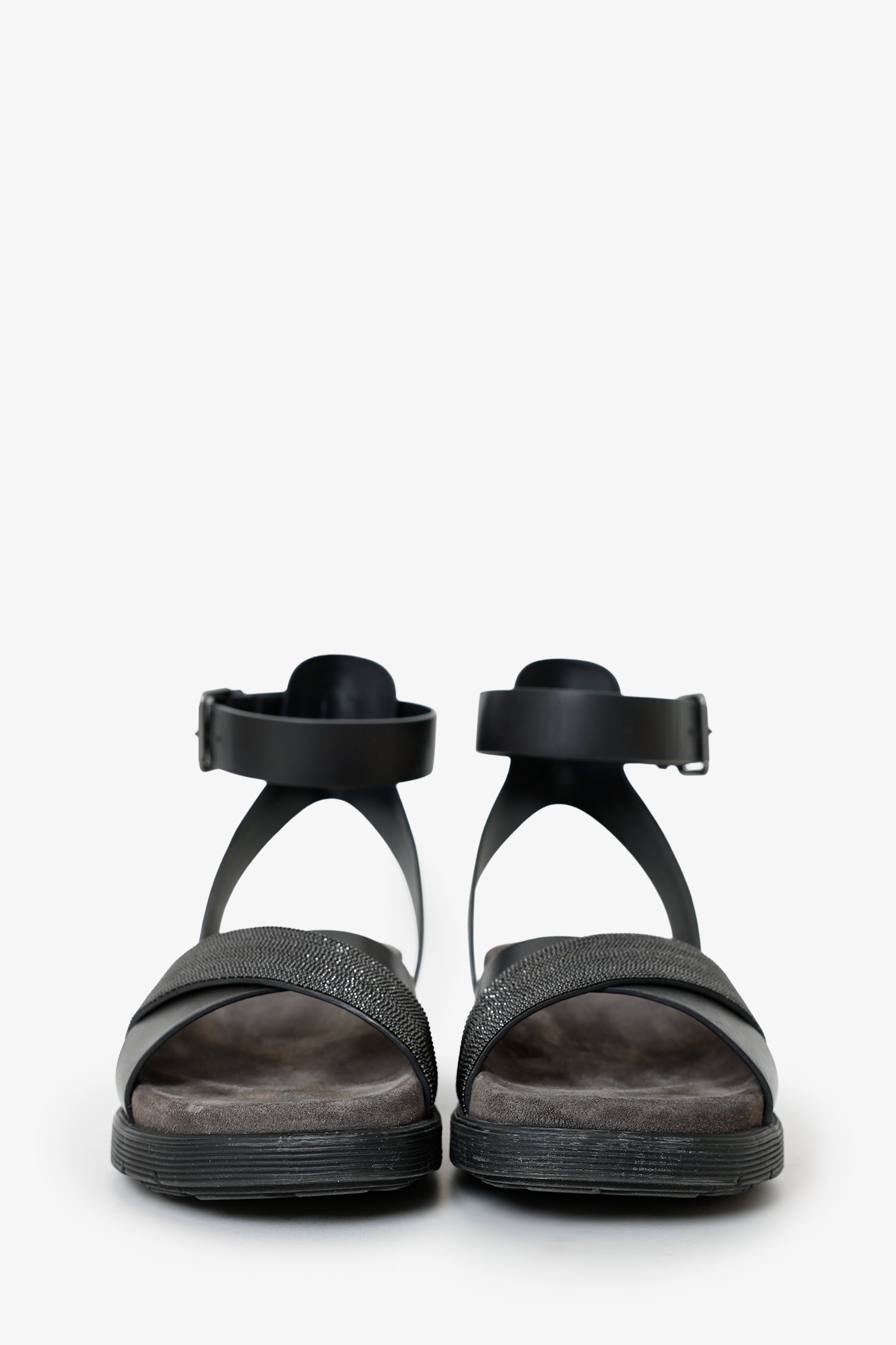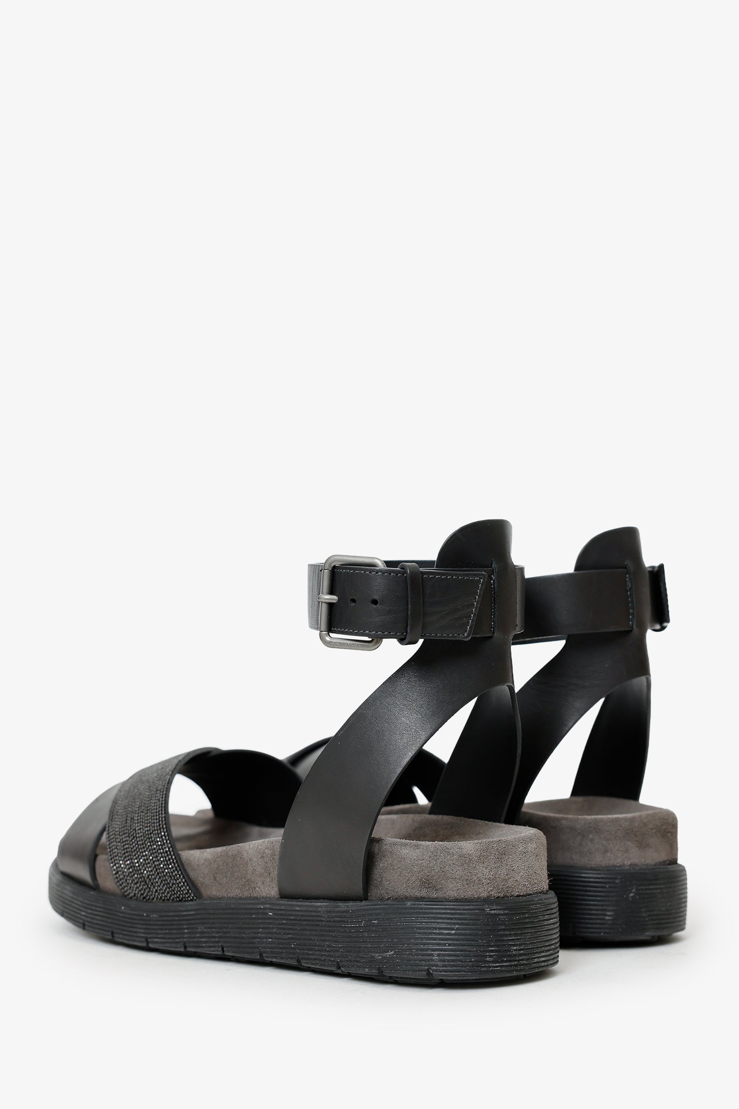 Refresh availabilityBrunello Black Leather Beaded Accent Sandals. Round toe. Adjustable ankle strap with pull-through buckle closure. Lined interior. Gunmetal-tone hardware. Tonal stitching.
