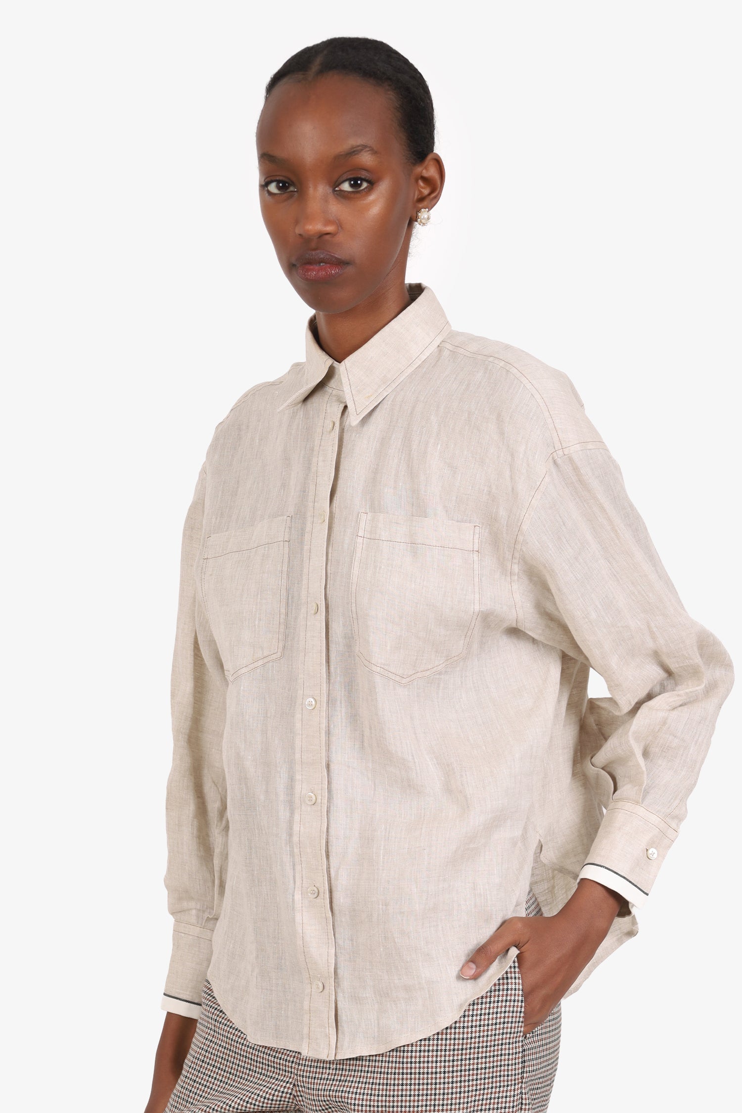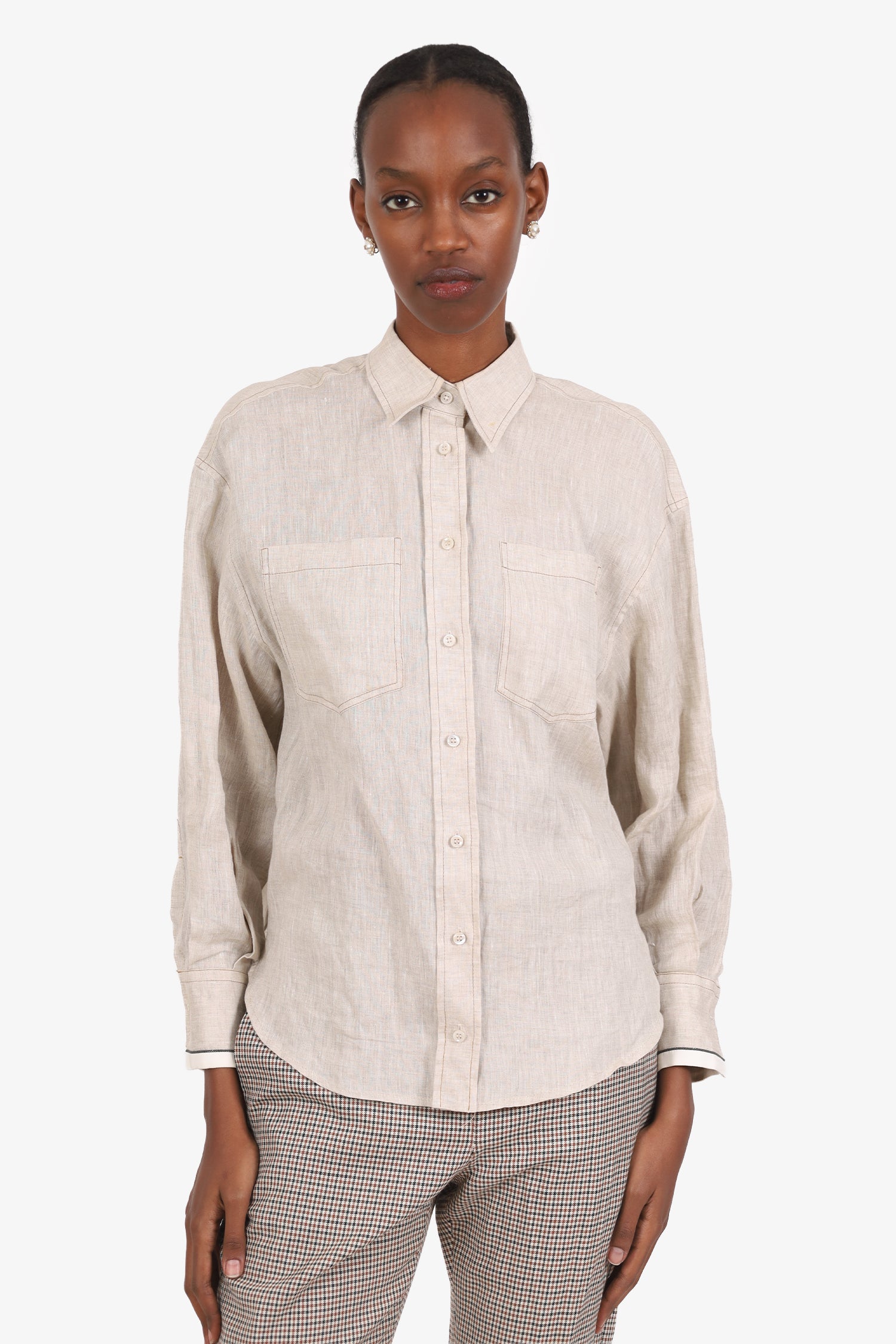 Refresh availabilityBrunello Cucinelli Beige Linen Beaded Detail Blouse. Pull-on. Collared neckline. Front button-up closure. Sleeve cuffs with button-up closure. 2 exterior chest slip pockets. Contrast and tonal stitching.