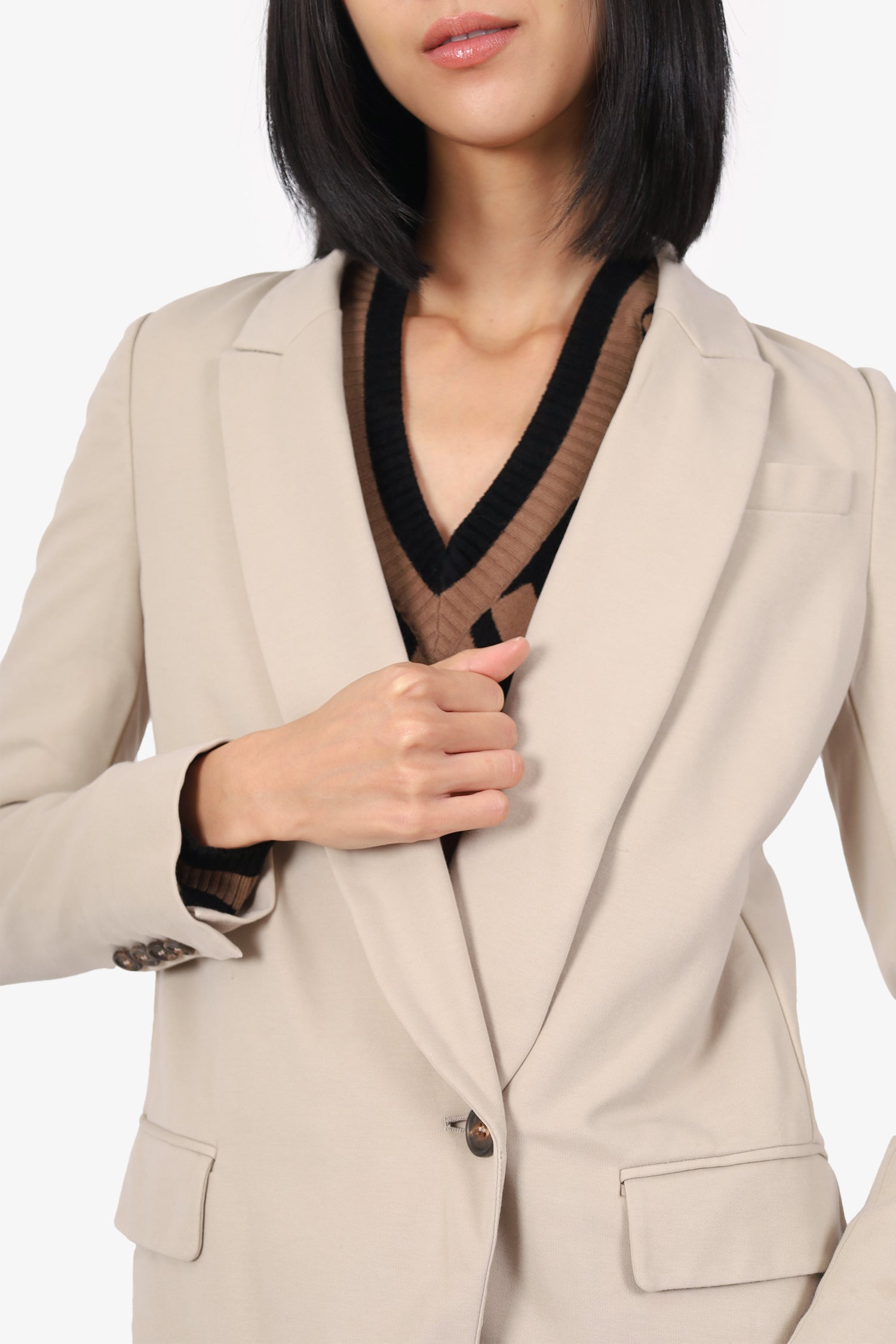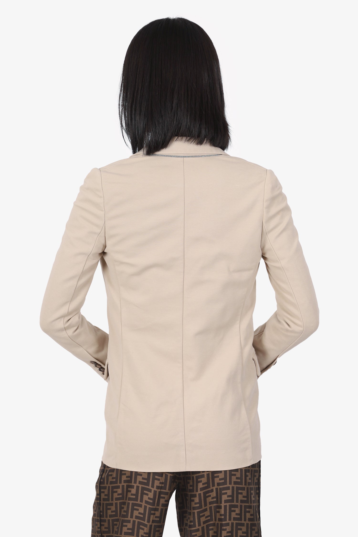 Refresh availabilityBrunello Cucinelli Beige Single Blazer. Pull-on. Shawl lapel. Front button-up closure. Sleeve cuffs with button-up closure. 3 front exterior pockets; 2 flaps and 1 slip. Unlined. Tonal stitching.