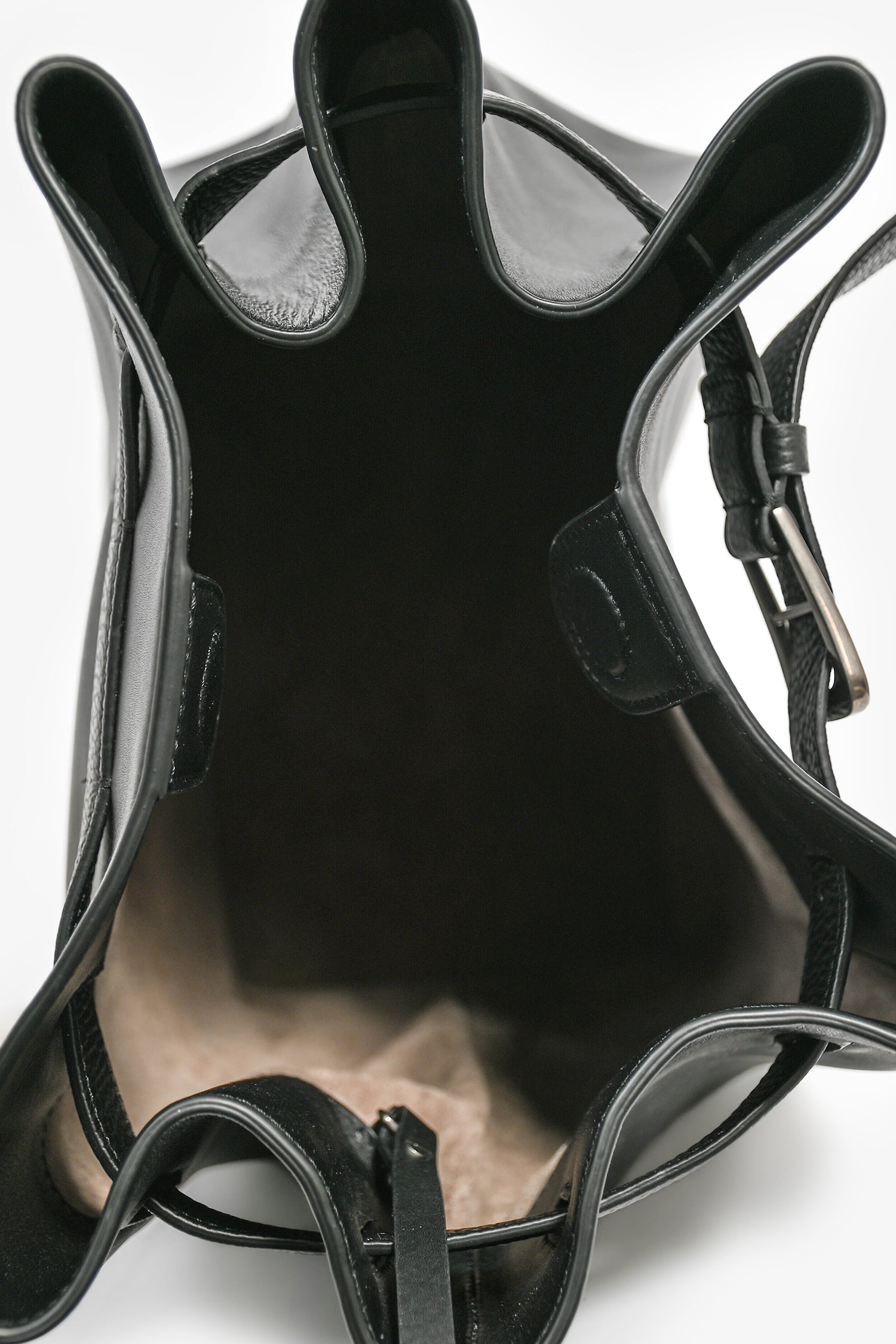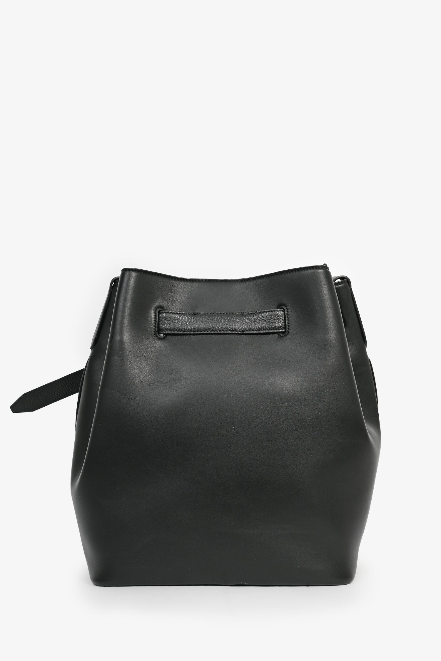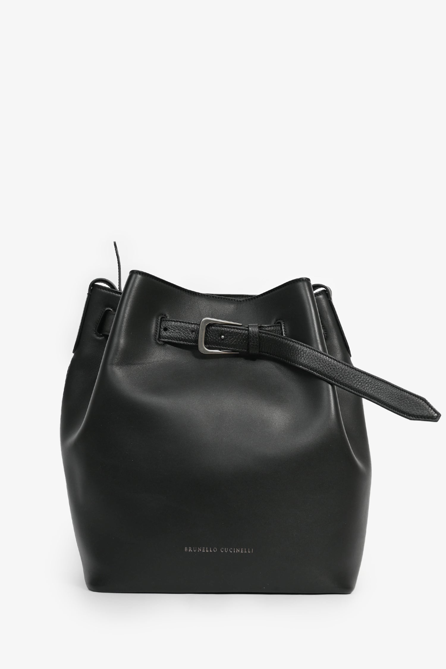 Refresh availabilityBrunello Cucinelli Black Calfskin 'Sartorial' Large Bucket Bag. Front buckle and top magnetic closure. Single compartment. Comes with a detachable pouch with zipper closure. Suede lining. Silver-tone hardware. Tonal stitching.