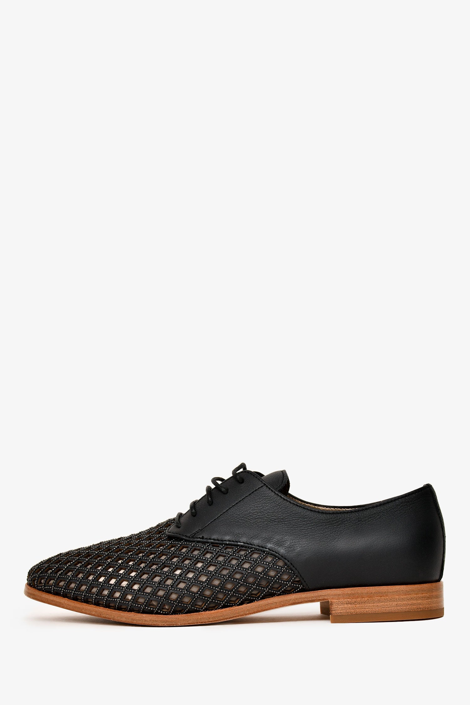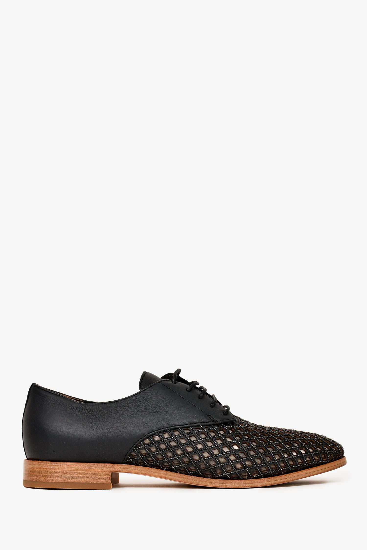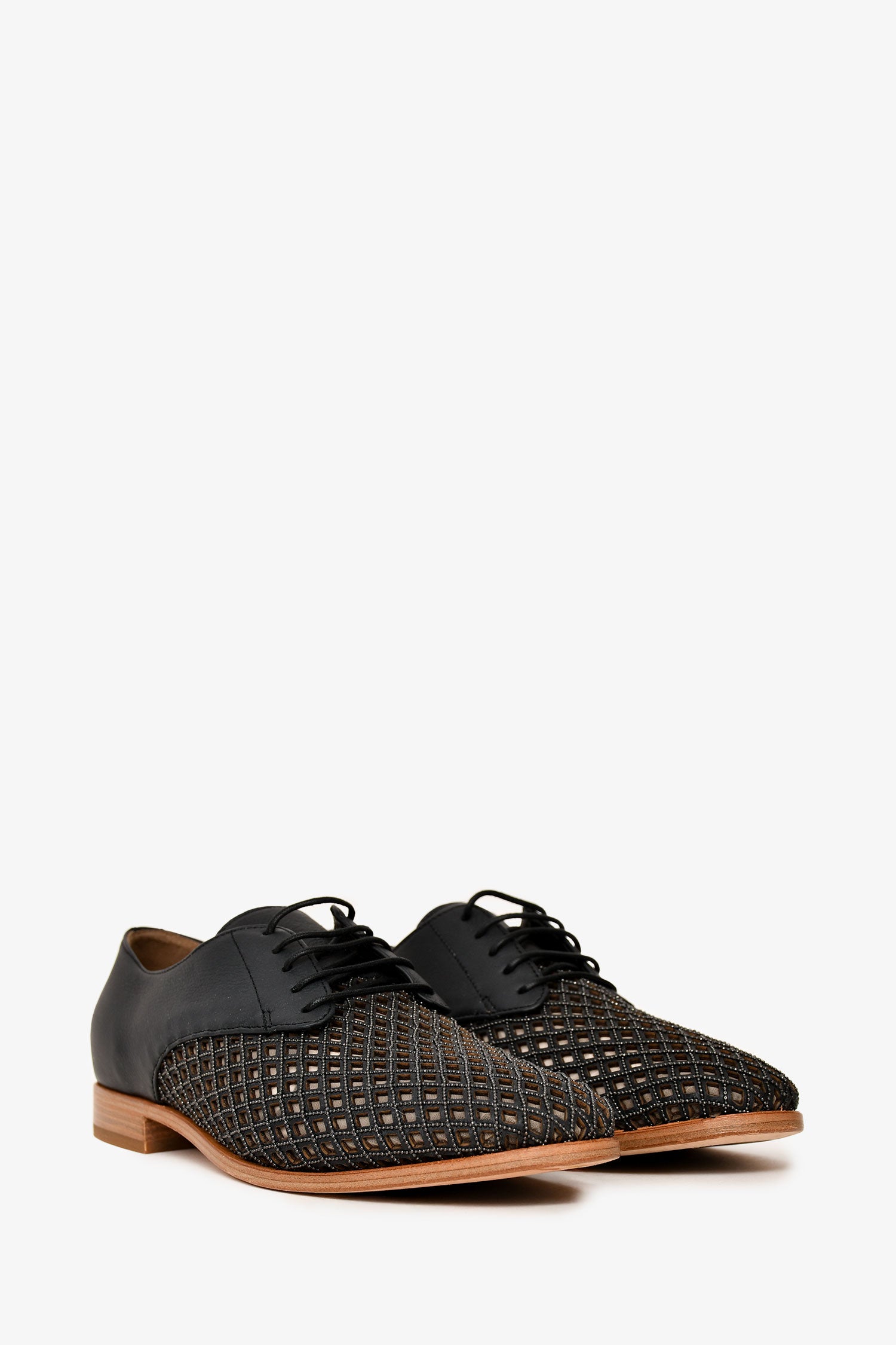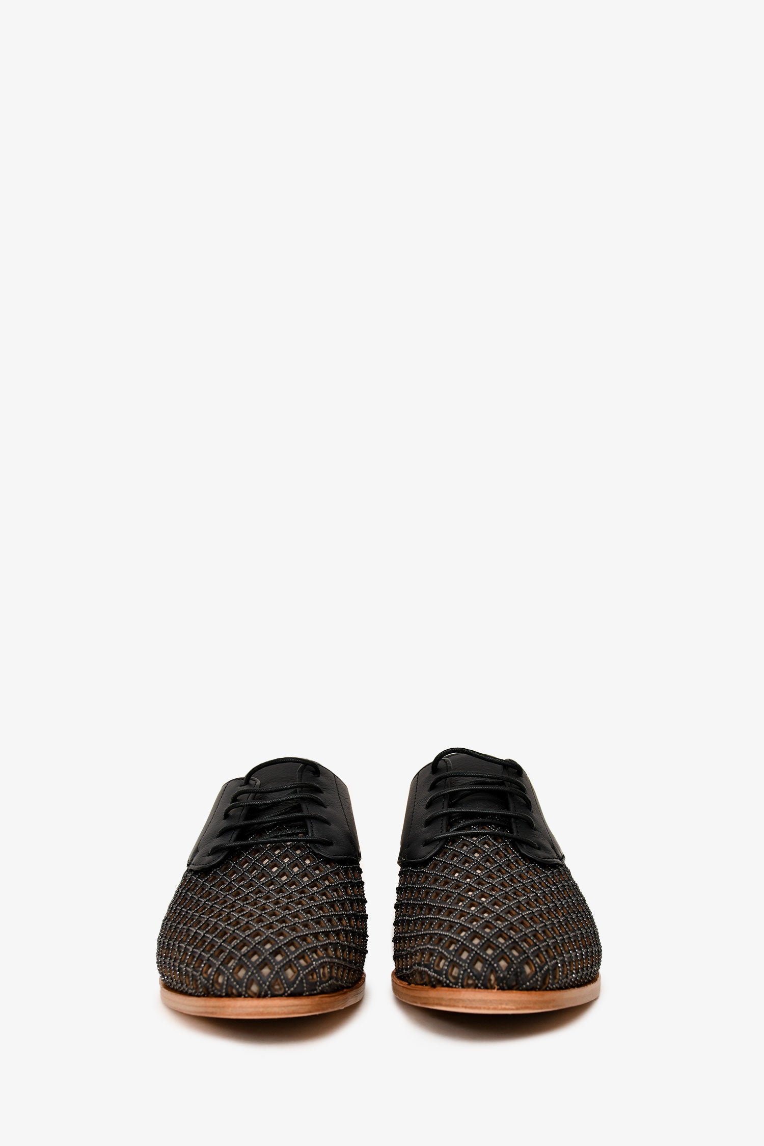 Refresh availabilityBrunello Cucinelli Black leather Bead Embellished Cut Out Detailed Loafers. Lace-up closure. Round toe. Cut-out detailing on the vamp. Monili bead embellishments along the trim. Tonal stitching.