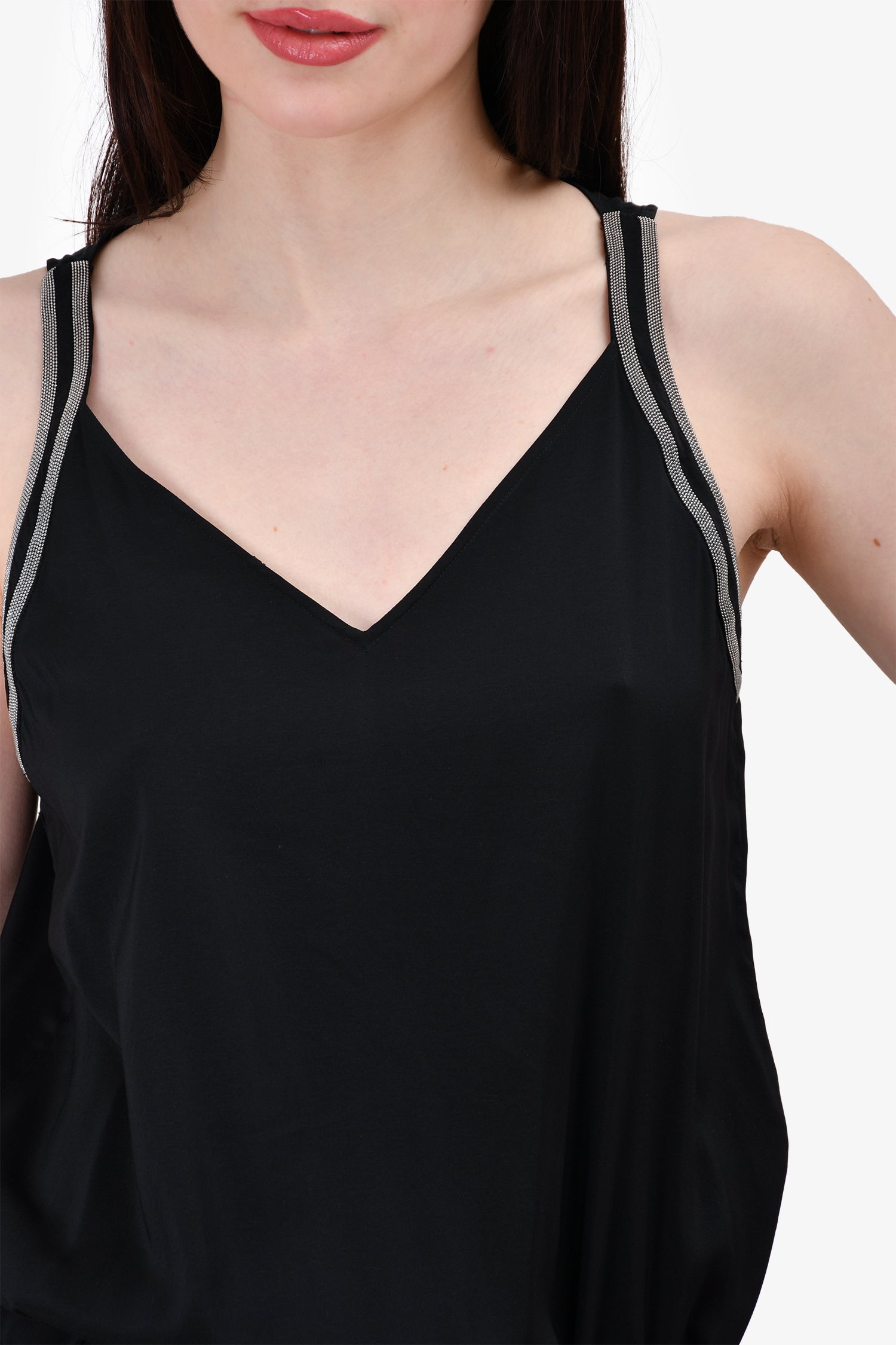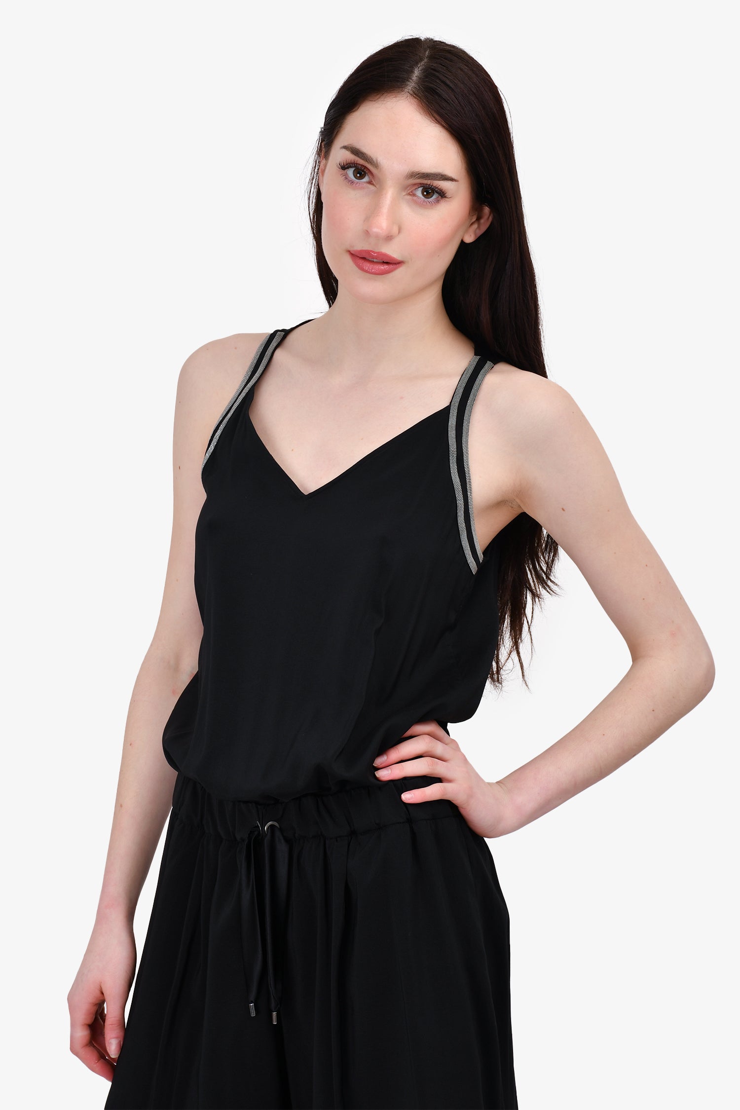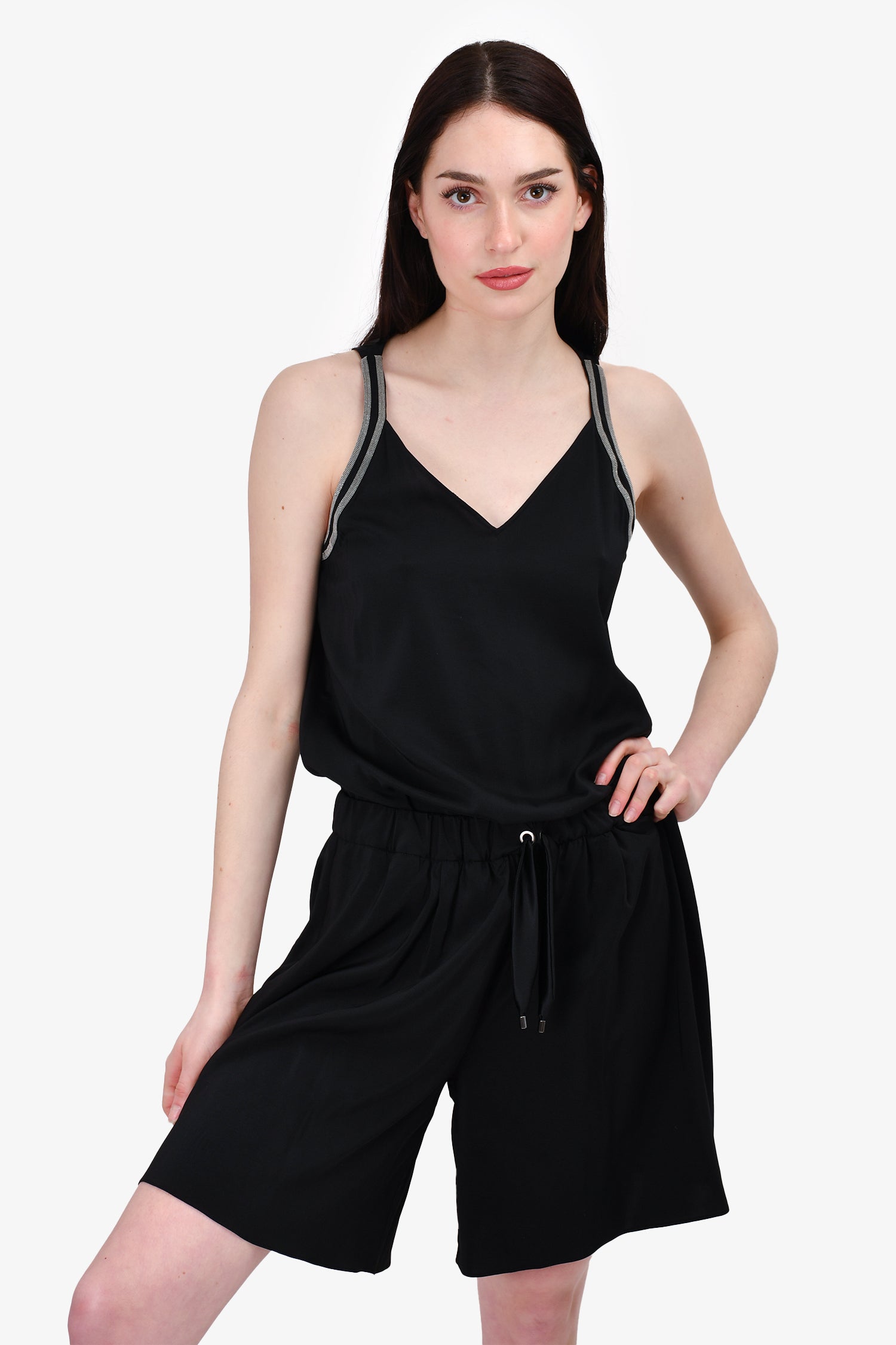 Refresh availabilityBrunello Cucinelli Black Silk Embellished Sleeveless Romper. V-neck. Rear zip and hook closure. Front pockets. Tonal stitching.