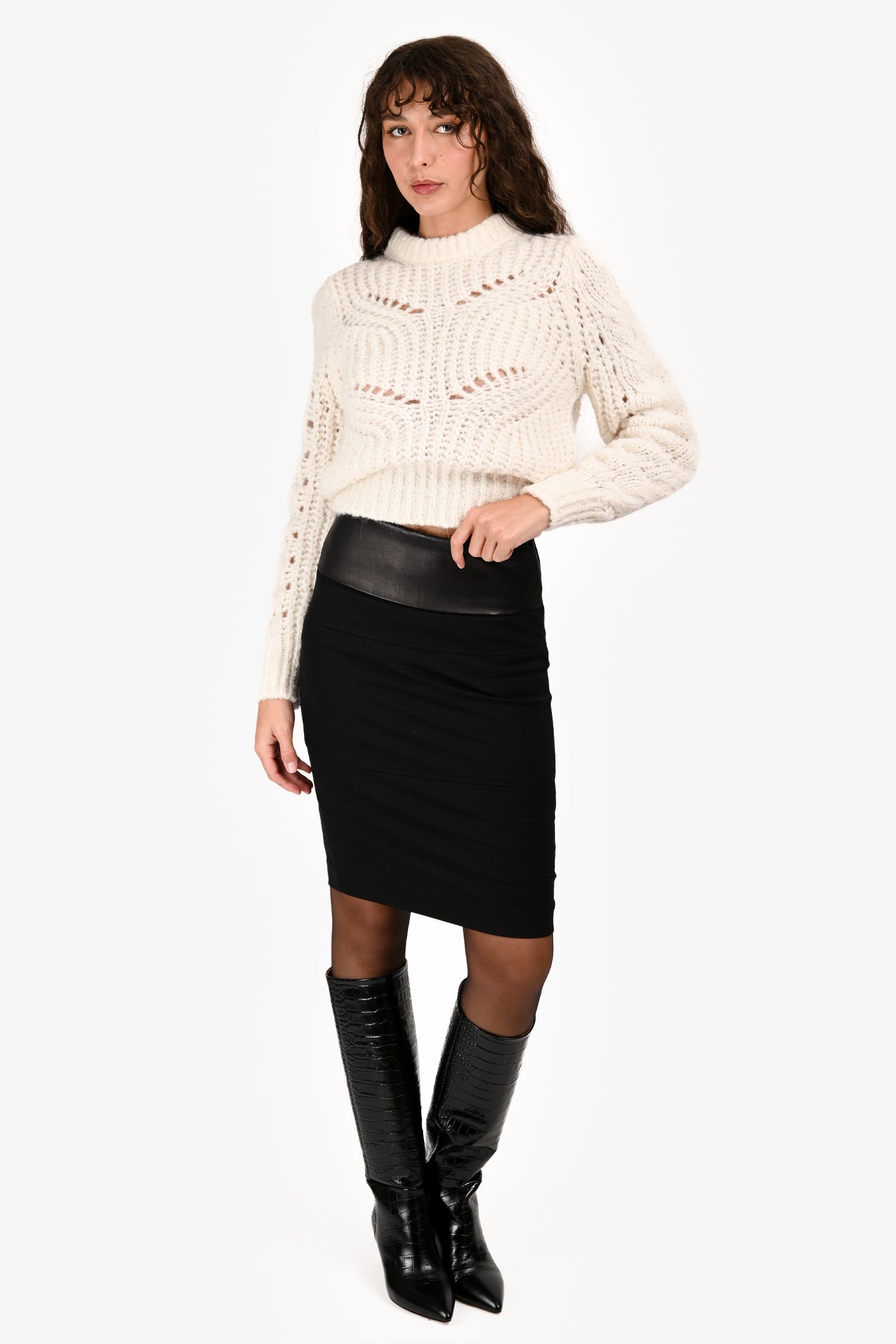 Refresh availabilityBrunello Cucinelli Black Wool/Leather Knee Length Skirt. Pull-on. Hidden zipper in the back. Leather detailing at the waist. Slit in the back. Tonal stitching.