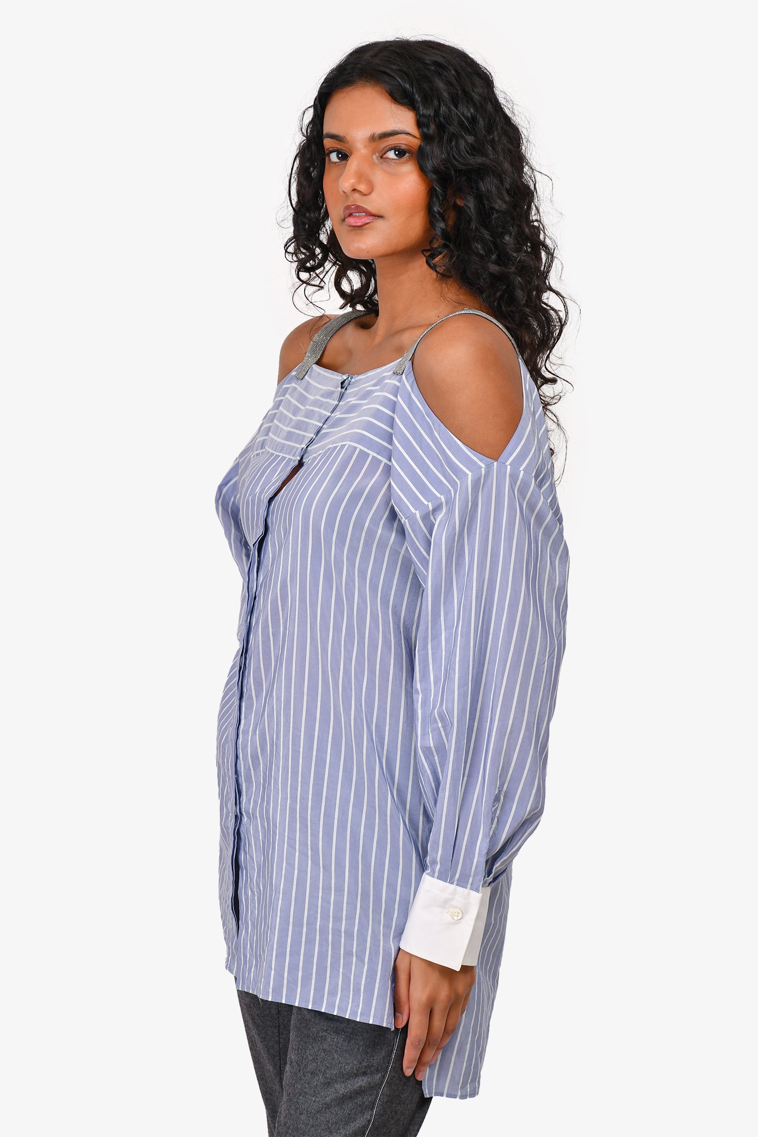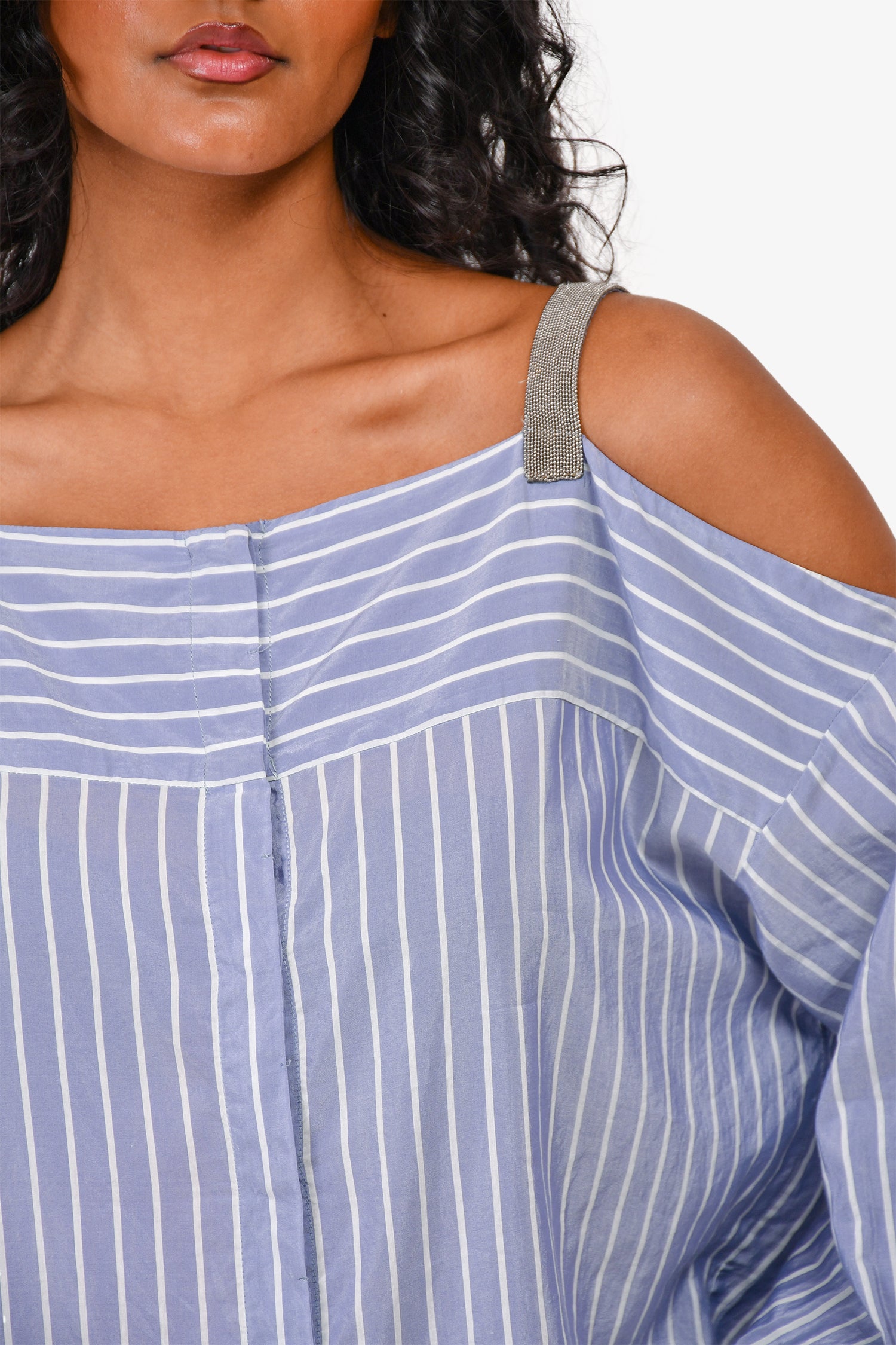 Refresh availabilityBrunello Cucinelli Blue/White Striped Beaded Cold-Shoulder Top. Monili detail on the shoulder straps. White buttoned cuffs. Button-down. Tonal stitching.