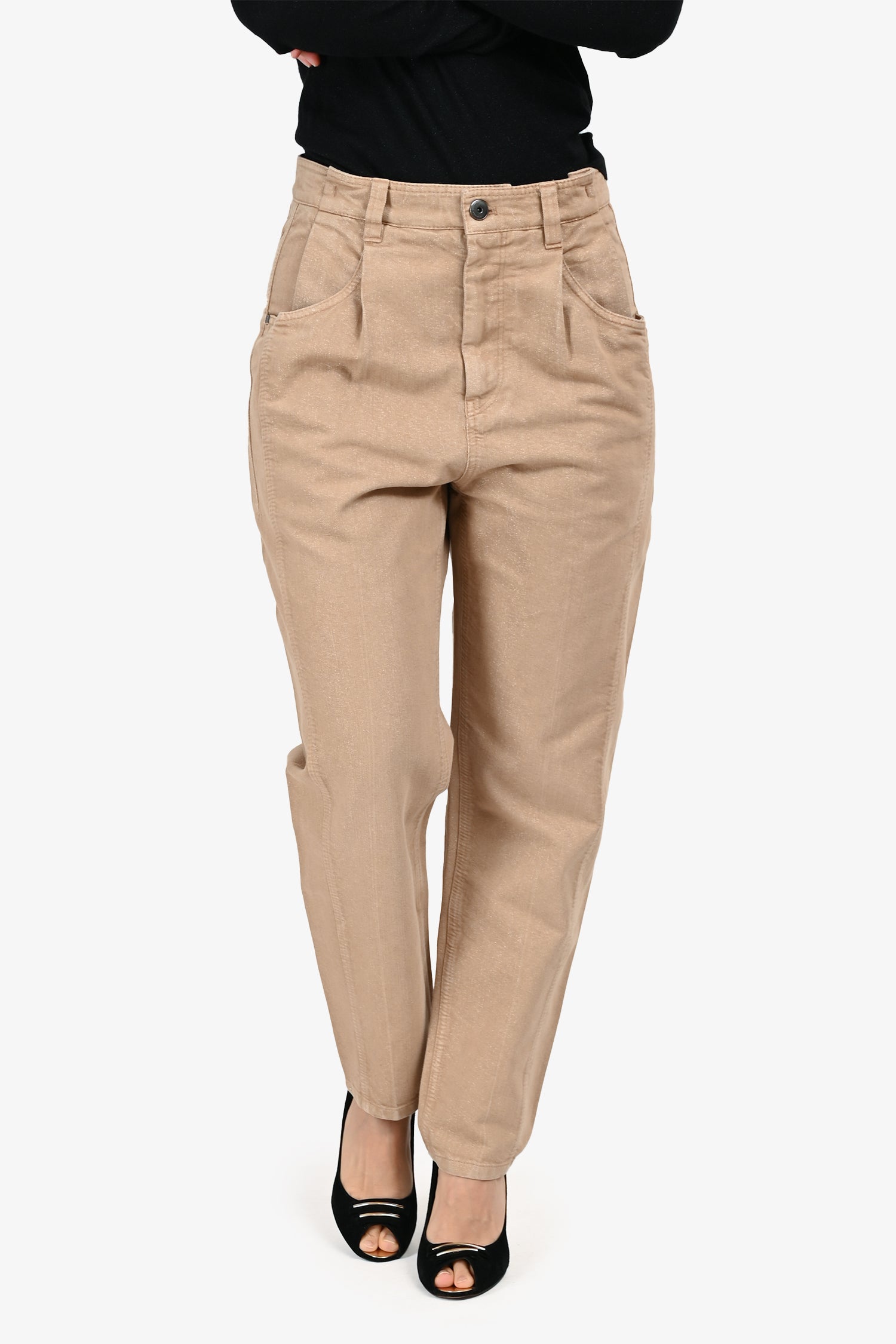 Refresh availabilityBrunello Cucinelli Brown Coated Denim Barrel Legged Jeans. Slip-on. Front zip with button closure. Waistband belt loops. 4 exterior pockets; 2 front slip, 2 rear slip. Silver-tone hardware. Tonal stitching.