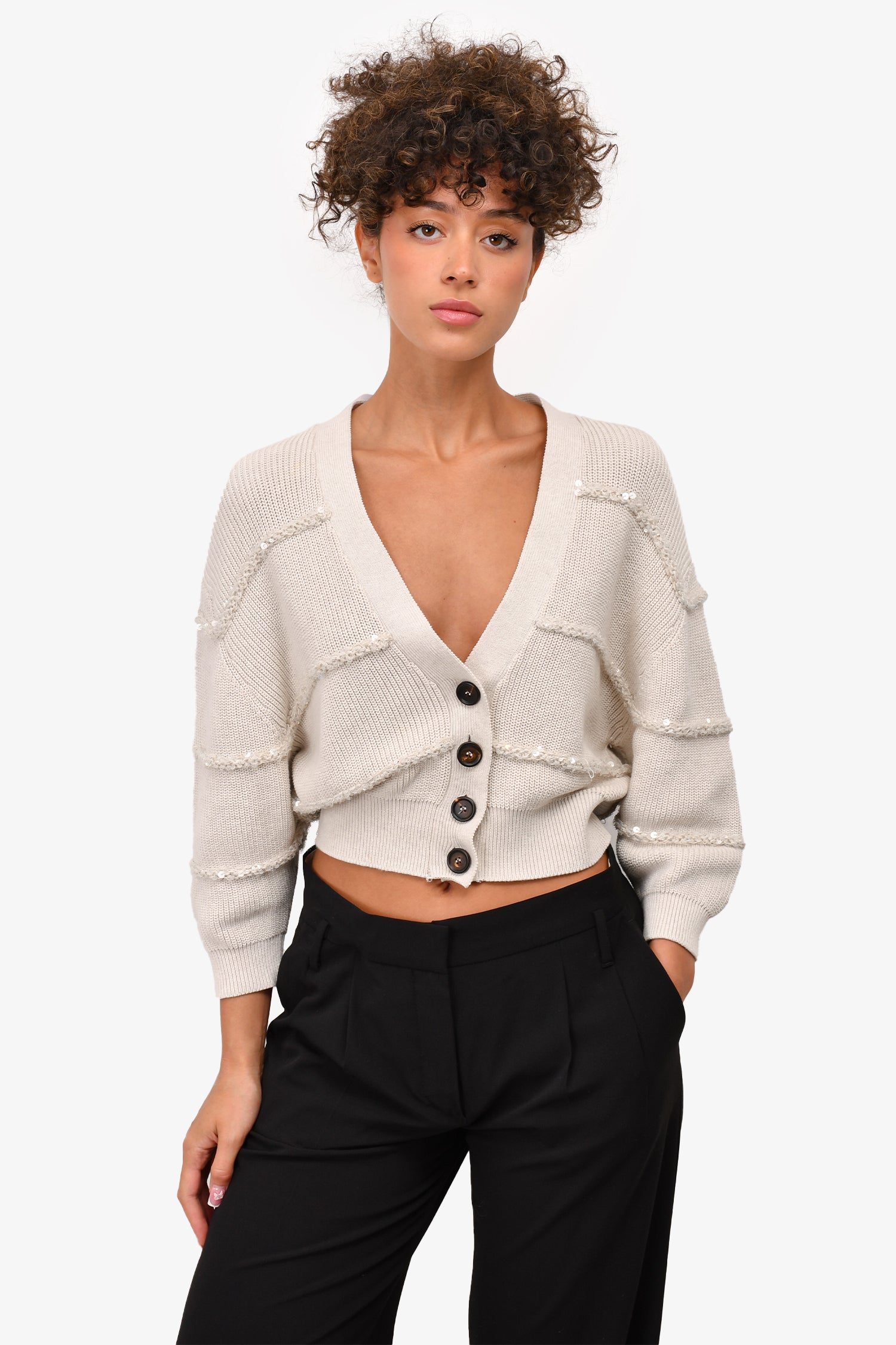 Refresh availabilityBrunello Cucinelli Cream Cotton Embellished Cropped Cardigan. Front button-up closure. V-neck. Ribbed neck, cuffs and hem.