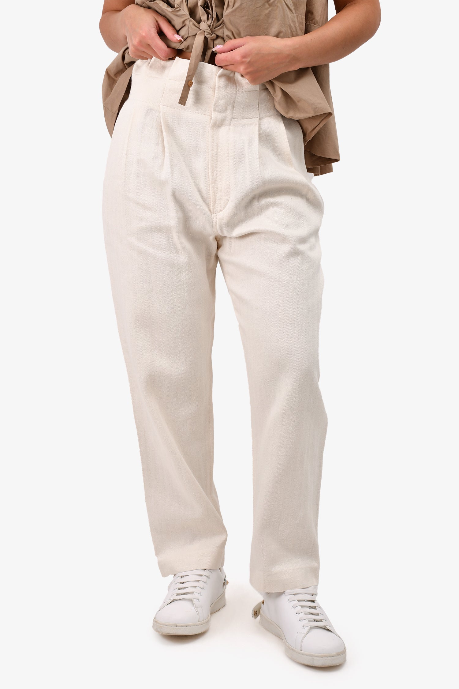 Refresh availabilityBrunello Cucinelli Cream Linen High Waisted Pants. Tonal stitching. Dual hook closures with zipper. Button closure. Pleated front.