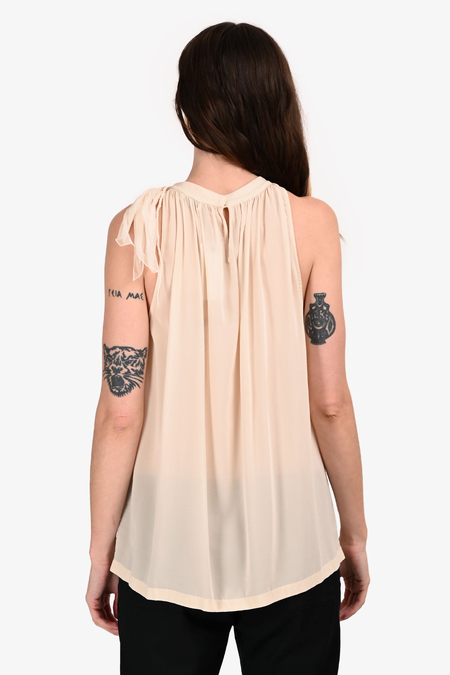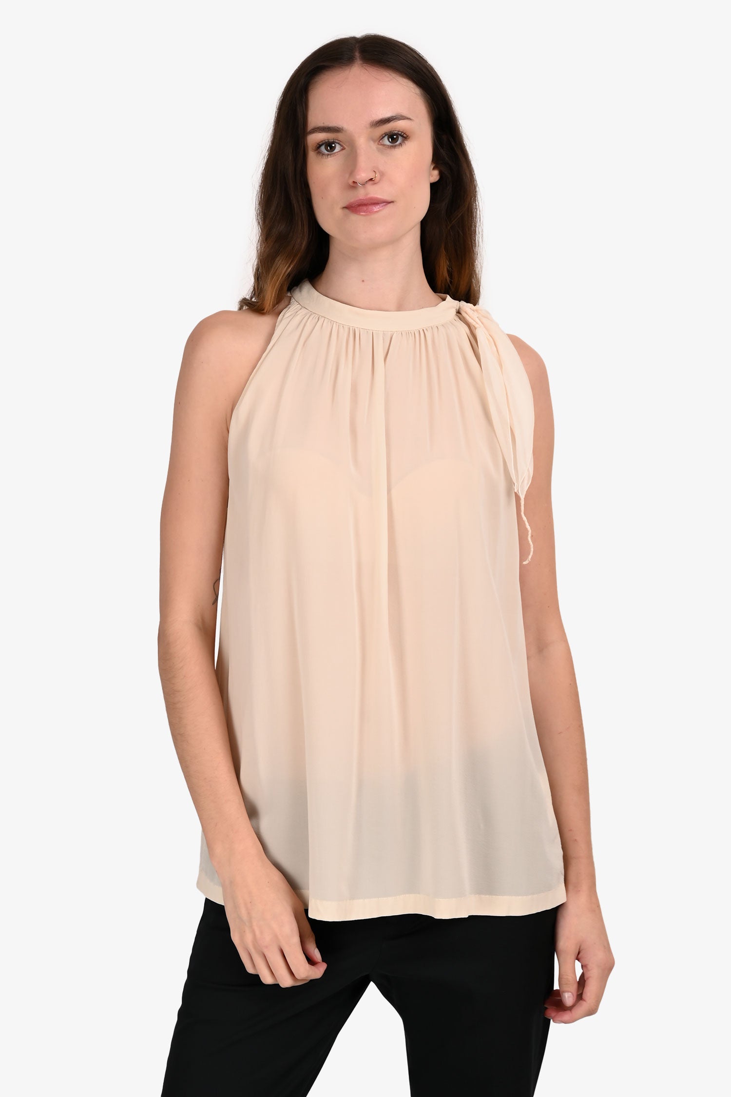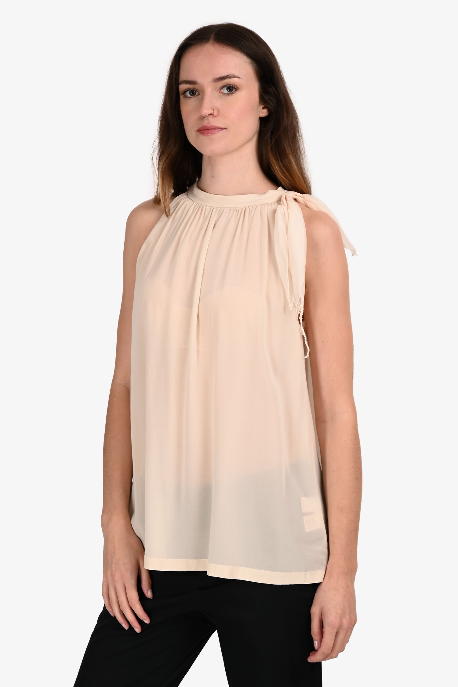 Refresh availabilityBrunello Cucinelli Cream Silk Sleeveless Mock Neck Top. Pull-on. Mock neckline. Rear keyhole with button closure. Removable bow detail on collar. Unlined. Tonal stitching.