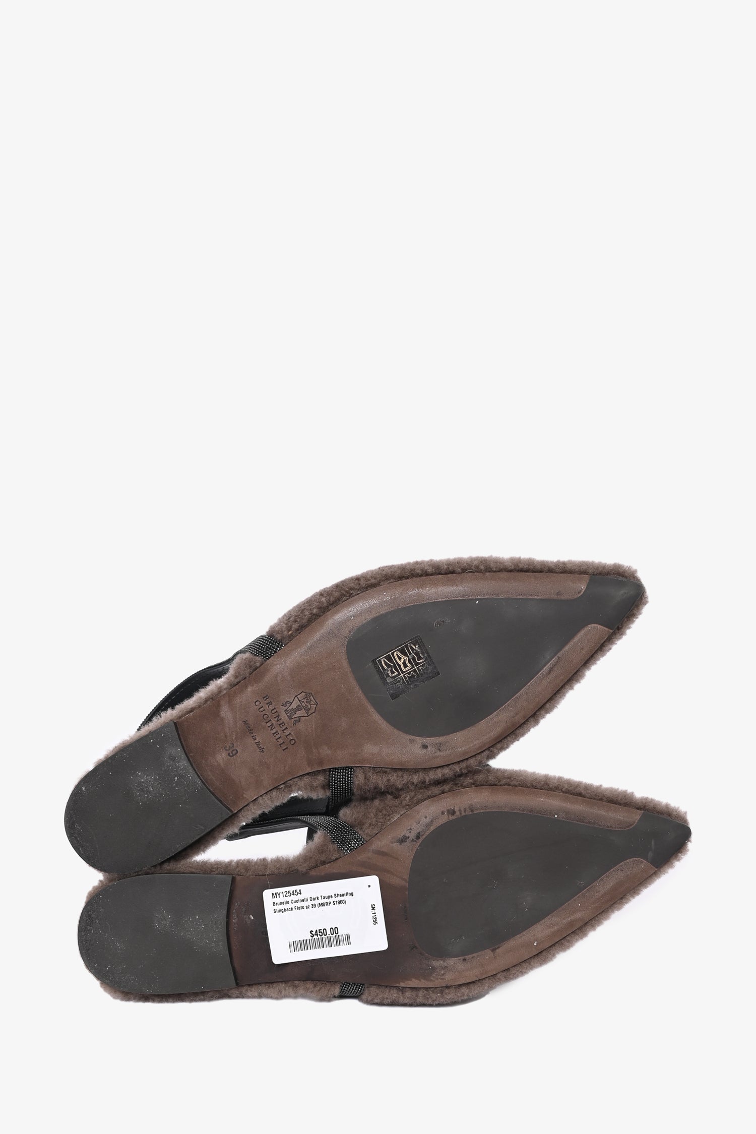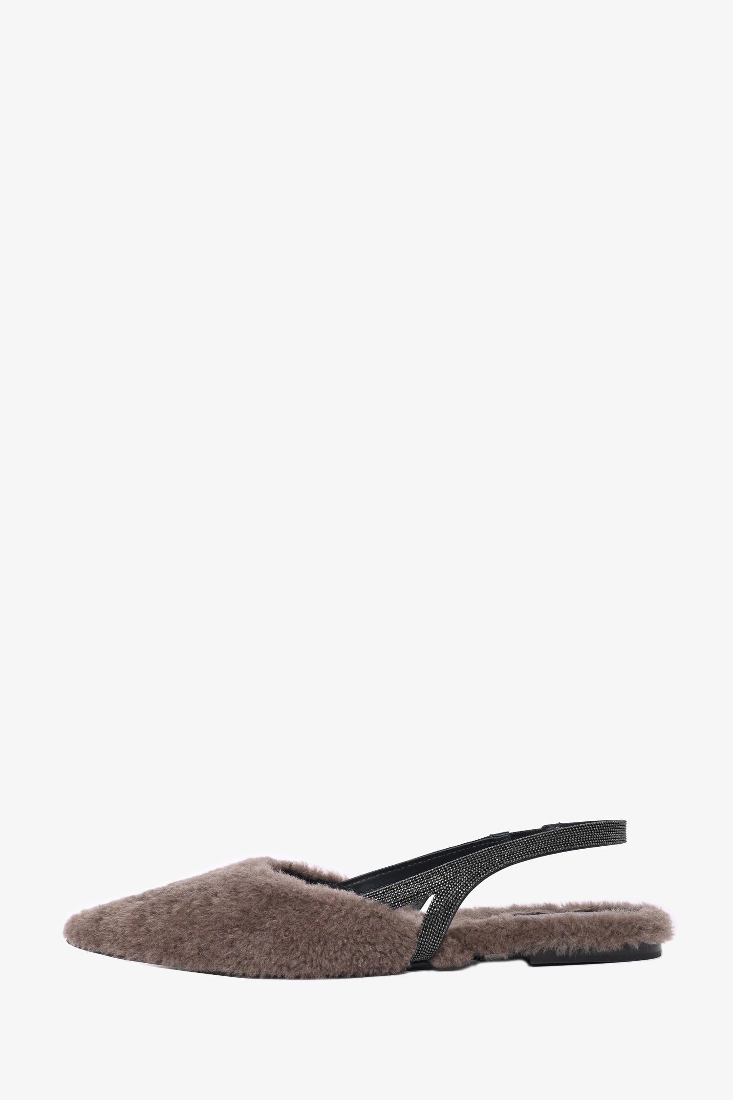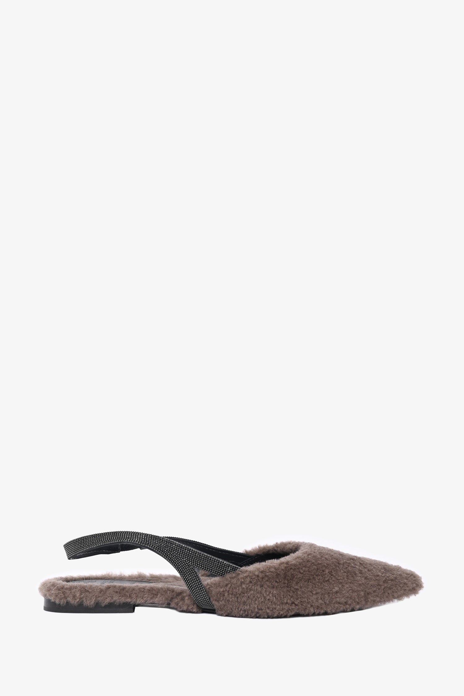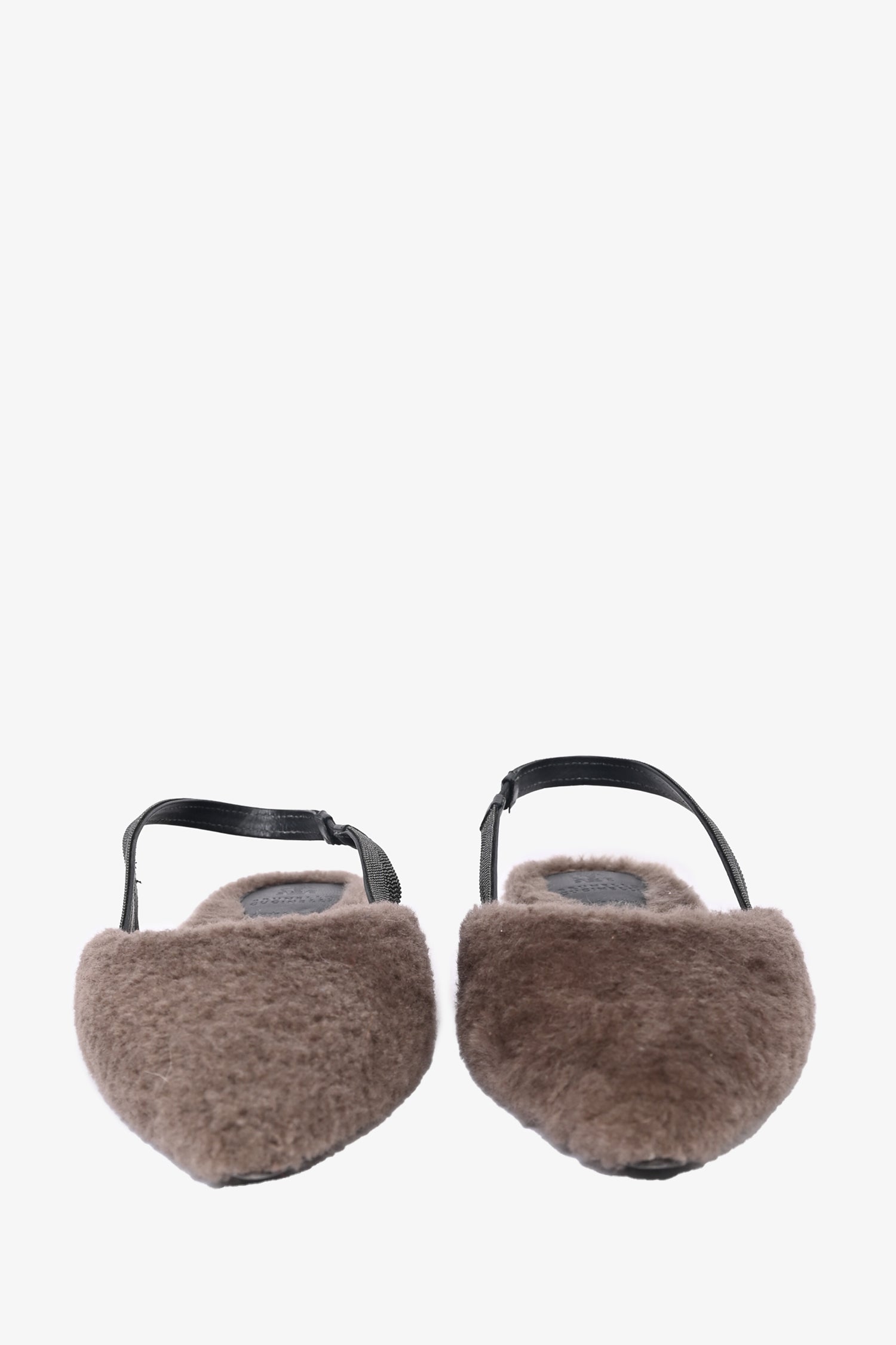 Refresh availabilityBrunello Cucinelli Dark Taupe Shearling Slingback Flats. Pointed toe. Tonal stitching.
