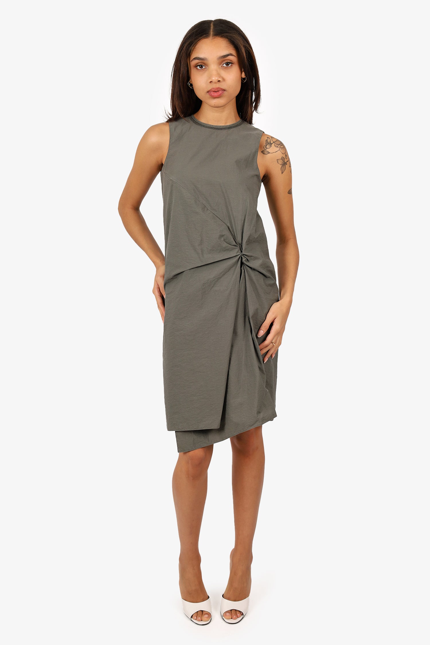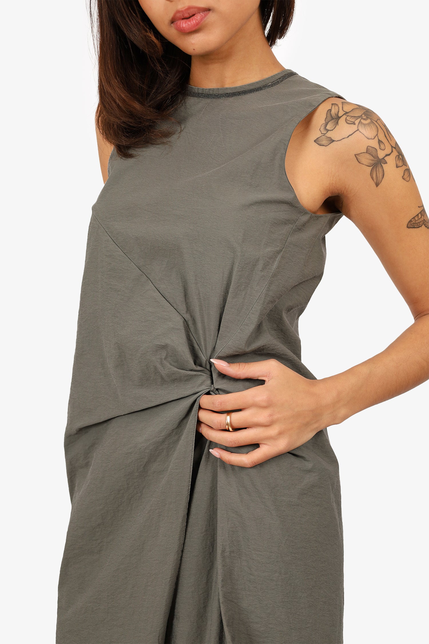 Refresh availabilityBrunello Cucinelli Grey Beaded Detail Dress. Slip-on. Round neckline. Rear zip with hook closure. Knot design at front left side. Lined. Silver-tone hardware. Tonal stitching.