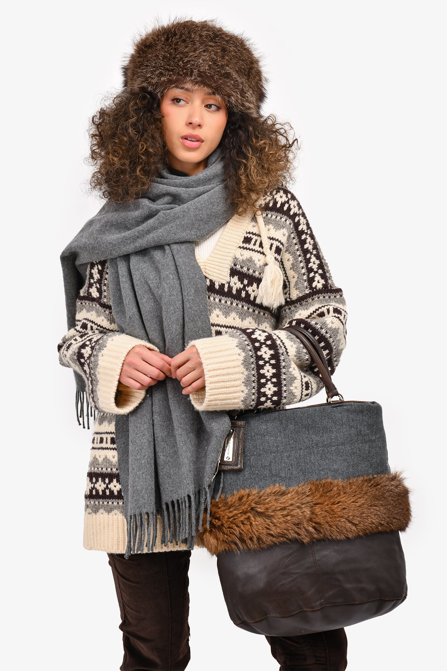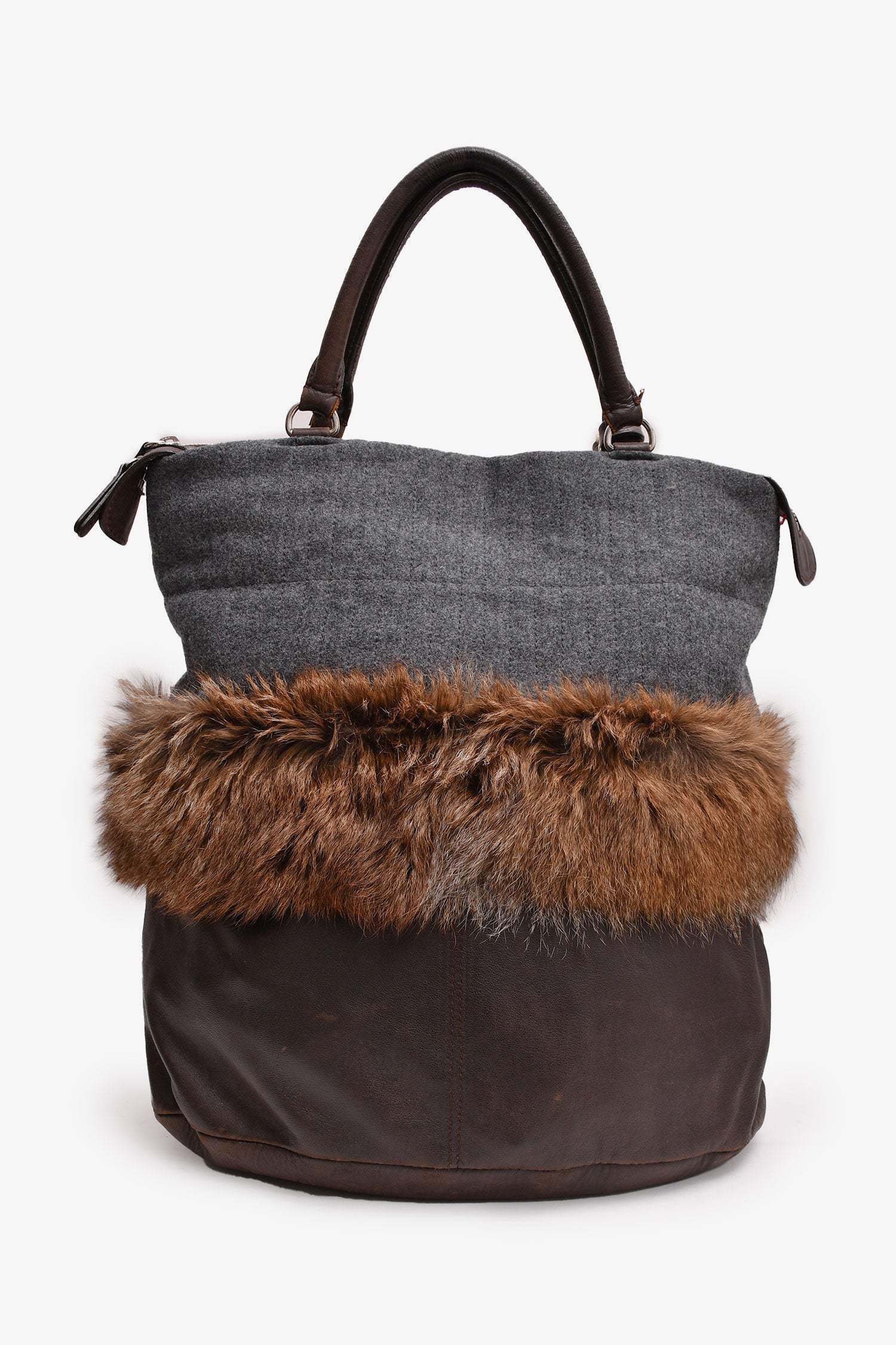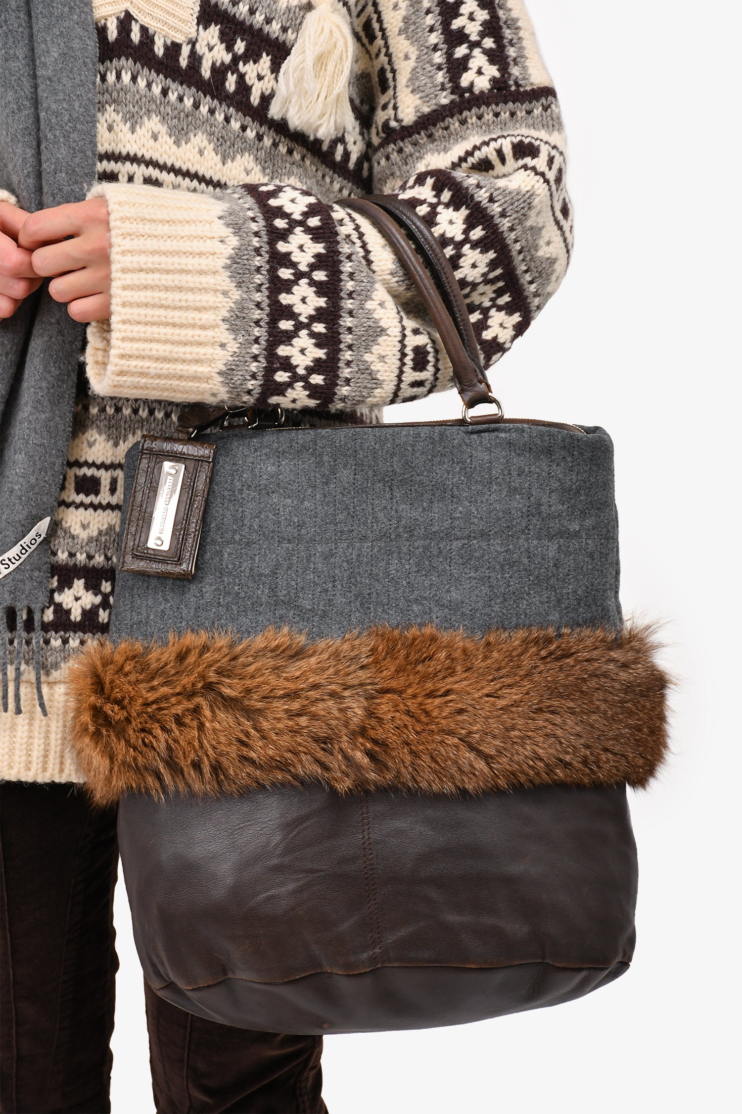 Brunello Cucinelli Grey/Black Leather Fur Trim Top Handle Bag