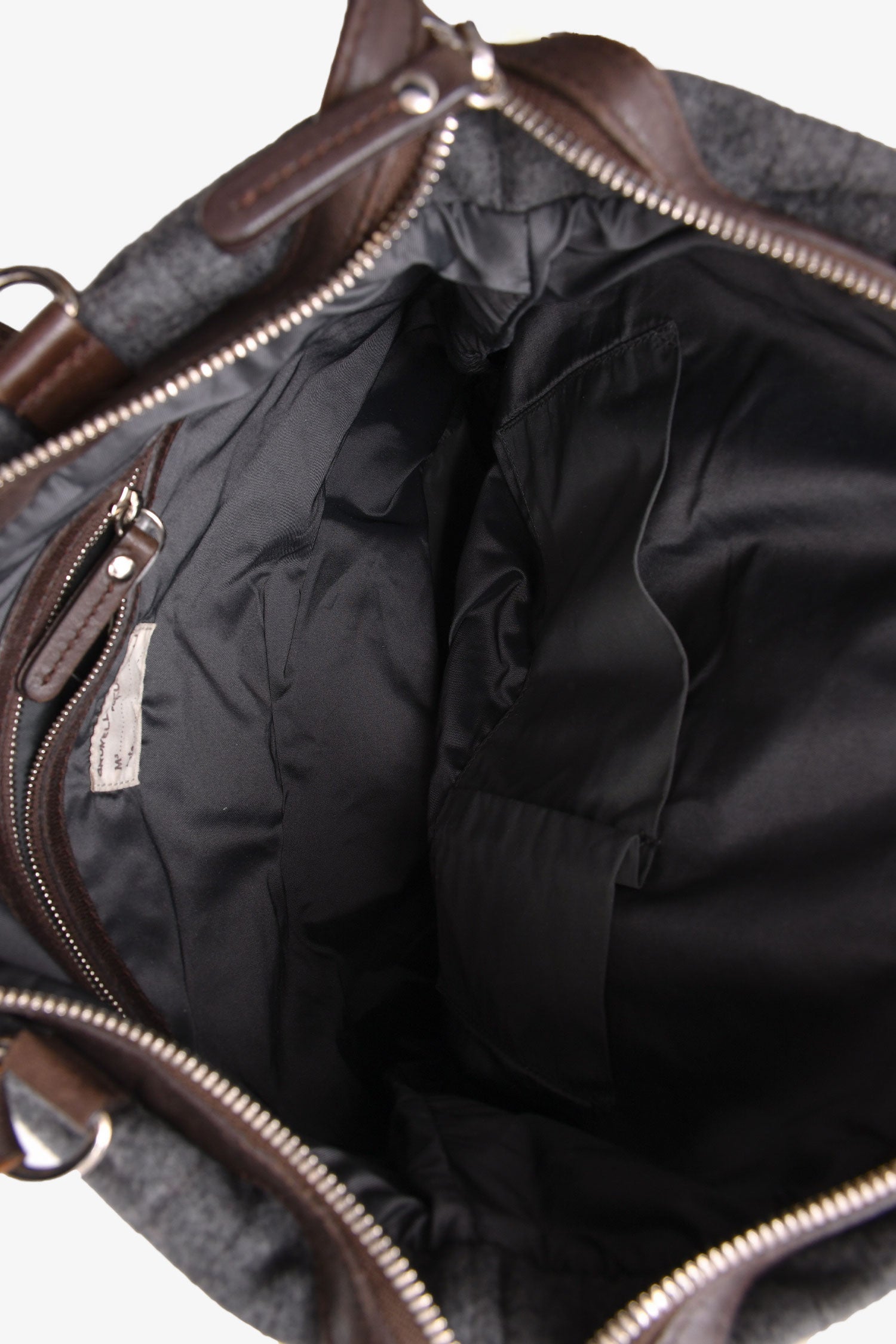 Refresh availabilityBrunello Cucinelli Grey/Black Leather Fur Trim Top Handle Bag. Top zipper closure. Silver-tone hardware. Top handles. Two small interior pockets. One small interior zipper pocket. Name tag attached. Fur, leather and fabric material. Tonal stitching.