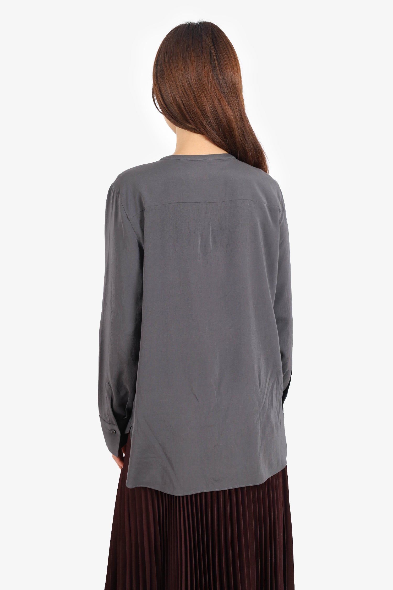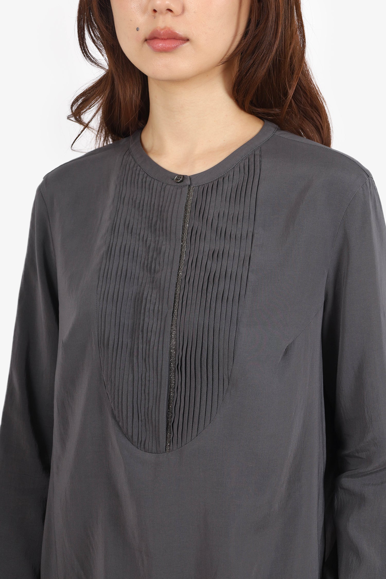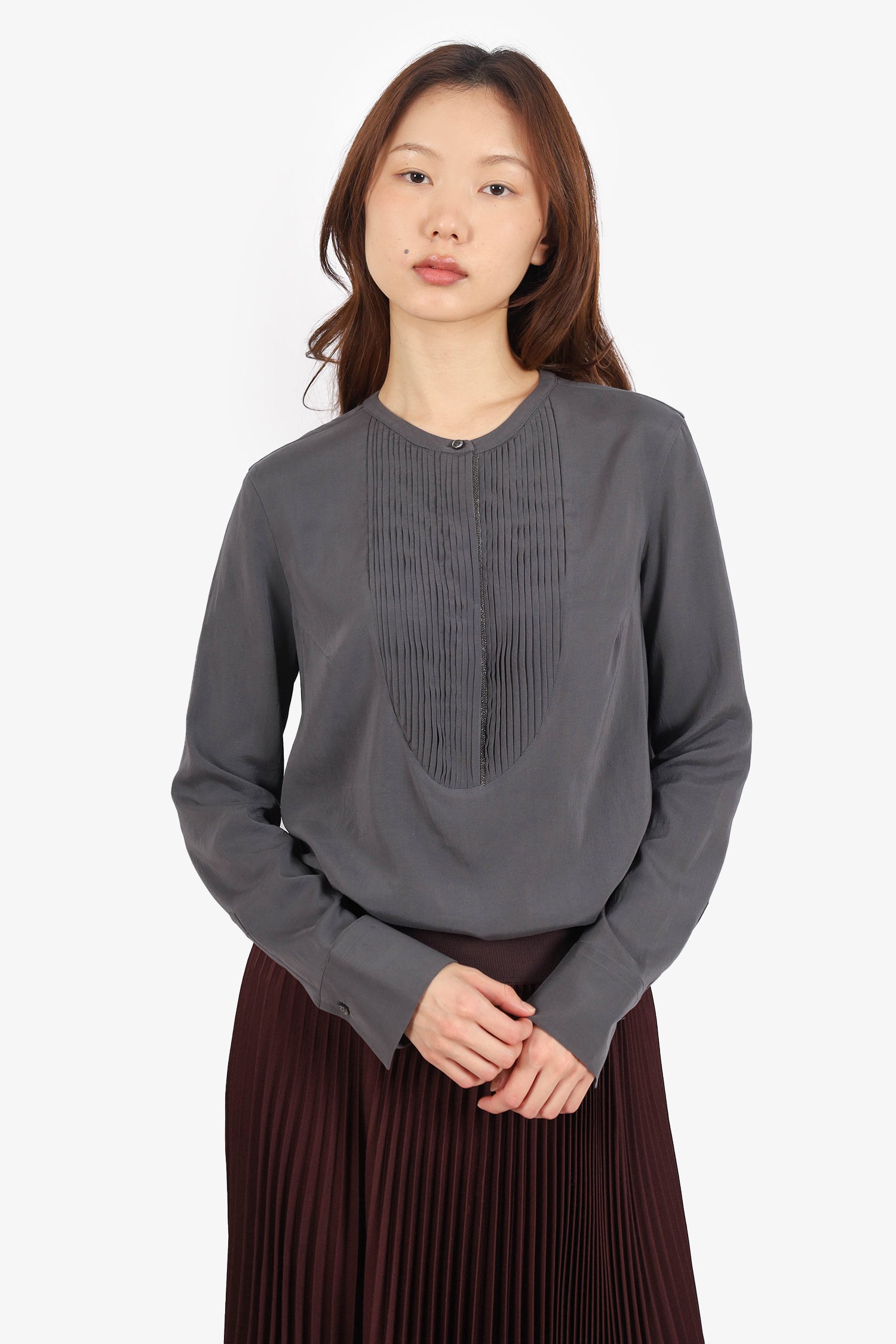 Refresh availabilityBrunello Cucinelli Grey Silk Accordion Pleated Blouse with Monili Beads. Front button closure. Pull-on. Long-sleeve. Round neckline. Tonal stitching.