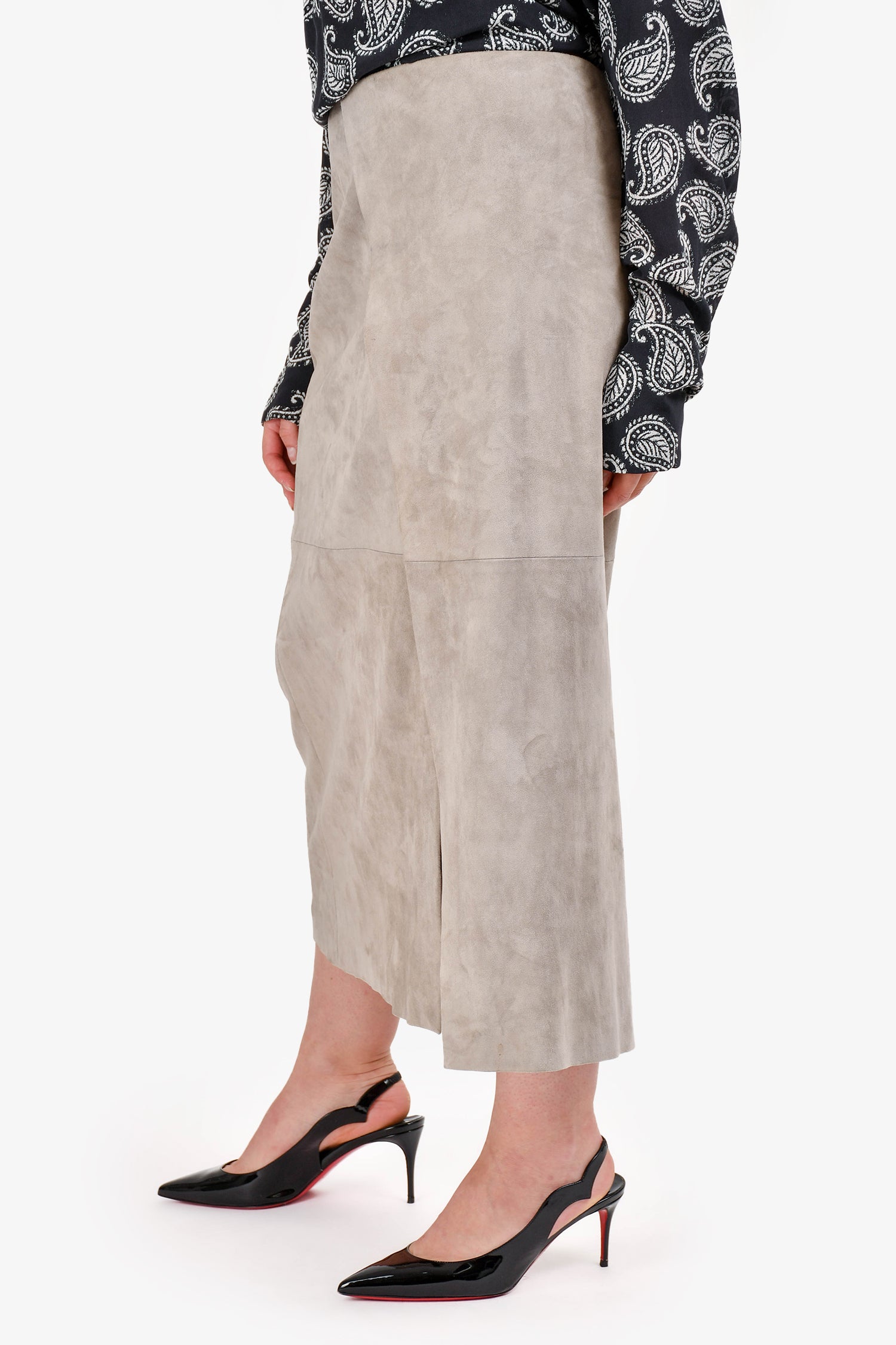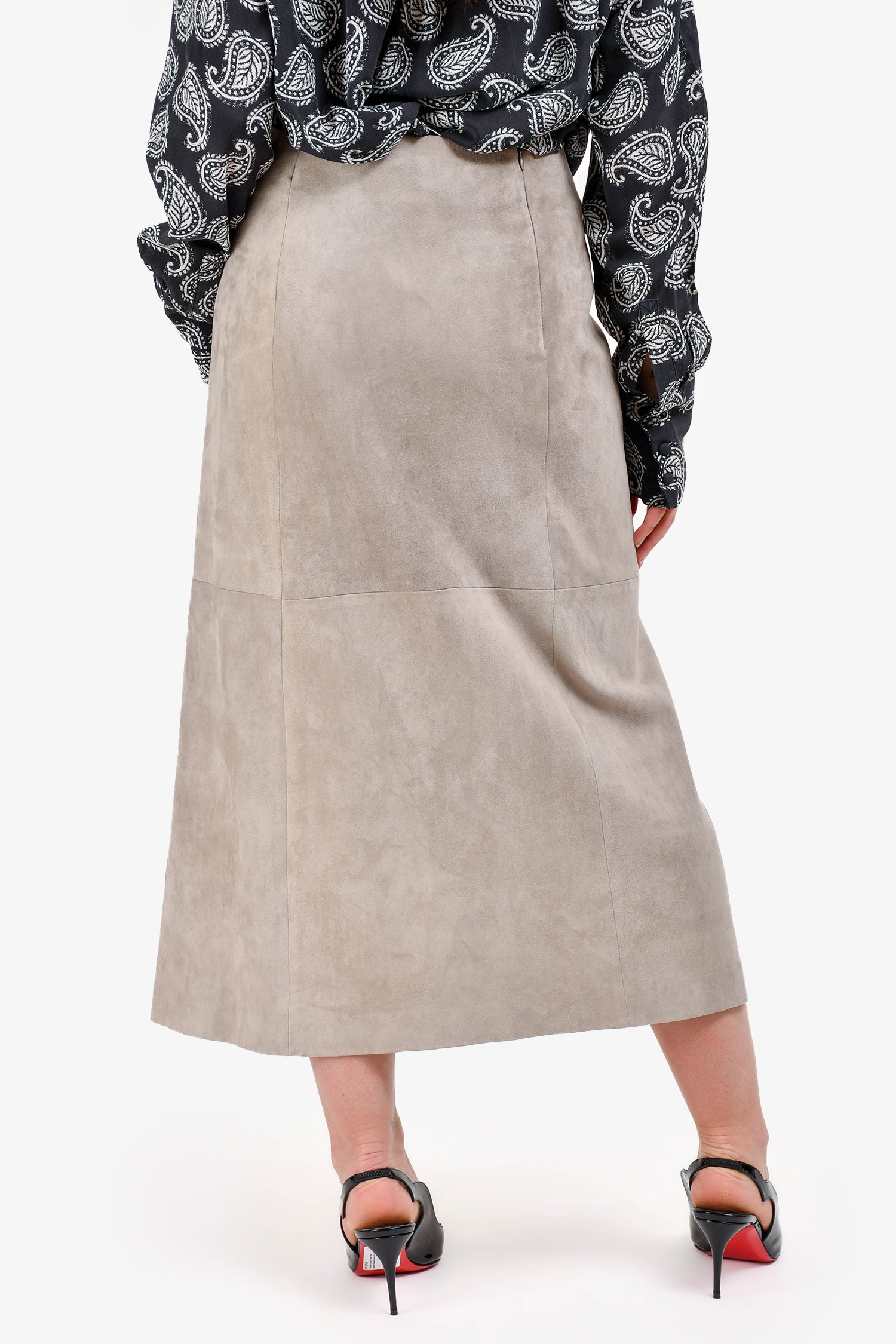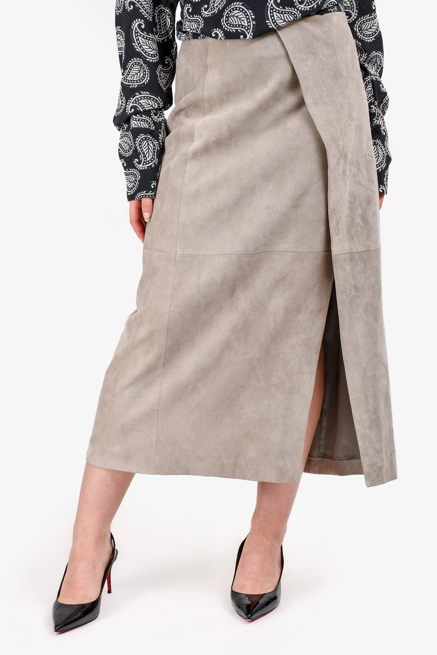 Refresh availabilityBrunello Cucinelli Grey Suede Crossover Midi Skirt. Back zip closure. Soft suede construction. Tonal stitching.