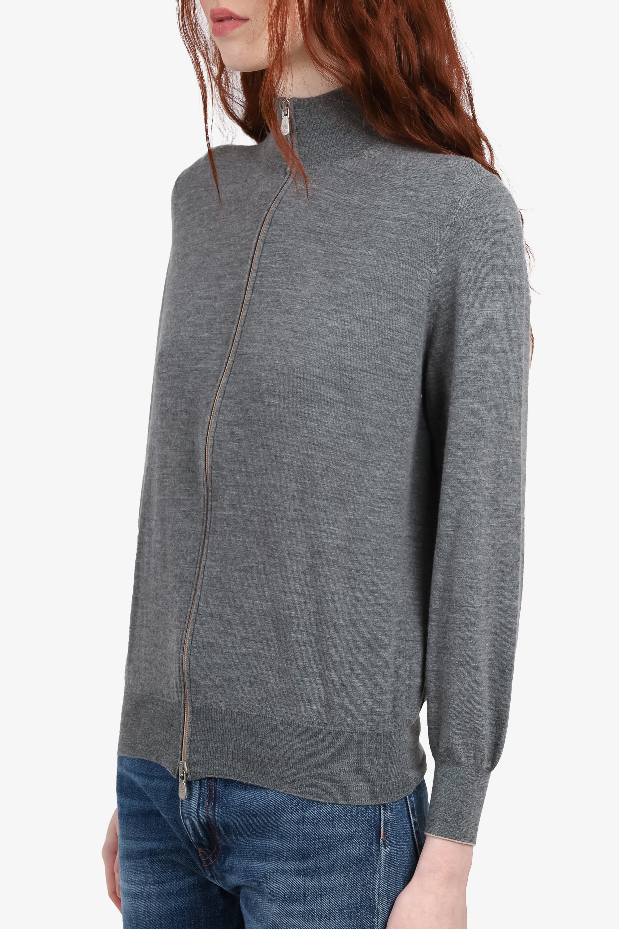 Refresh availabilityBrunello Cucinelli Grey Wool/Cashmere Zip-up Sweatshirt. Front double zipper closure. Silver-toned hardware. Tonal stitching.