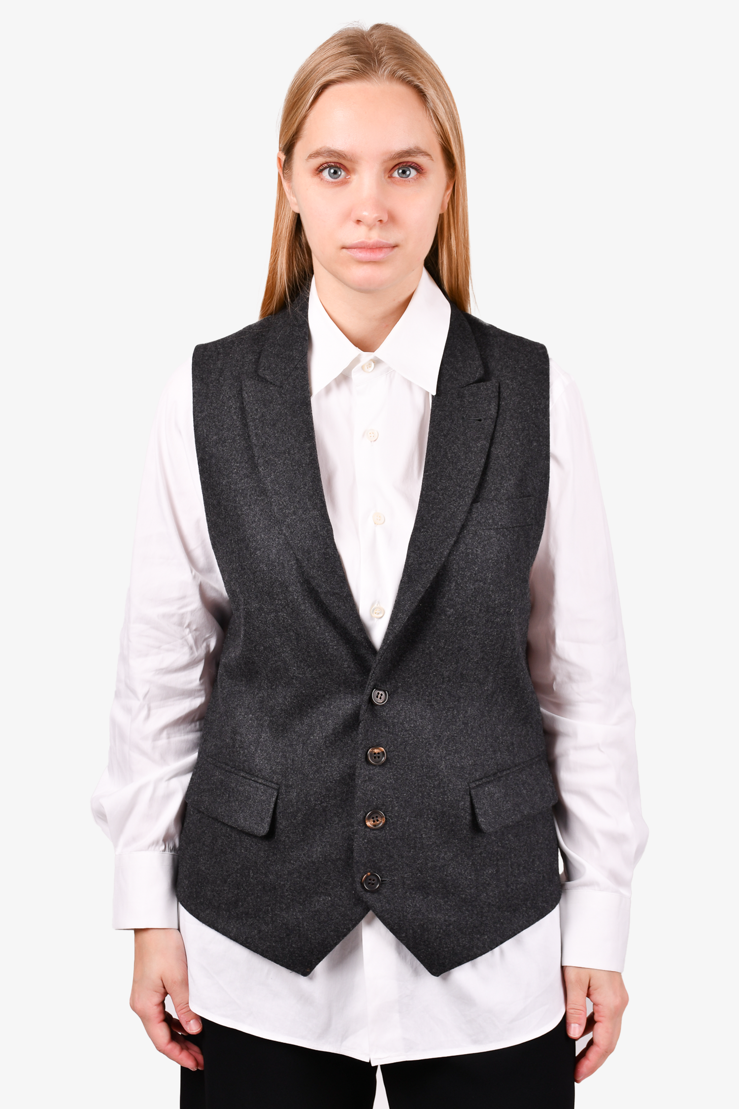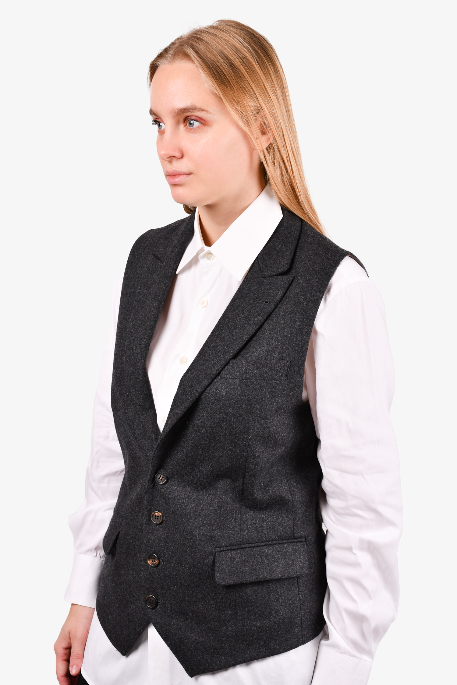 Refresh availabilityBrunello Cucinelli Grey Wool Vest. Lined. 3 front pockets. Button-up closure. Tonal stitching.