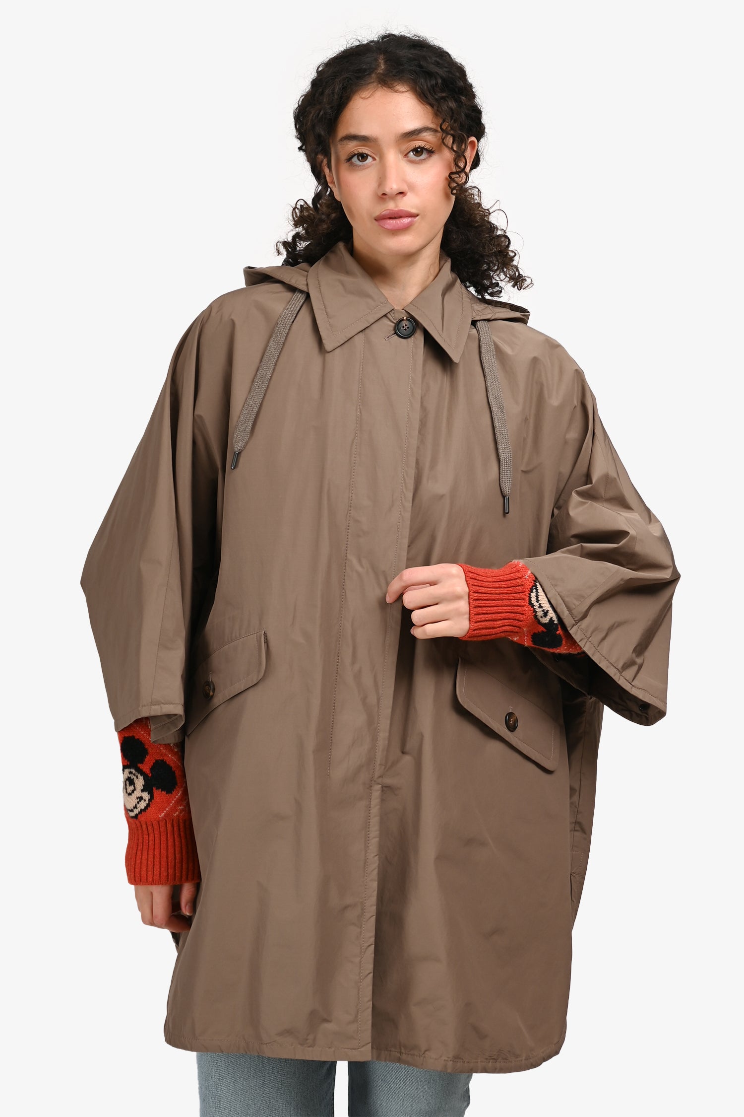 Refresh availabilityBrunello Cucinelli Khaki Hooded Bead Trim Lightweight Jacket. Pull-on. Pointed collar. Hidden button closure in the front. Cape-style sleeves. Silver-tone hardware. Tonal stitching.