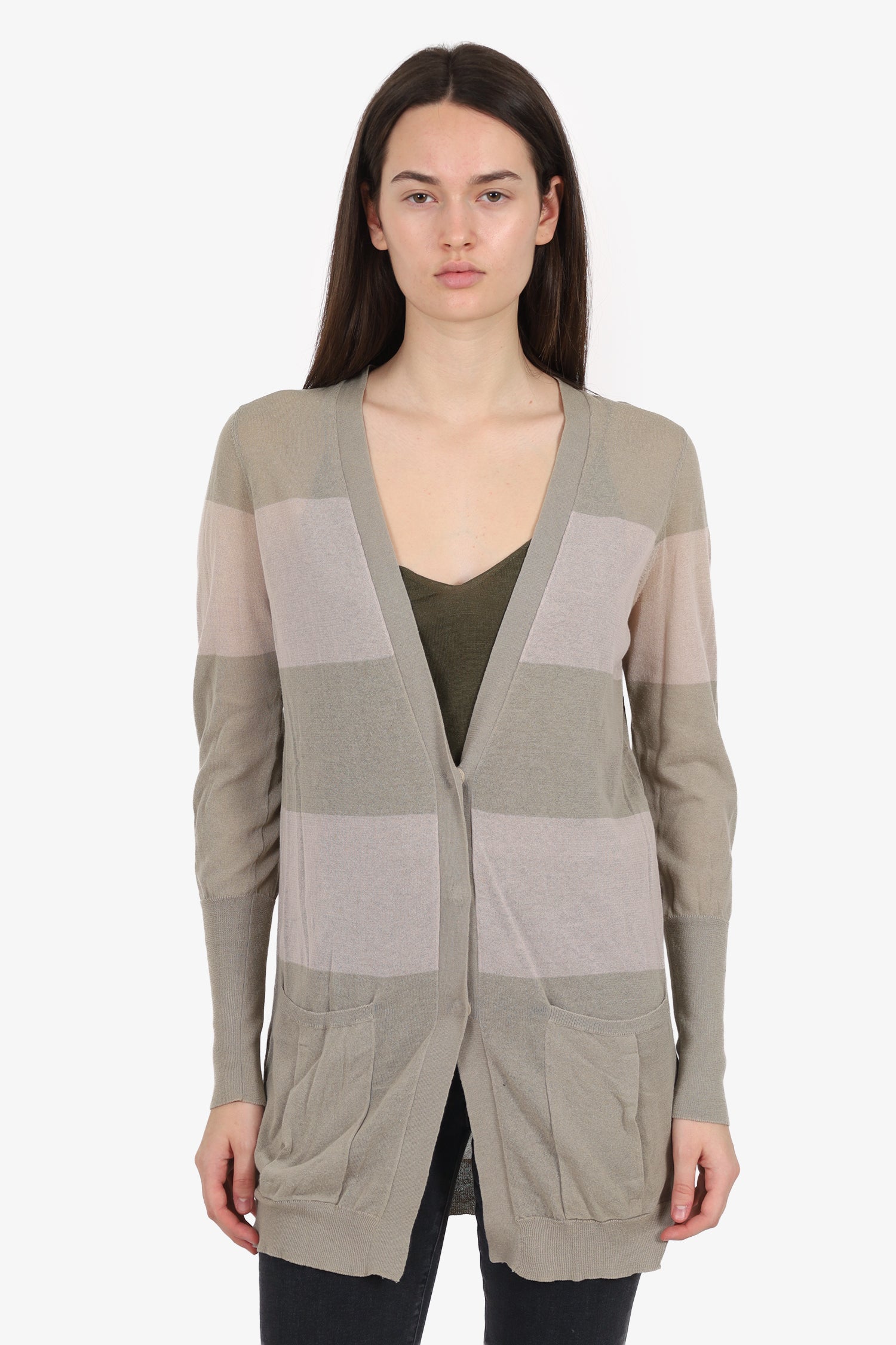 Refresh availabilityBrunello Cucinelli Taupe/Khaki Striped Cardigan. Pull-on. V-neckline. Front button-up closure. 2 front exterior slip pockets. Tonal stitching.