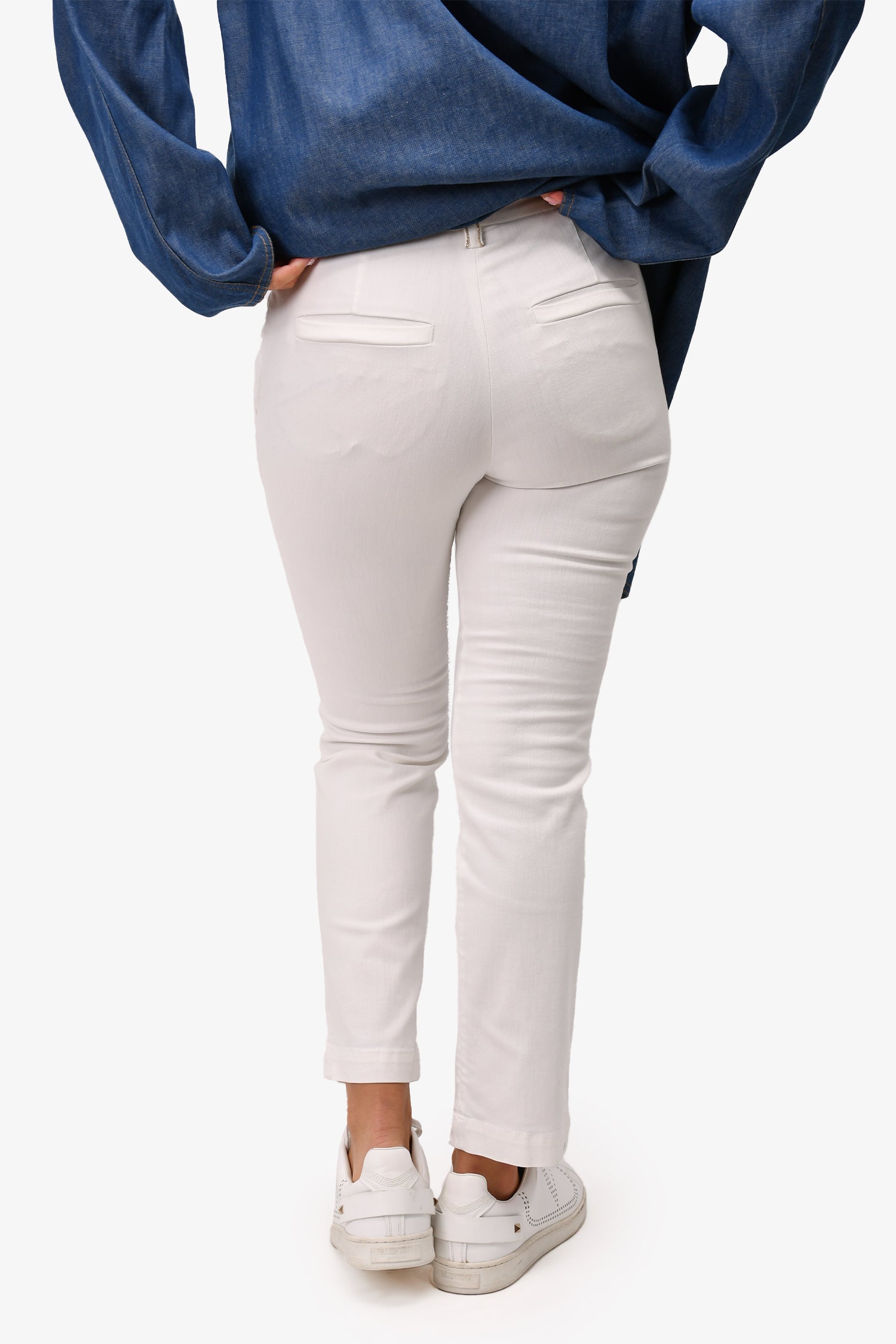 Refresh availabilityBrunello Cucinelli White Denim Beaded Detail Tapered Leg Pants. Front zip, hook and button closure. Front and rear pockets. Waist belt loops.