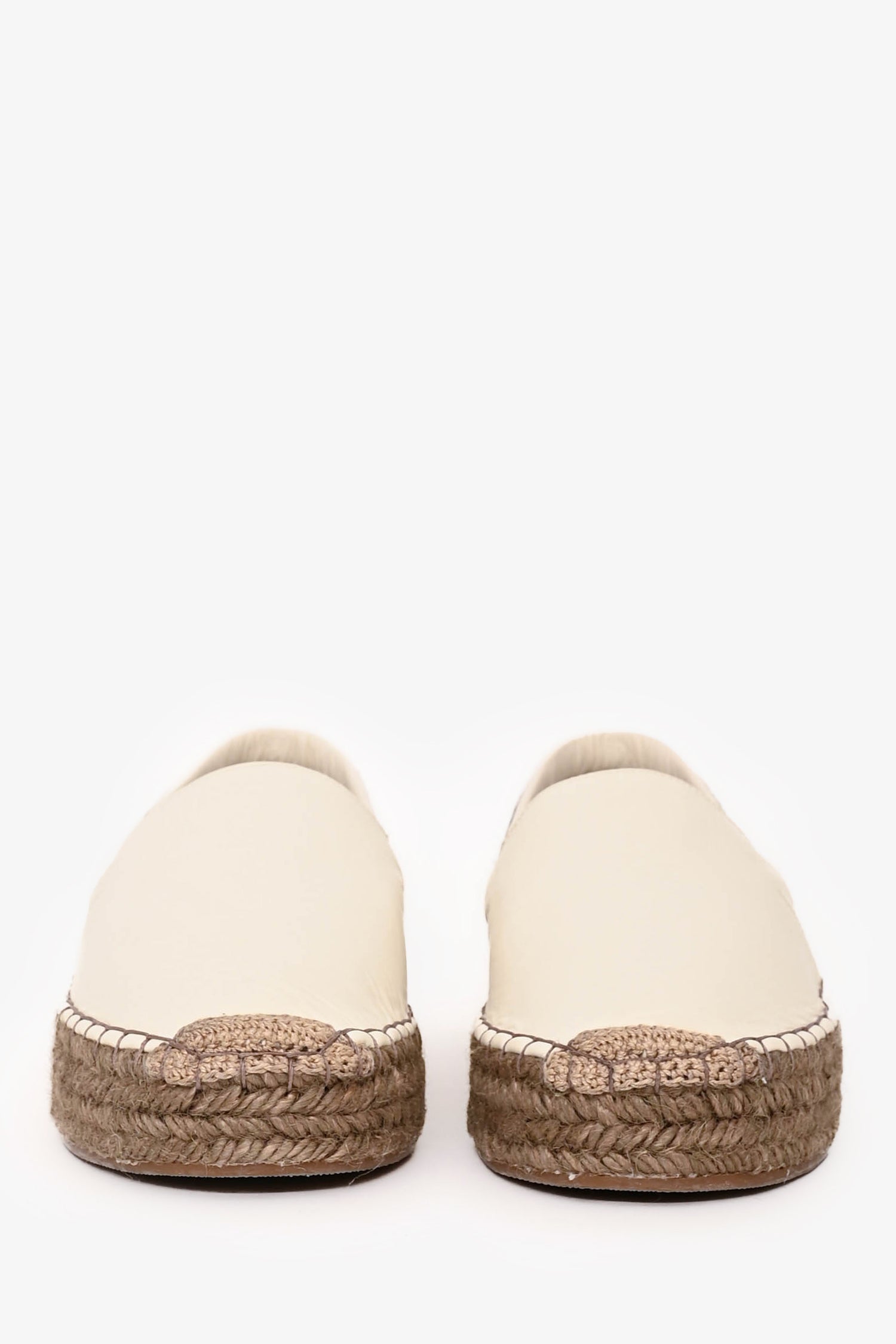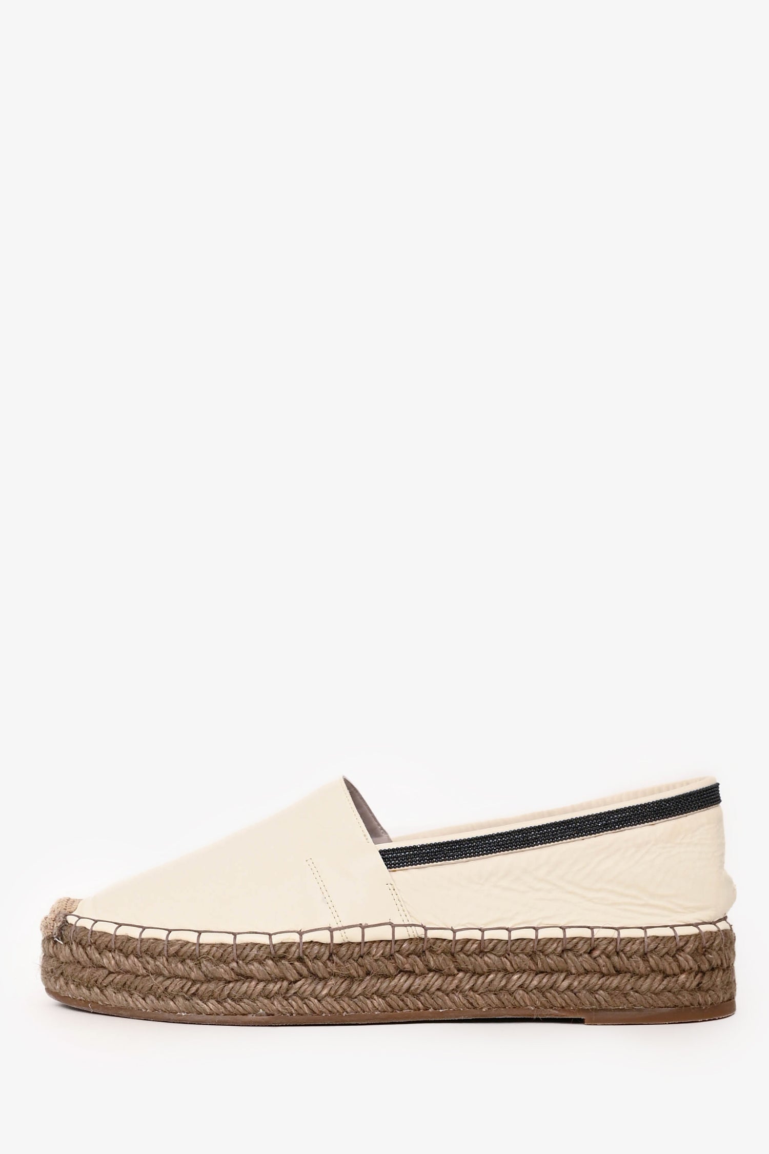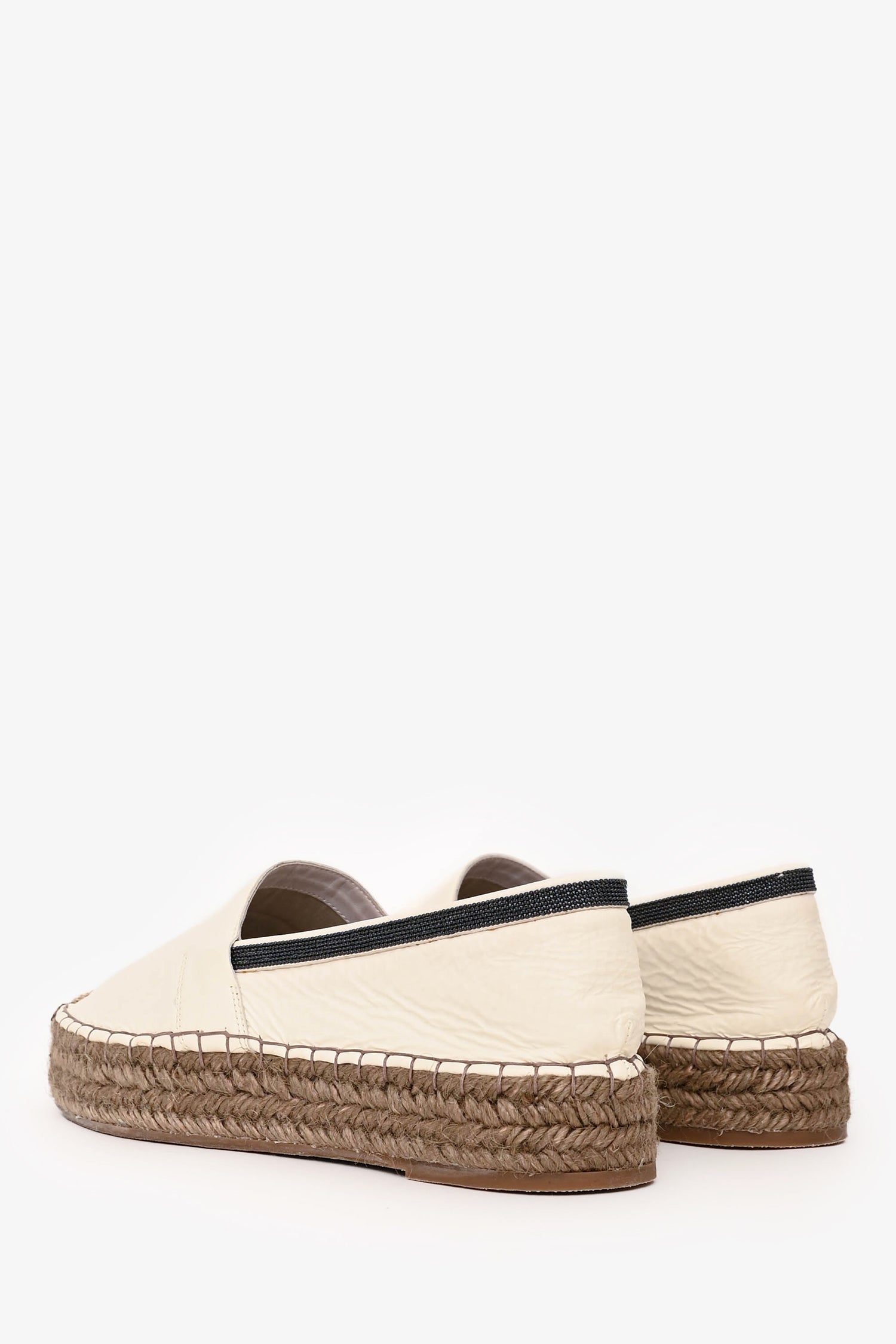 Refresh availabilityBrunello Cucinelli White Espadrilles. Round toe. Platform sole. Beaded detailing. Leather insole. Tonal and contrast stitching.
