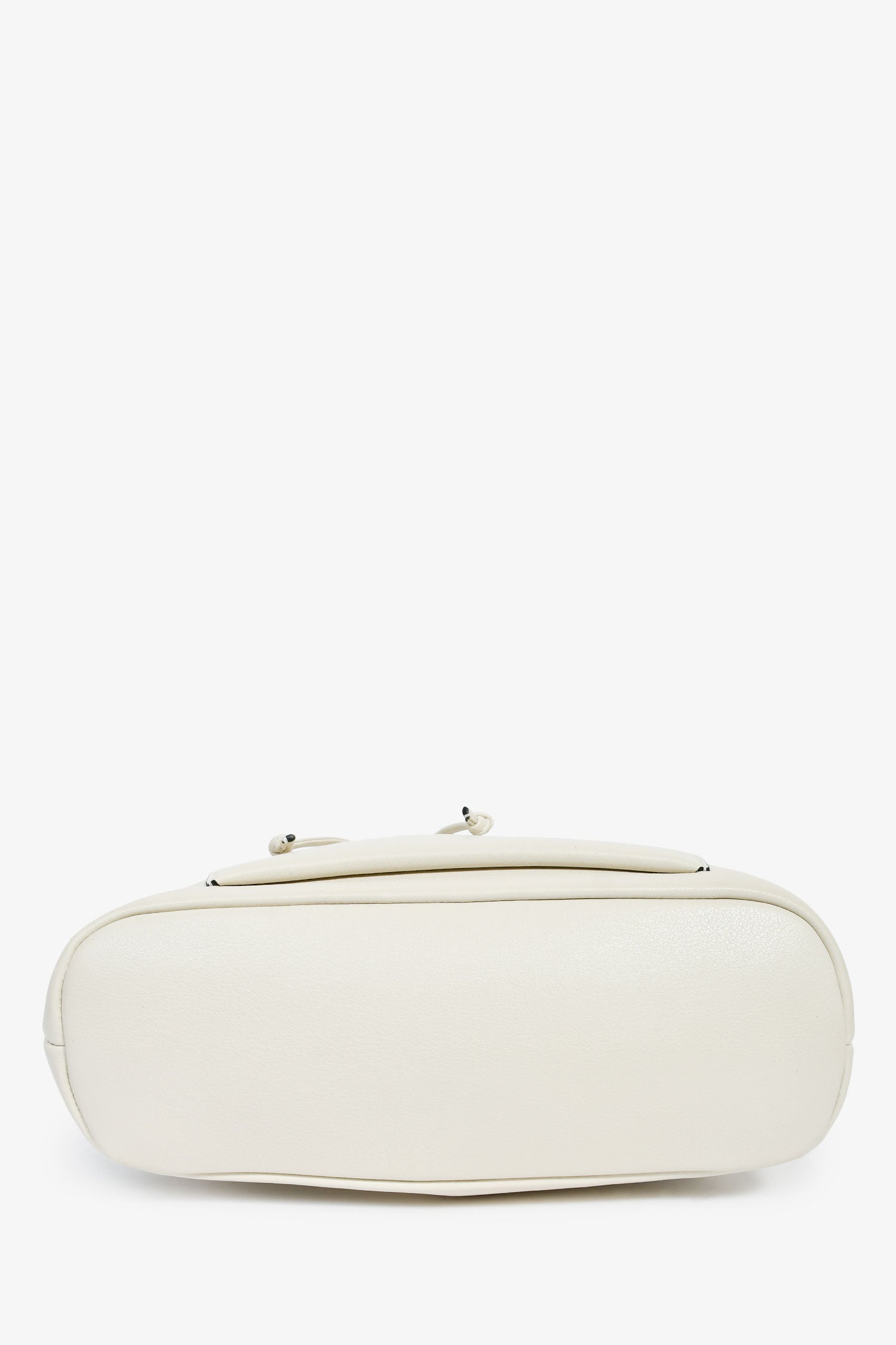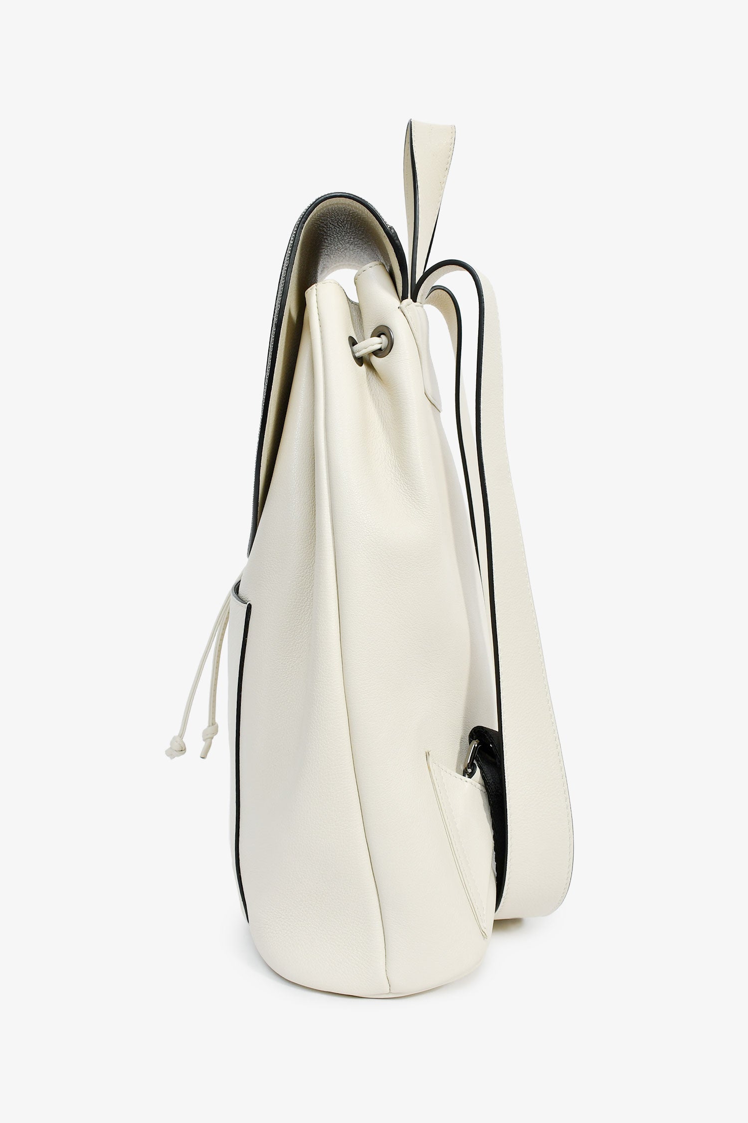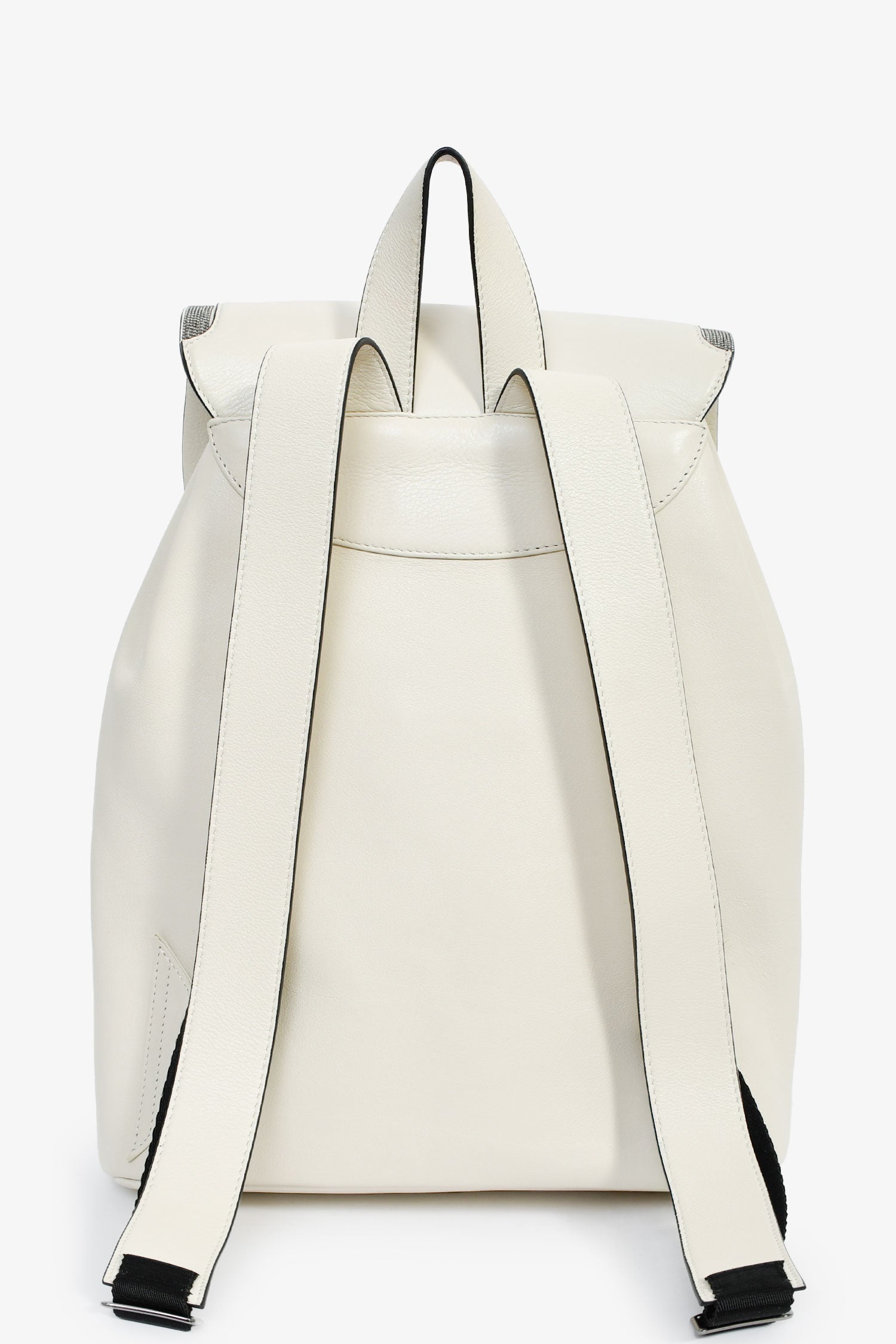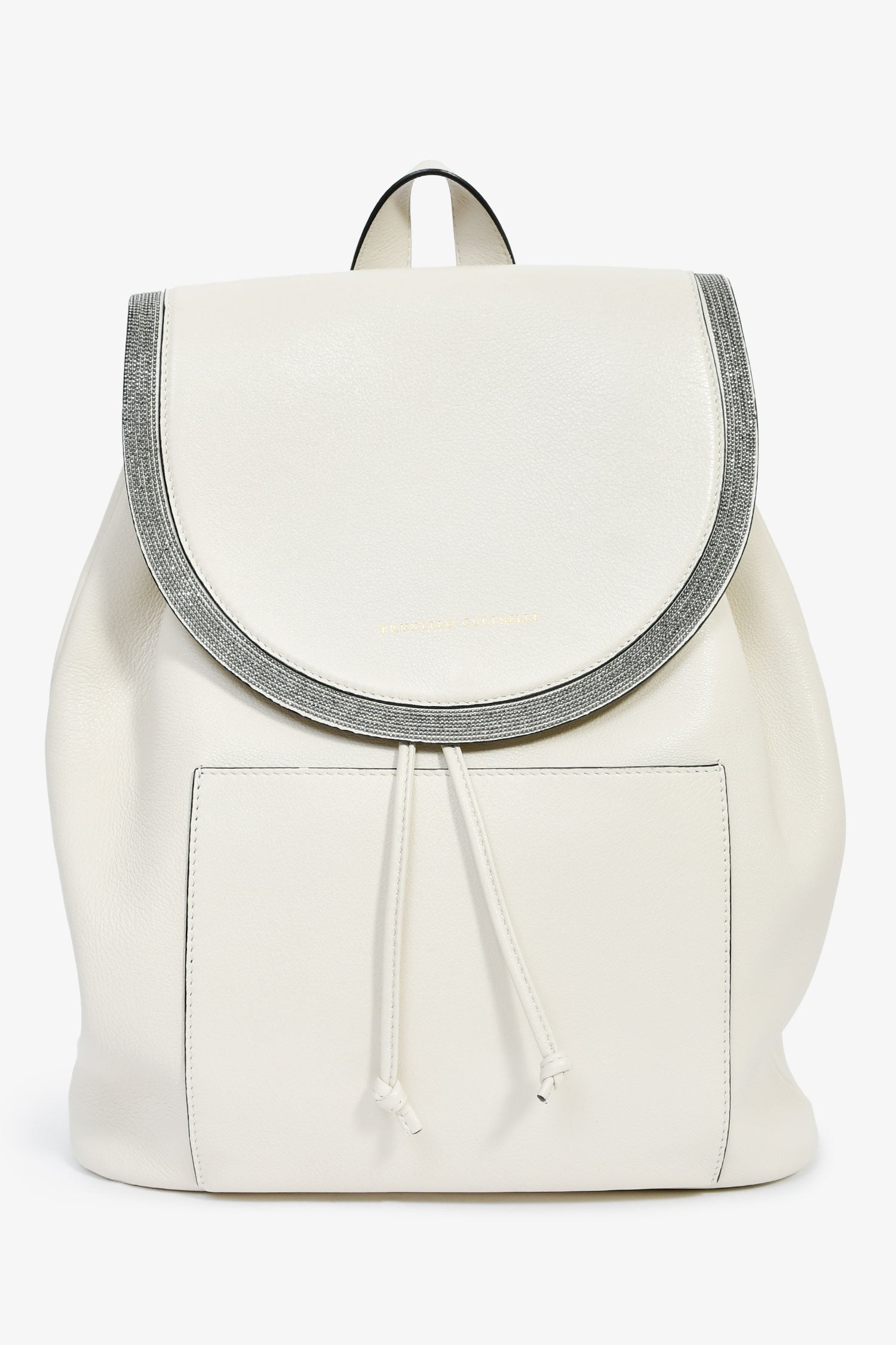 Refresh availabilityBrunello Cucinelli White Leather Monili Backpack. Front fold-over flap with magnetic closure. Cinch drawstring closure underneath fold-over flap. Top handle. Front exterior slip pocket. Open interior with 1 zip and 2 slip pockets. Front exterior compartment with zipper closure. Silver-tone hardware. Tonal stitching.