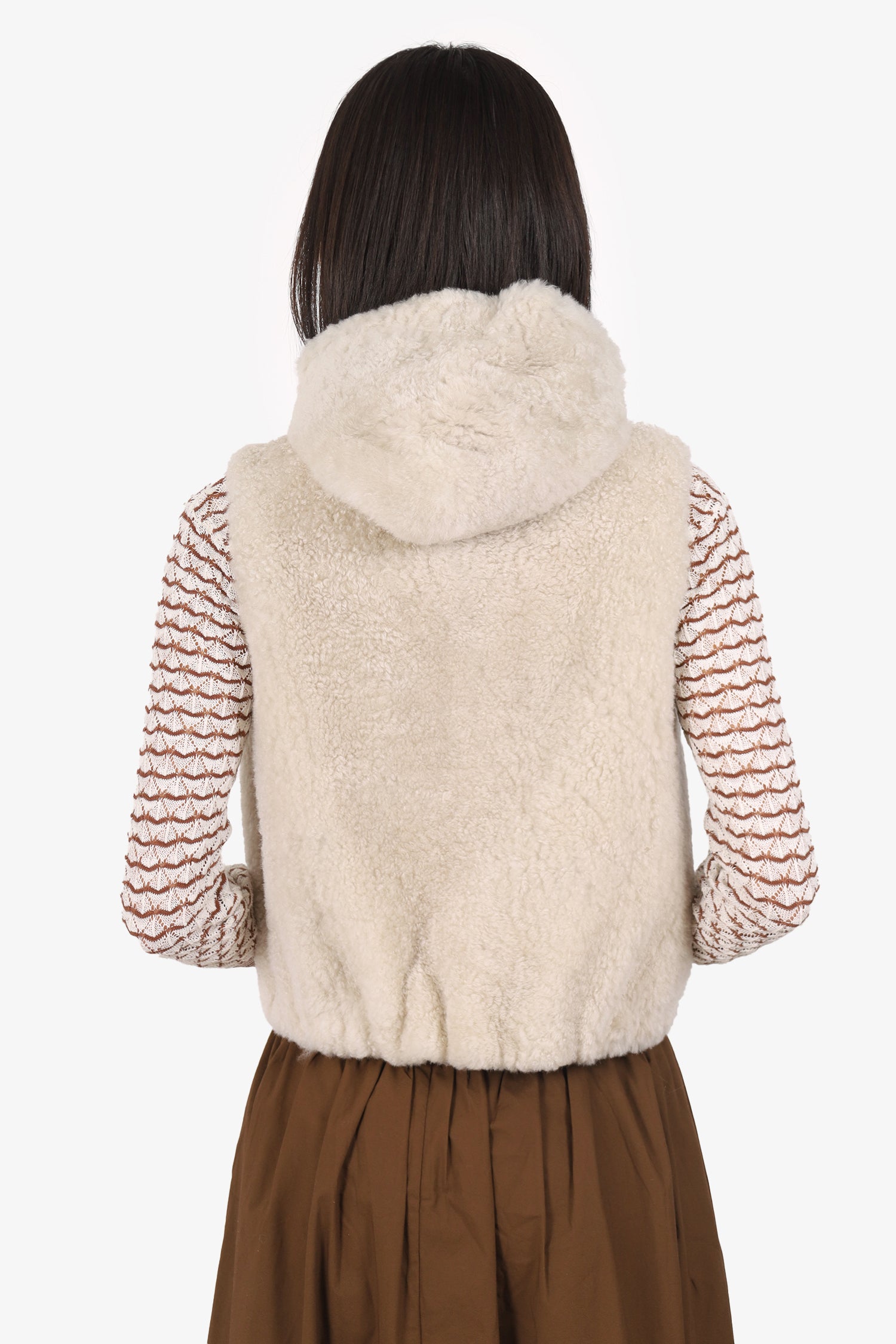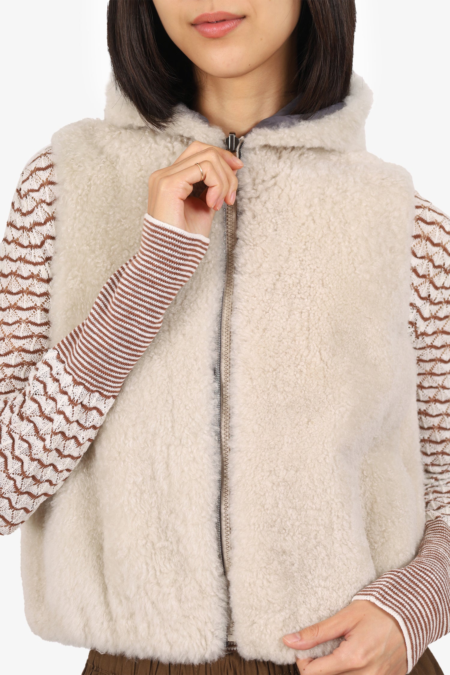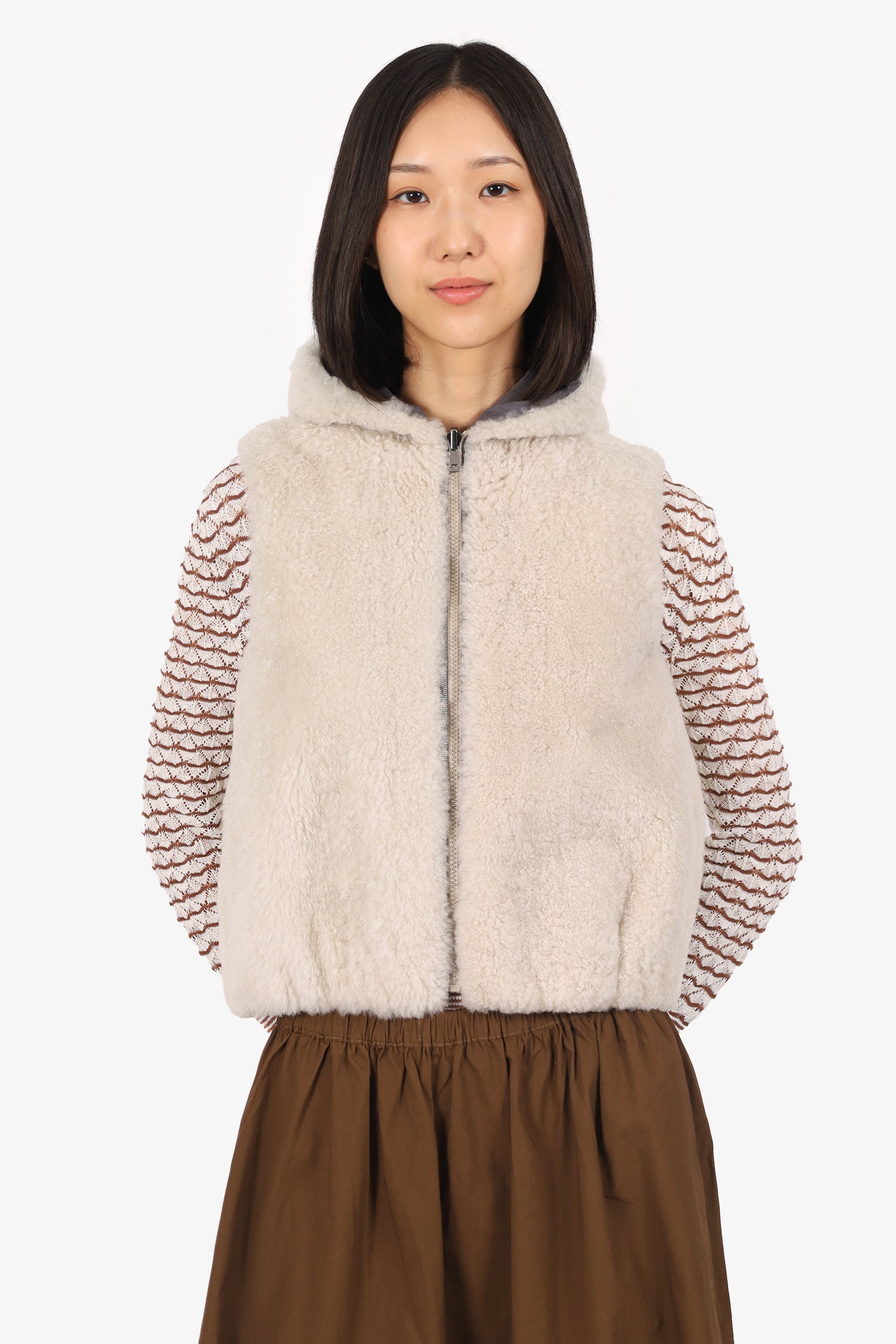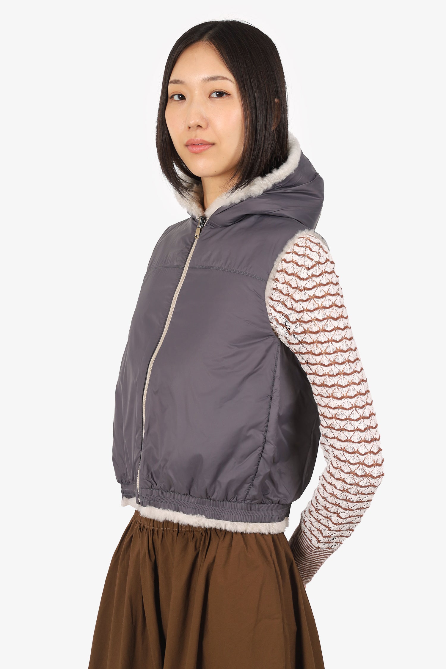 Brunello Cucinelli White/Grey Cashmere Shearling Reversible Hooded Vest Size 10