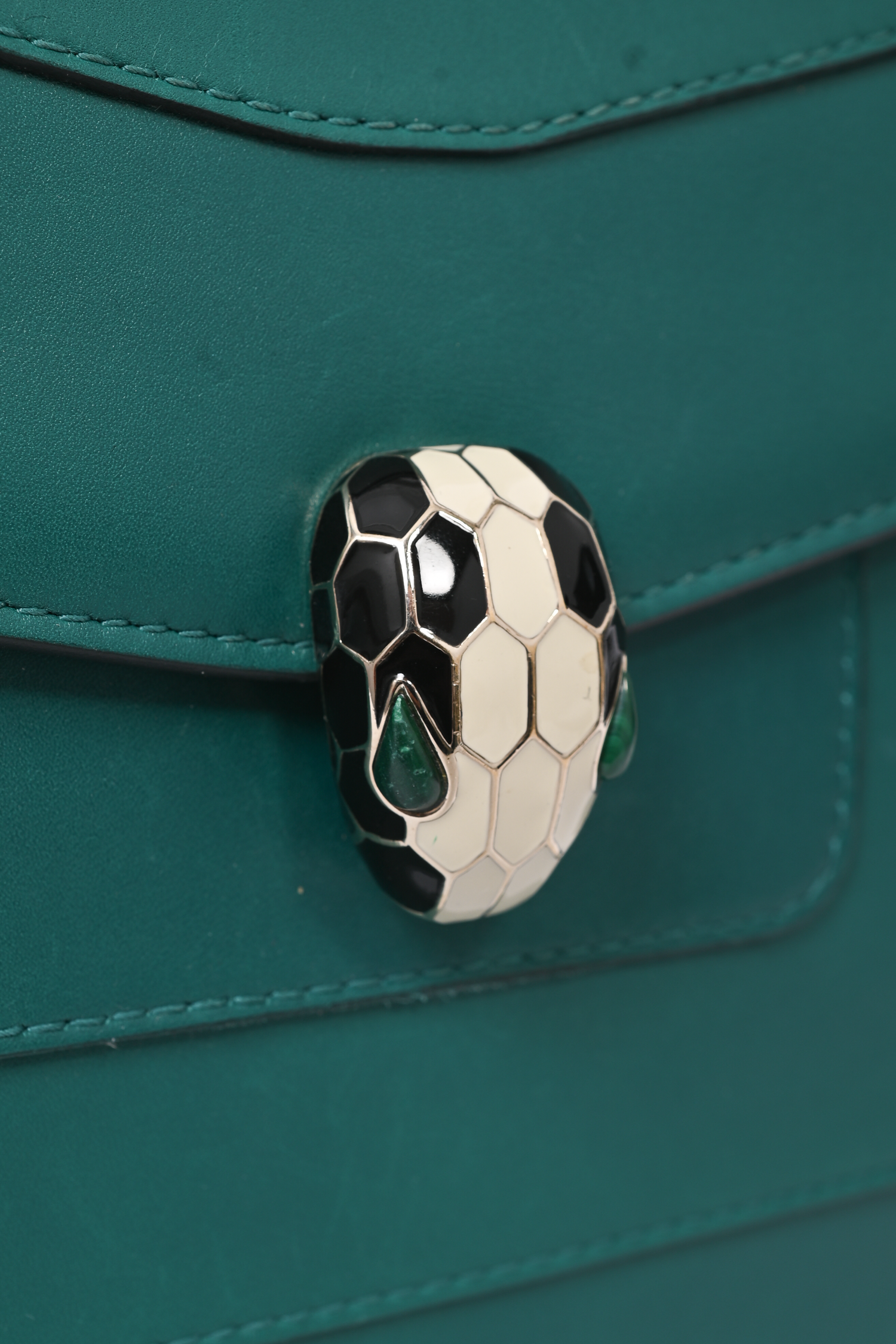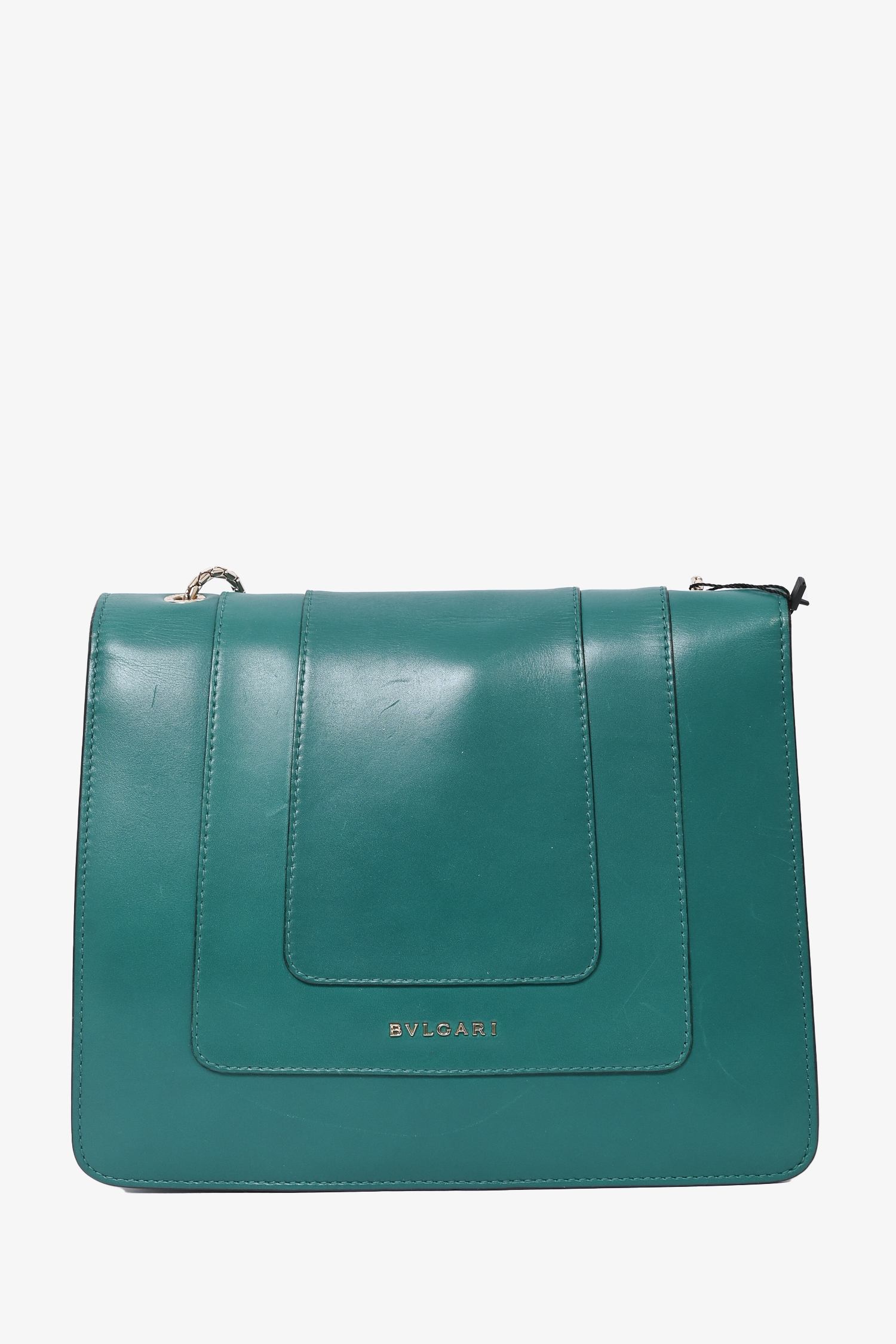 Refresh availabilityBulgari Green Leather Medium Serpentine Forever Crossbody Bag. Fold-over flap with button closure. 1 interior zip pocket. 1 interior slip pocket. Round pocket mirror included. Silver-tone hardware. Tonal stitching.
