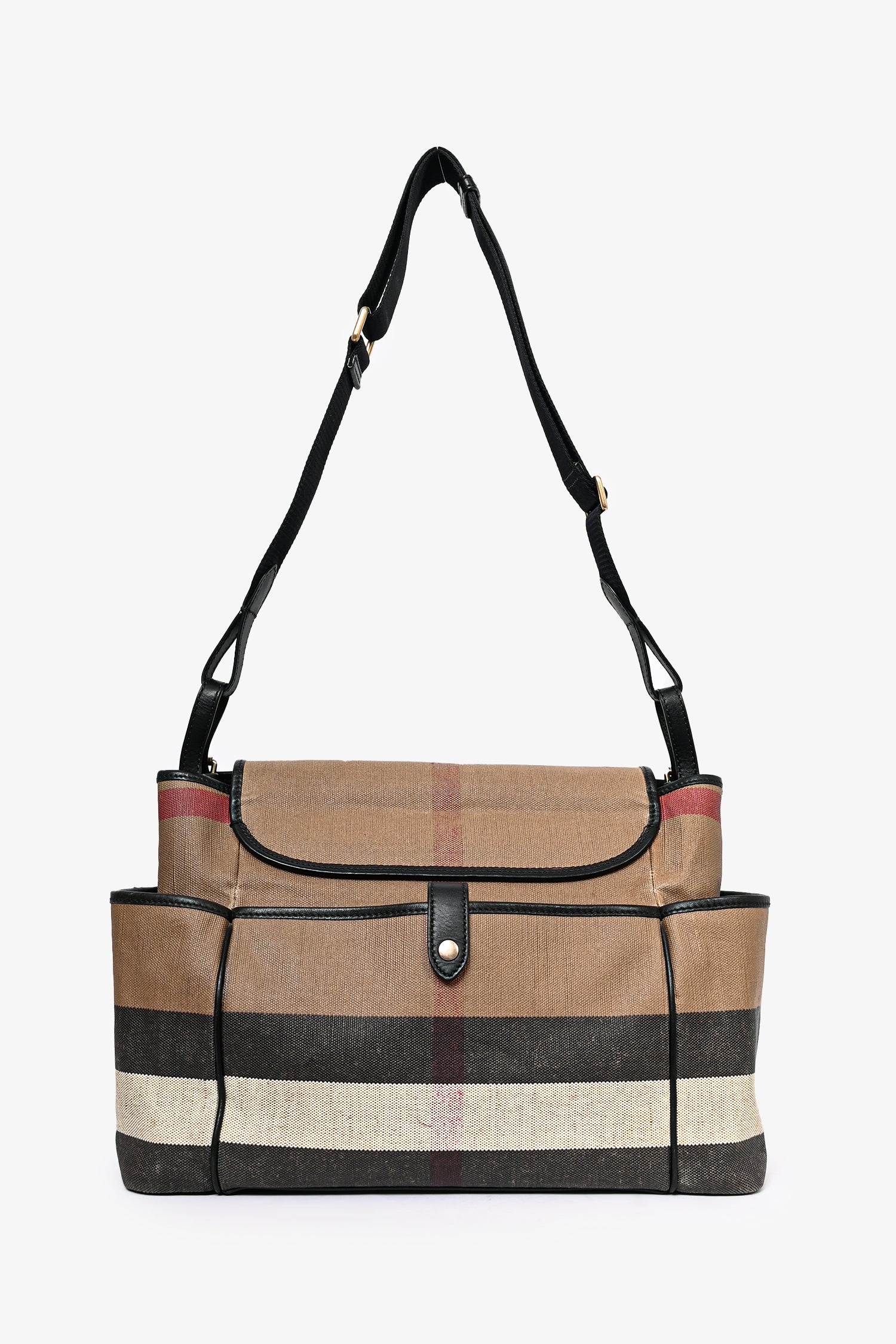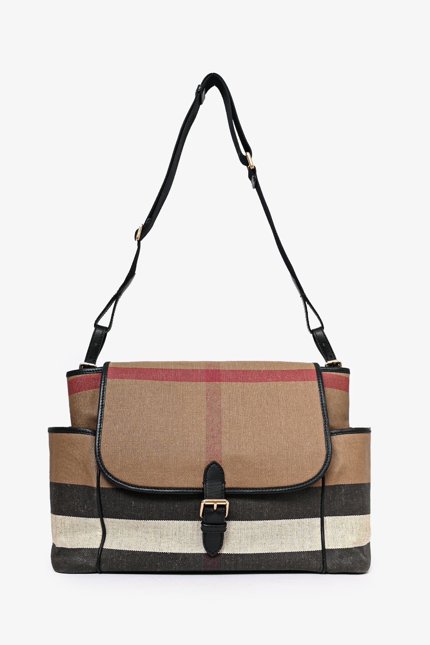 Refresh availabilityBurberry 2018 Beige Novacheck Diaper Bag. Dual handles. Top two-way zip closure. Black logo'd textile interior lining. Protective metal bottom. Bottom compartment with zip closure. Tonal stitching.