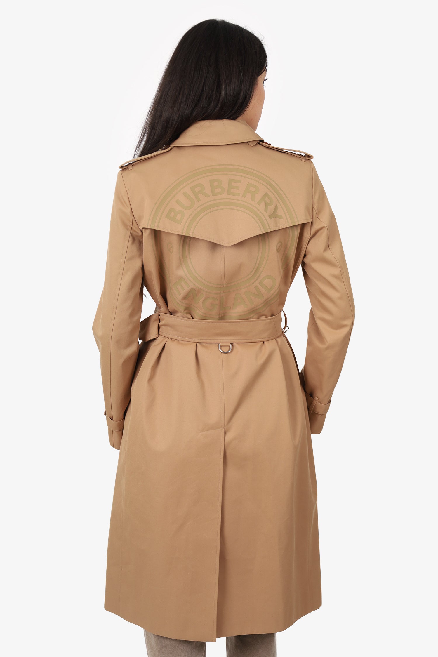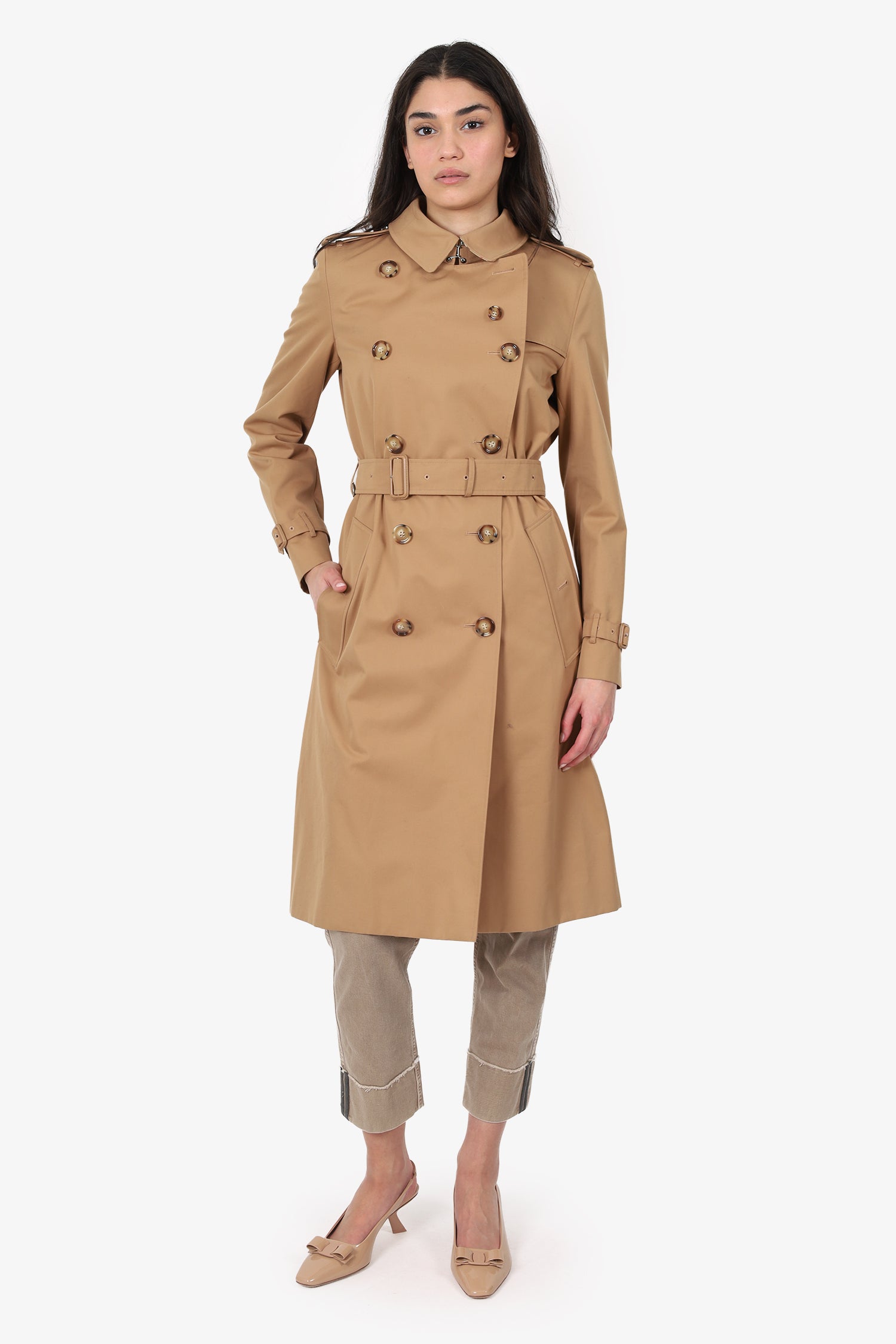 Refresh availabilityBurberry Beige Belted Trench Coat. Pull-on. Collared neckline. Front button-up with hook closure. Removable belt with adjustable pull-through buckle closure. Button-up closure to shoulders. Sleeve cuffs with adjustable pull-through buckle closure. 2 exterior side button-up pockets. Single rear slit. Lined interior. Silver-tone hardware. Tonal stitching.