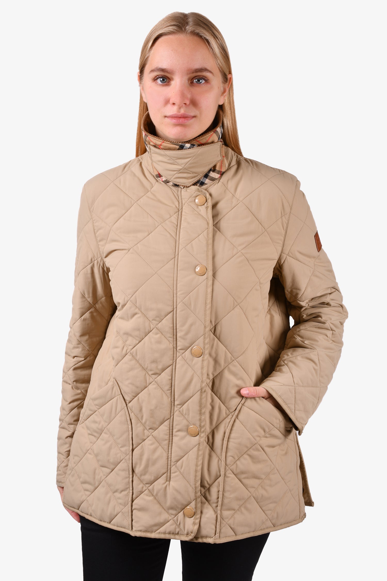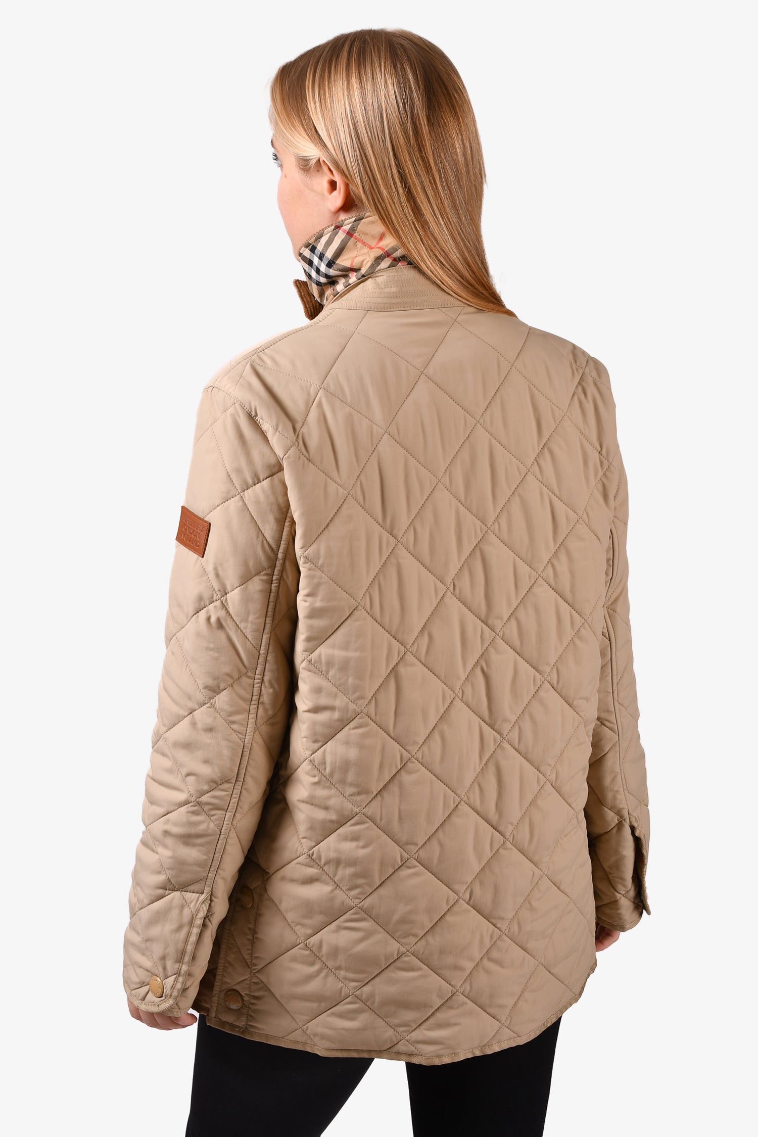 Refresh availabilityBurberry Beige/Brown Quilted Corduroy Collar Zip-Up Jacket. Front snap-button closure. Signature nova check interior lining. Tonal stitching.
