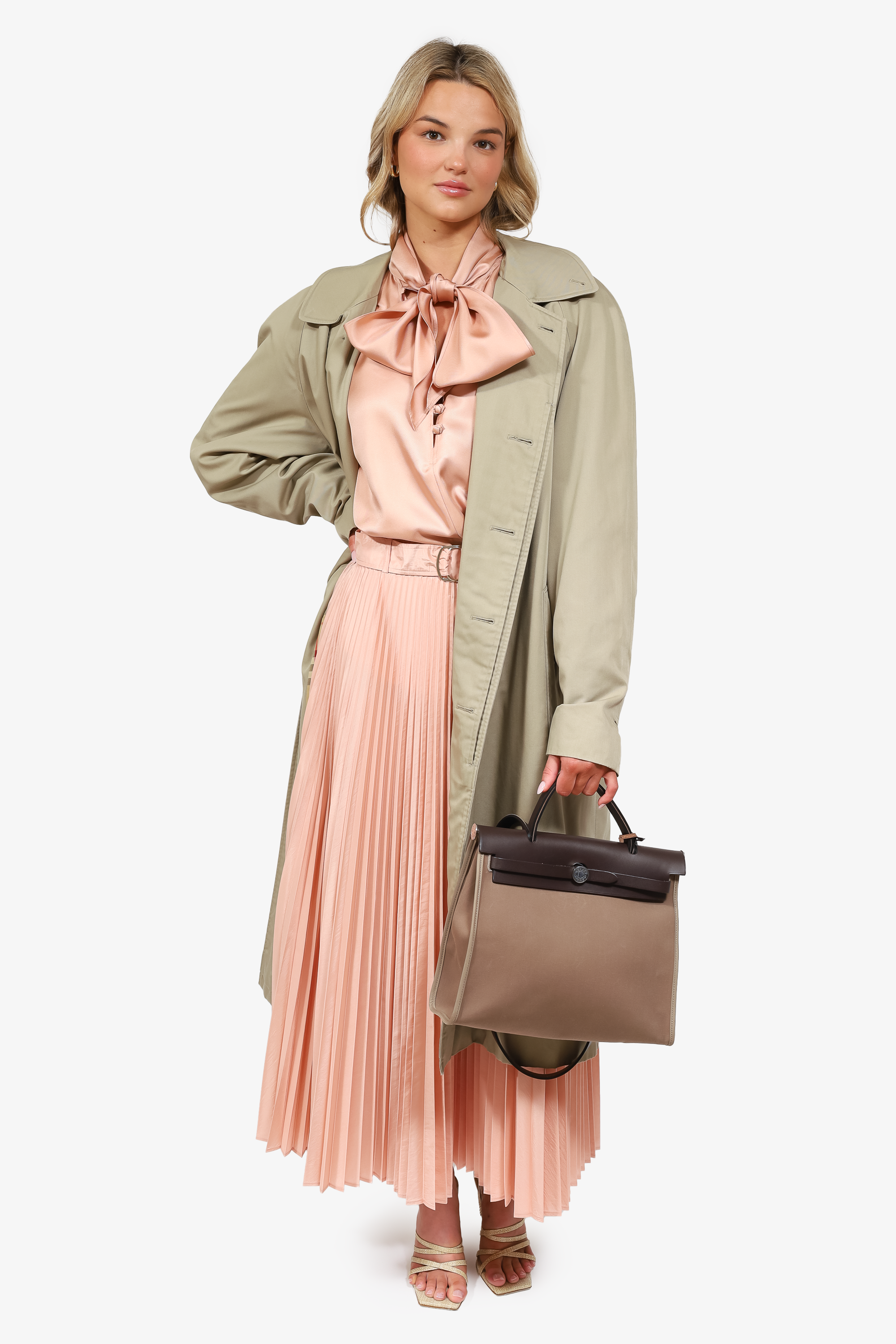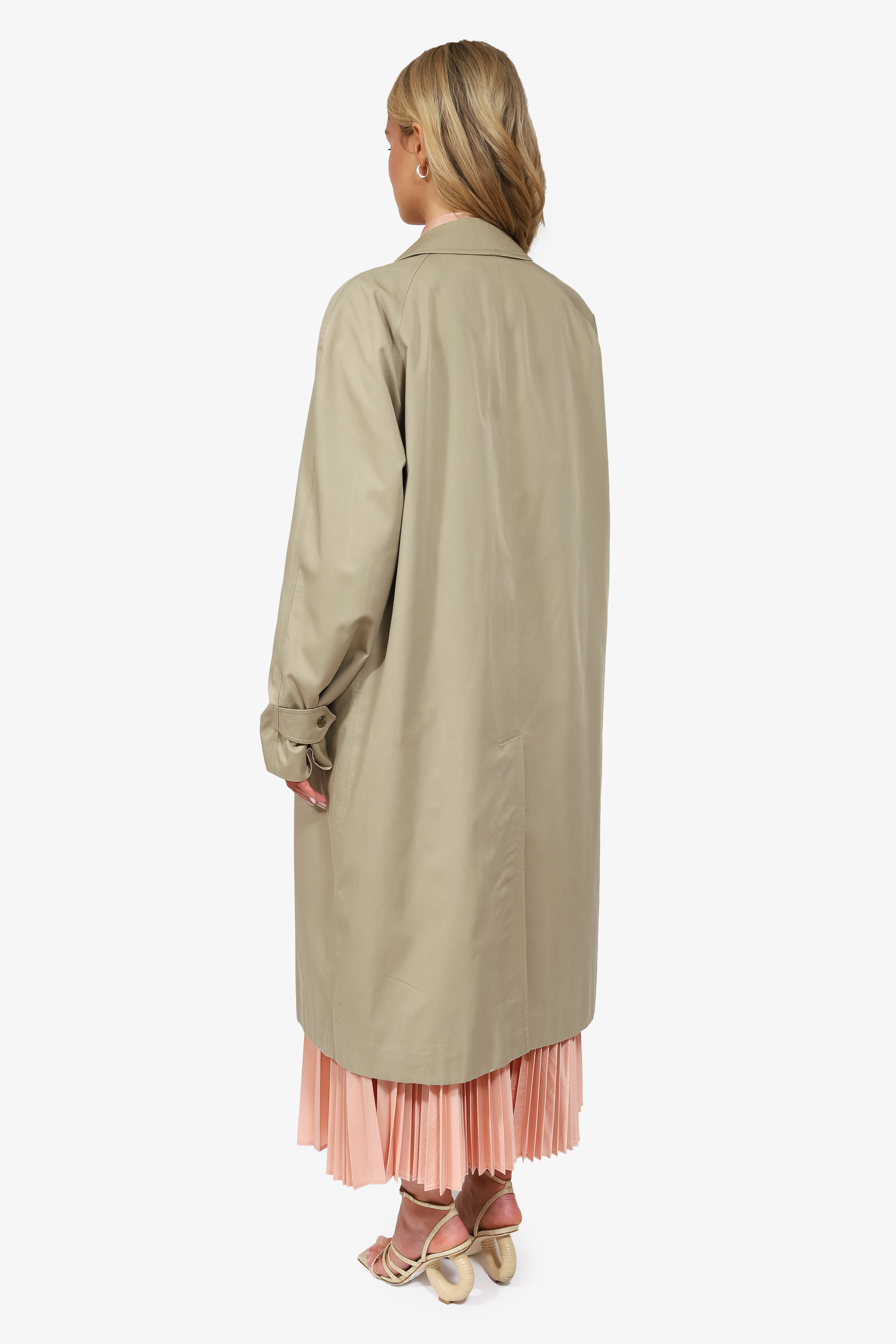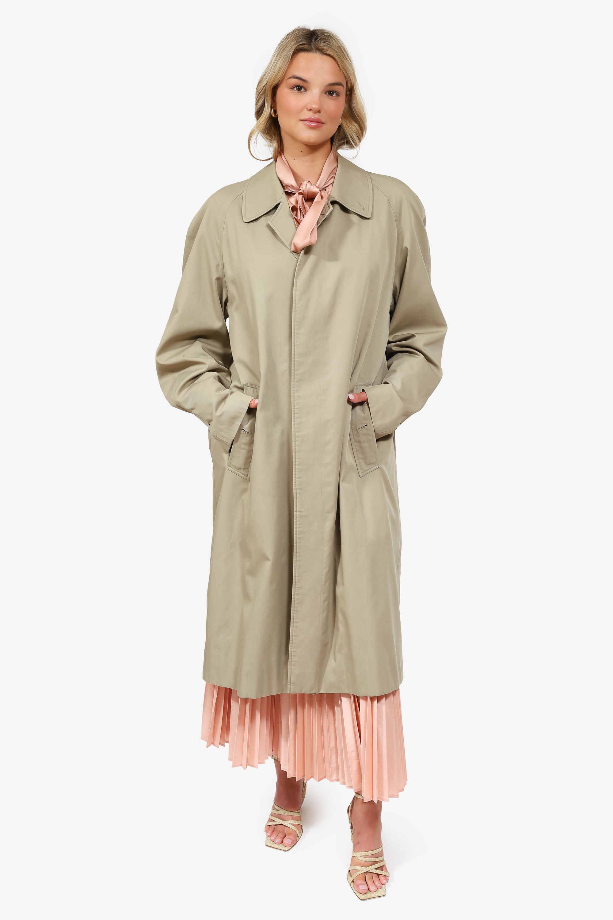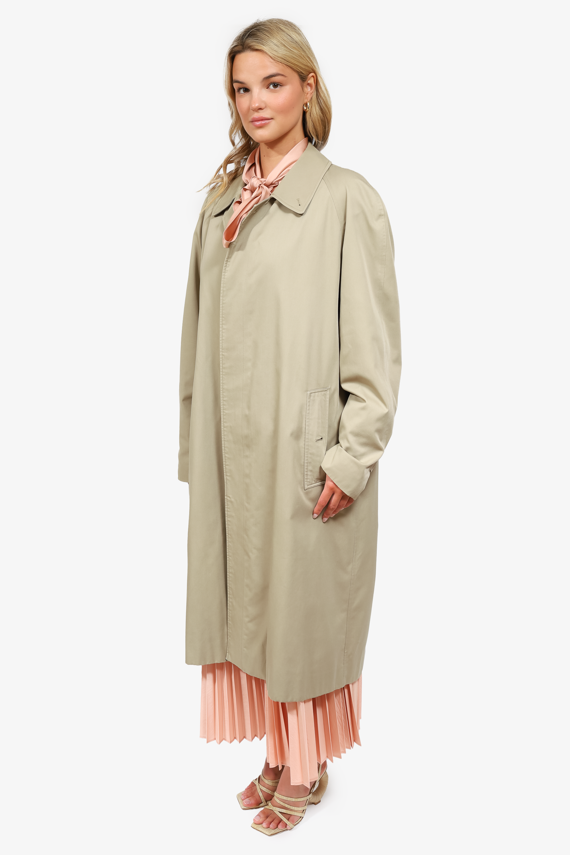 Refresh availabilityBurberry Beige Button Down Trench Coat. Front button up closure. Single button up on sleeve cuffs. Slip pockets on either side with button up closure. Slit on bottom back of jacket with button up closure. Lined. Tonal stitching.