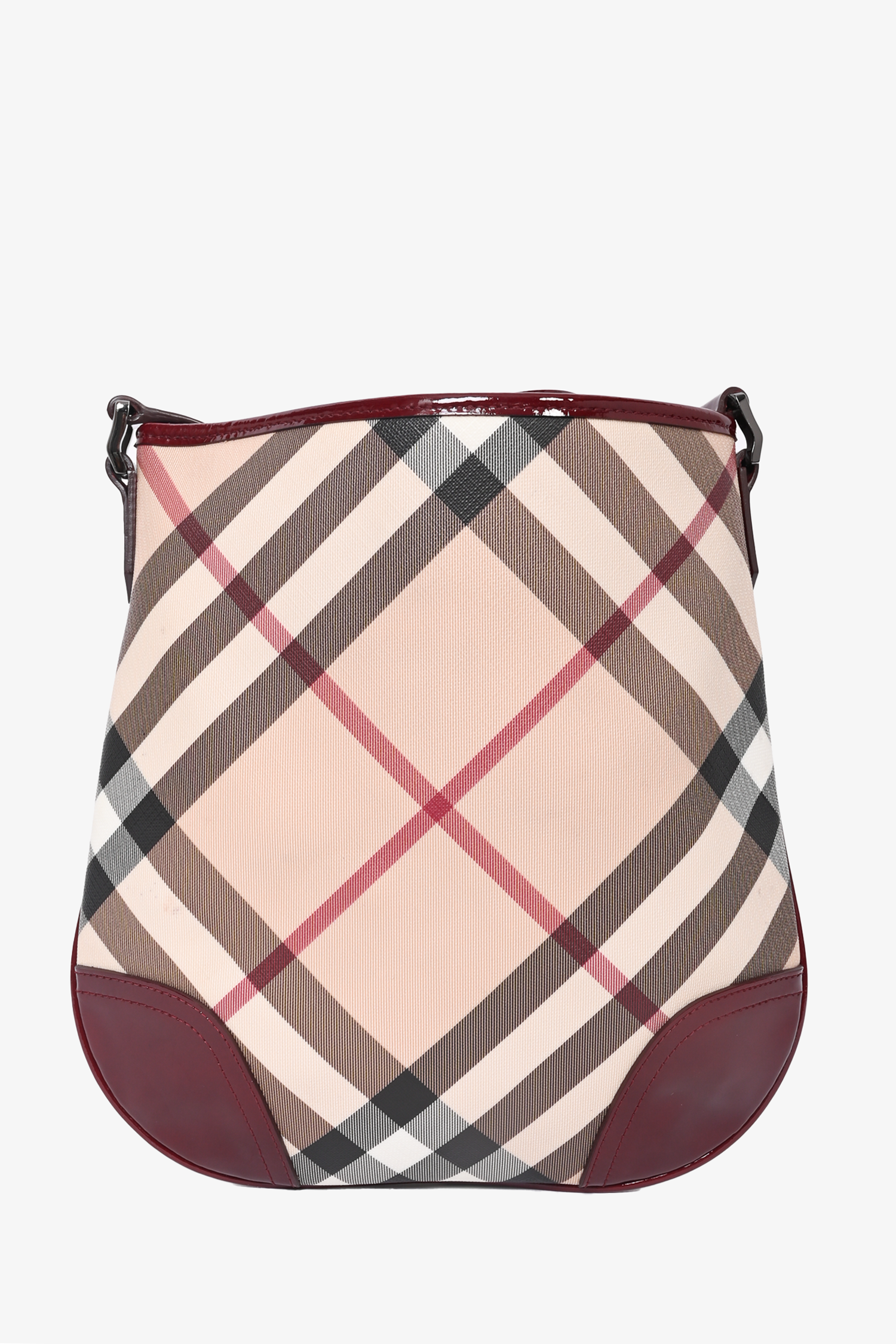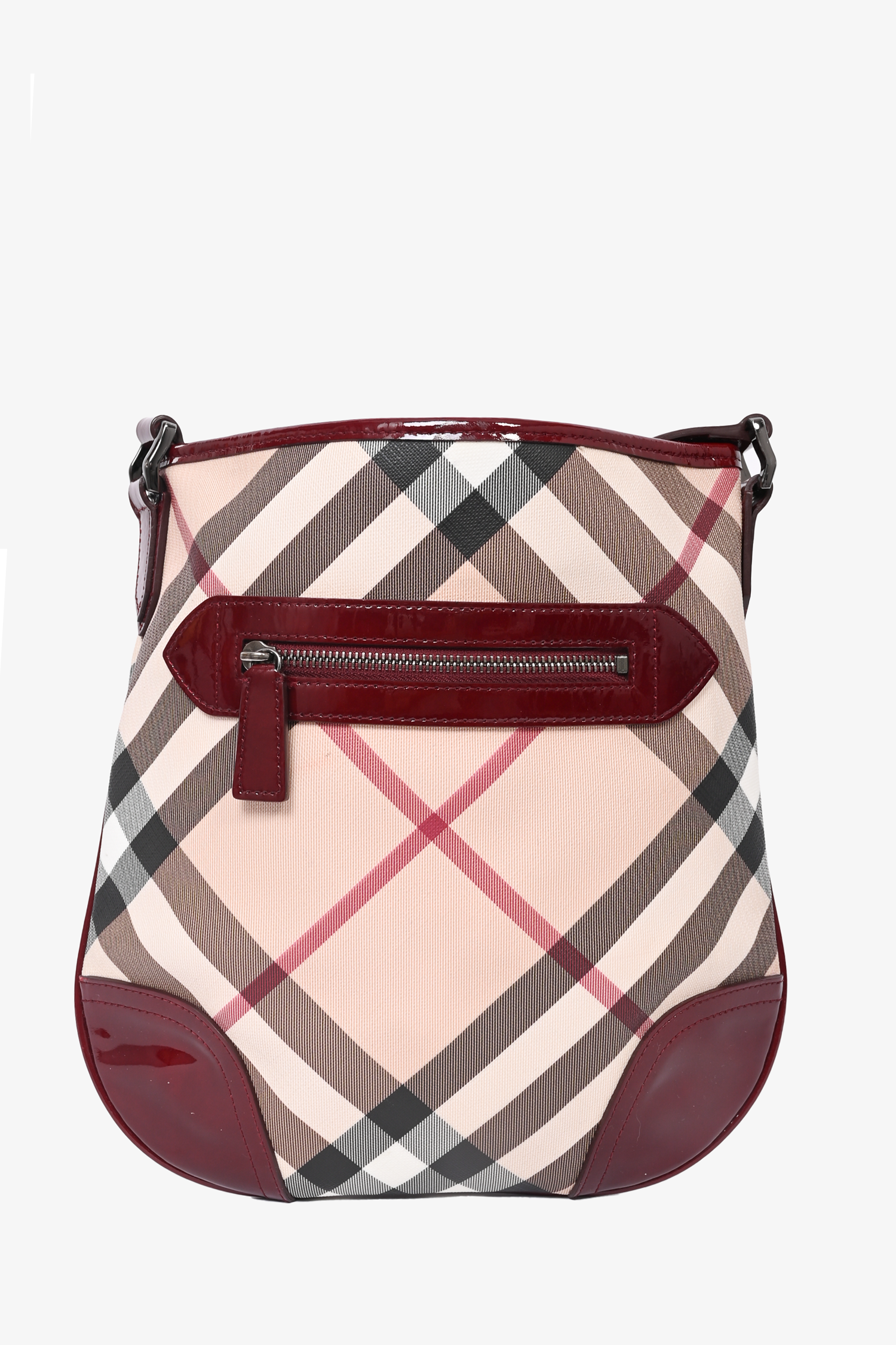 Refresh availabilityBurberry Beige Check Messenger Bag with Burgundy Patent Leather Trim. Top zip closure. 1 interior zip pocket. 2 interior slip pockets. Tonal stitching.