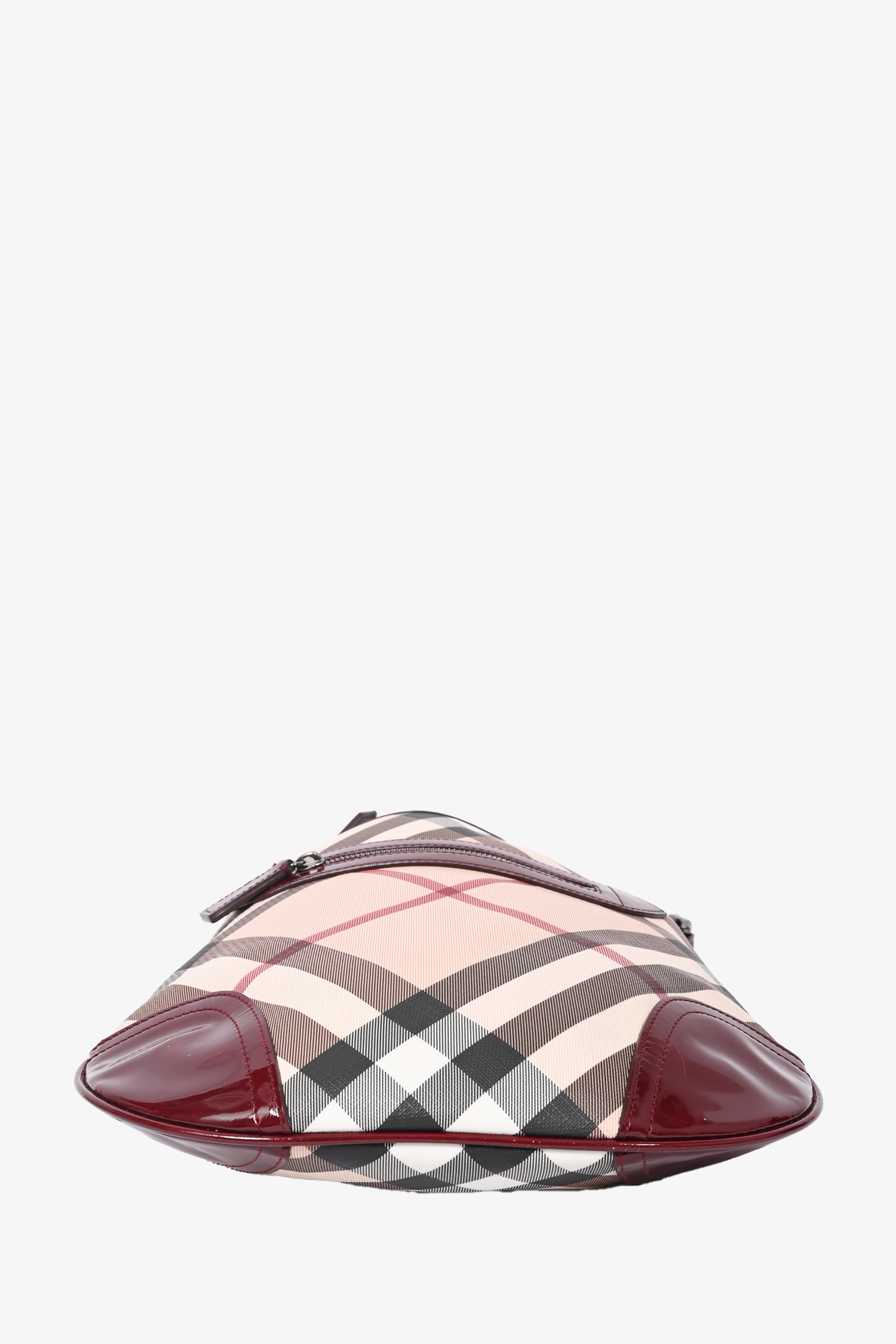 Burberry Beige Check Messenger Bag with Burgundy Patent Leather Trim