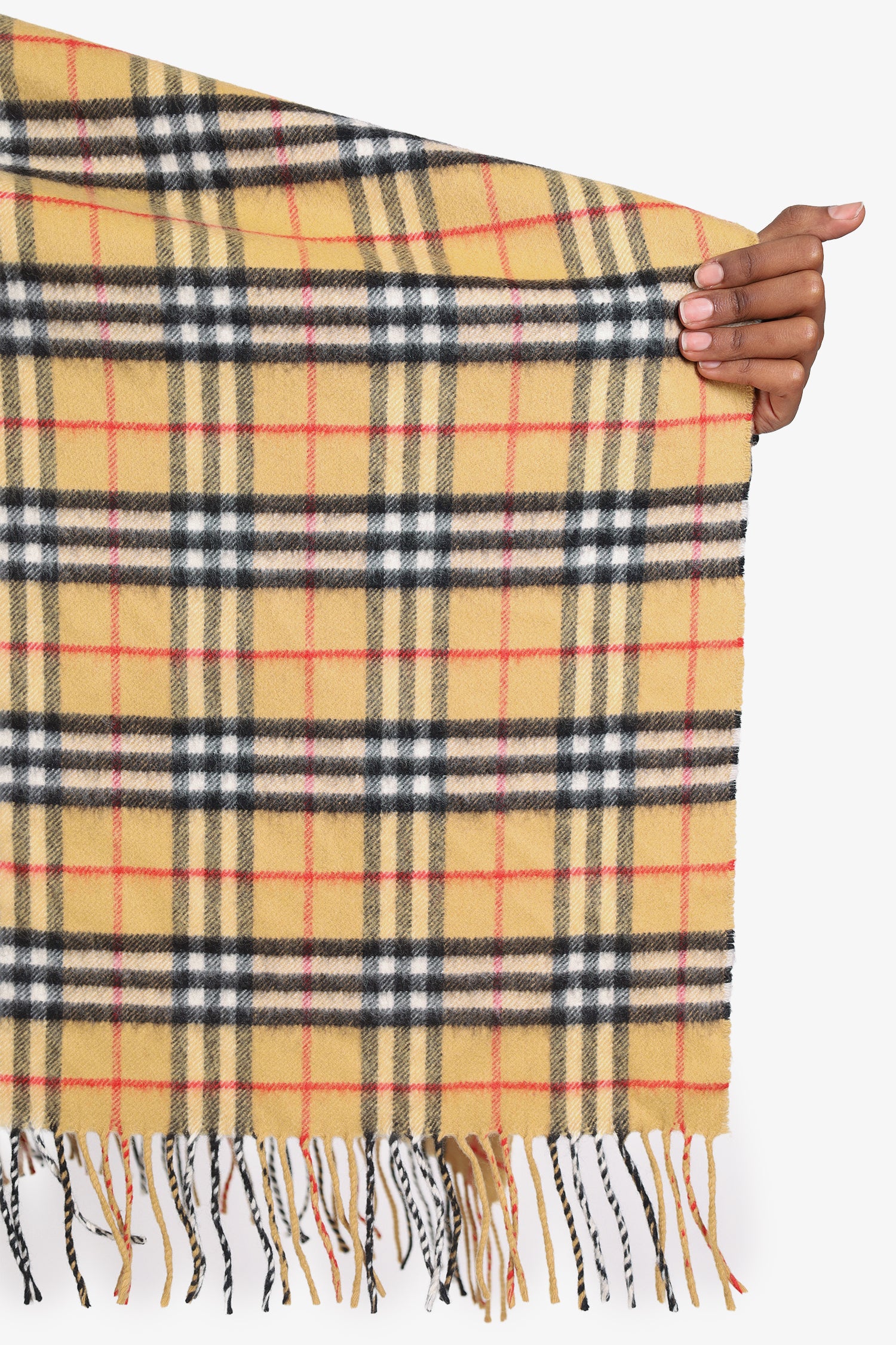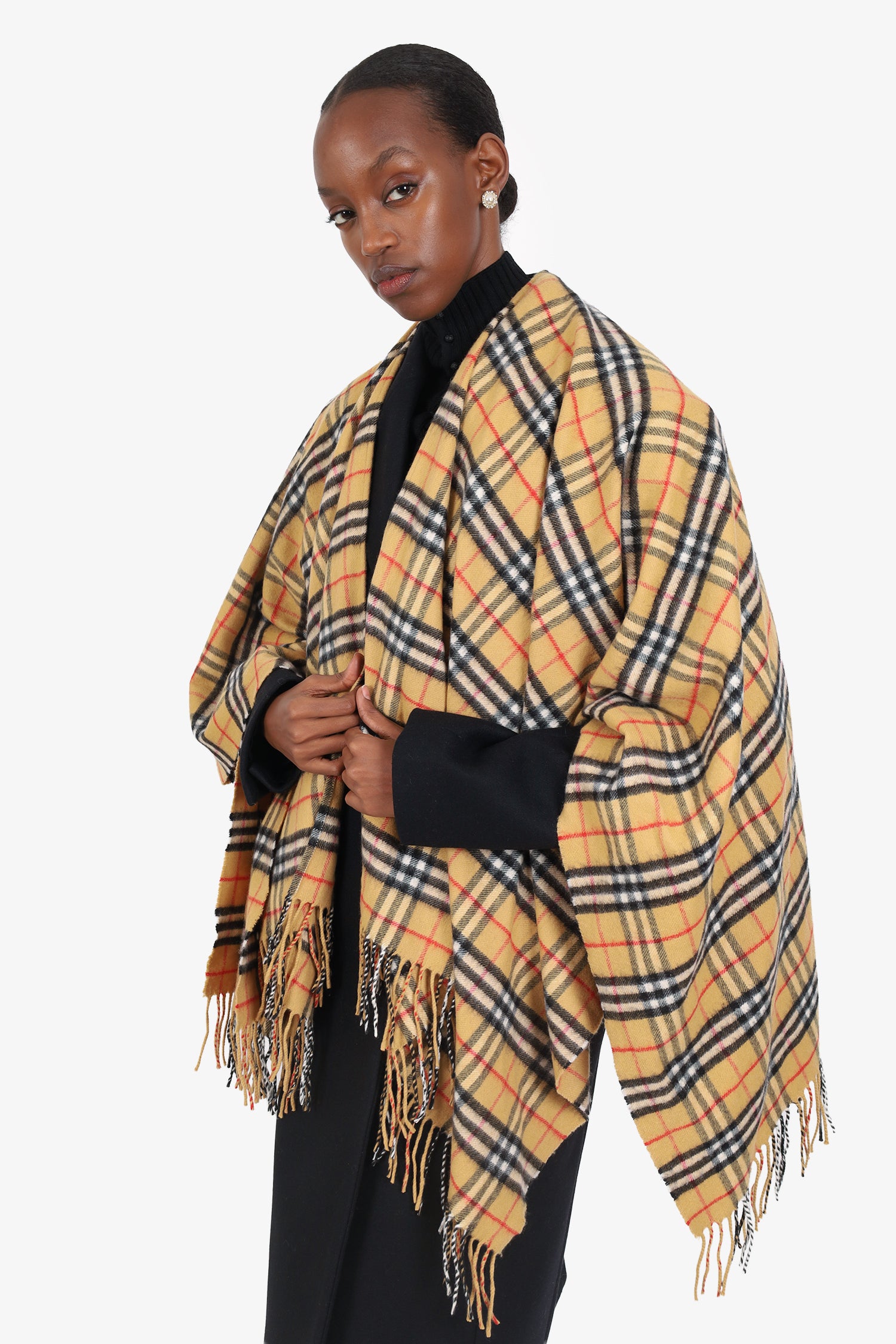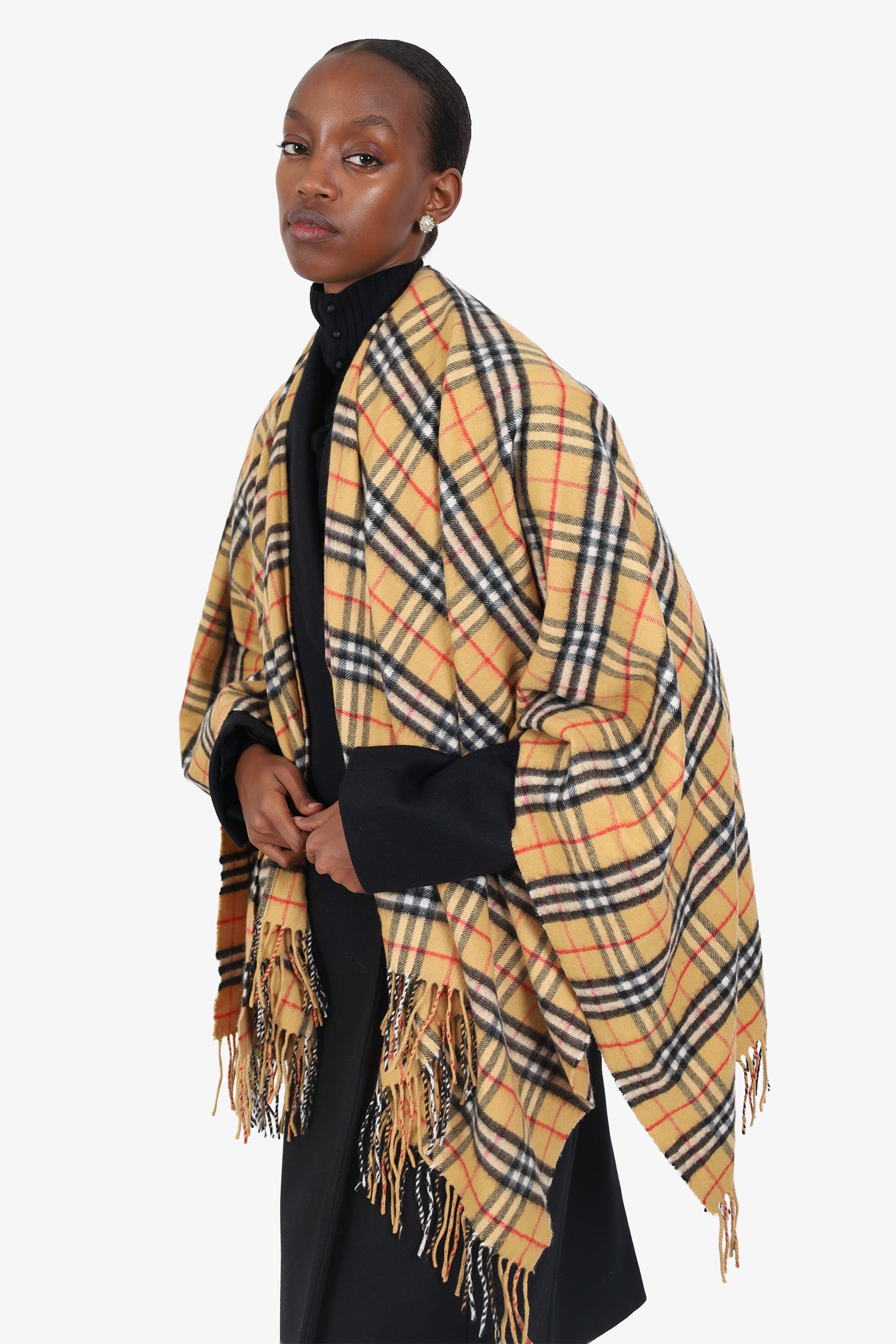 Refresh availabilityBurberry Beige Check Wool/Cashmere Fringed Cape. Fringe ends. Tonal stitching.