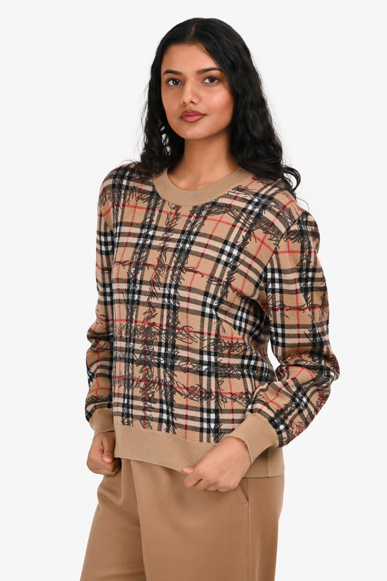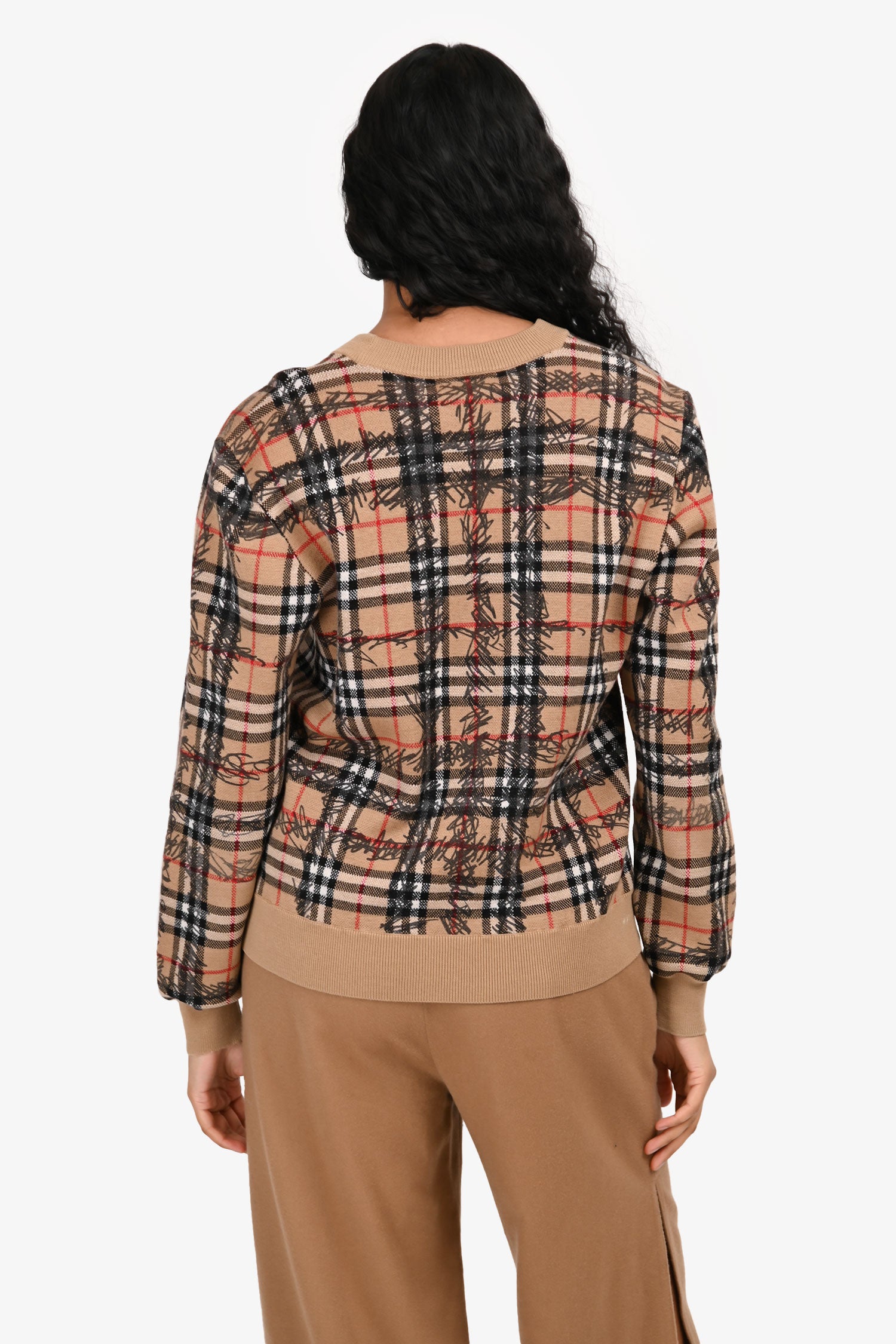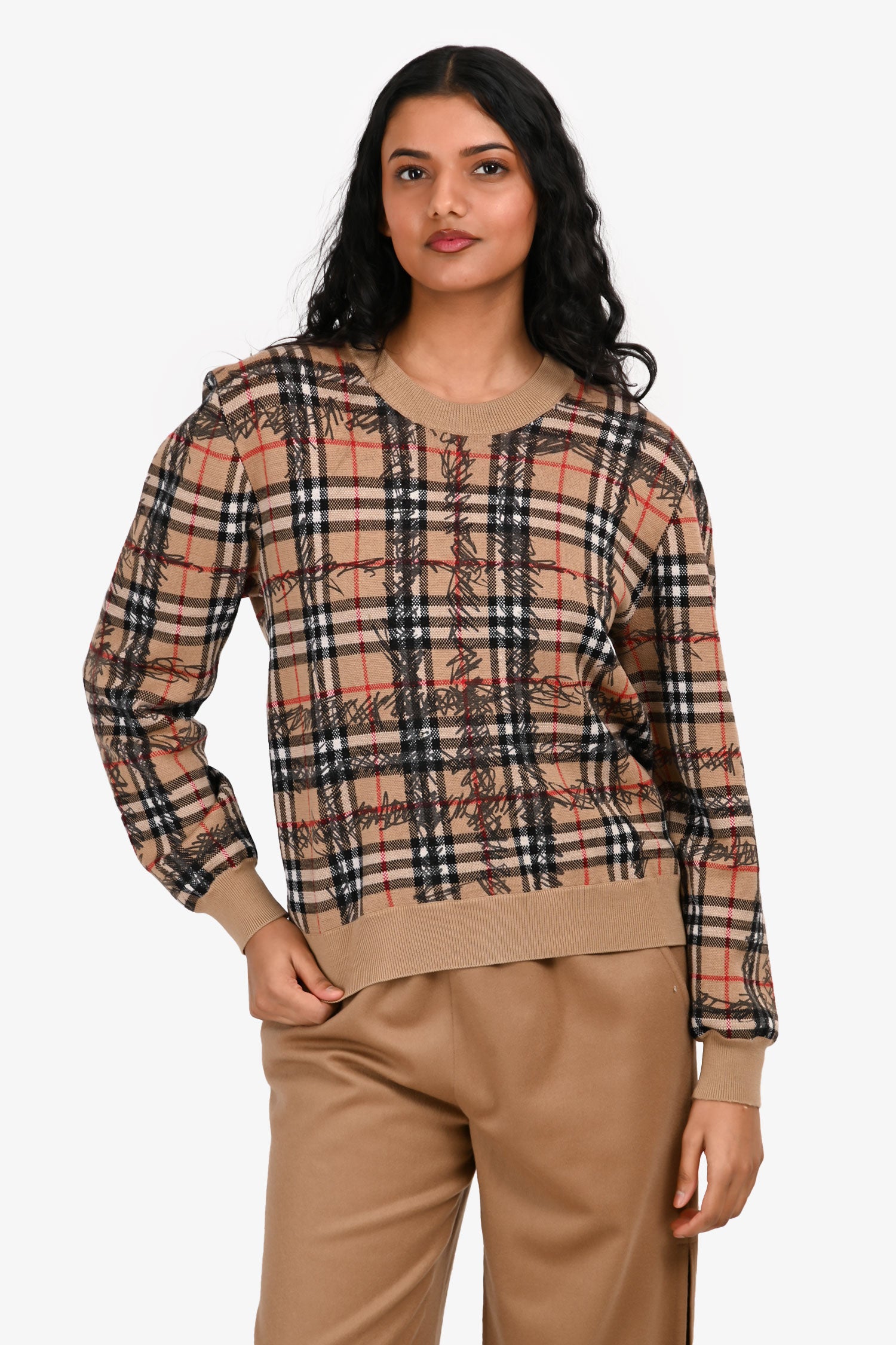 Refresh availabilityBurberry Beige Nova Check Scribble Sweater. Round neckline. Ribbed neckline, cuffs and hem. Tonal stitching.